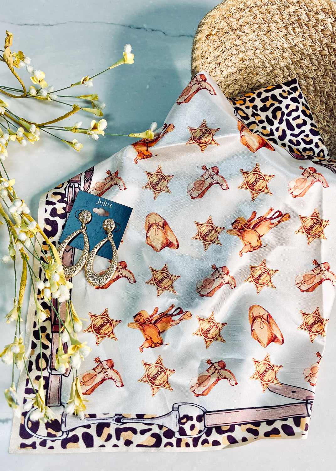 A bold western statement piece, this silky wild rag features classic cowgirl icons with a touch of leopard for extra attitude. Perfect for dressing up denim, tees, or your favorite western look.