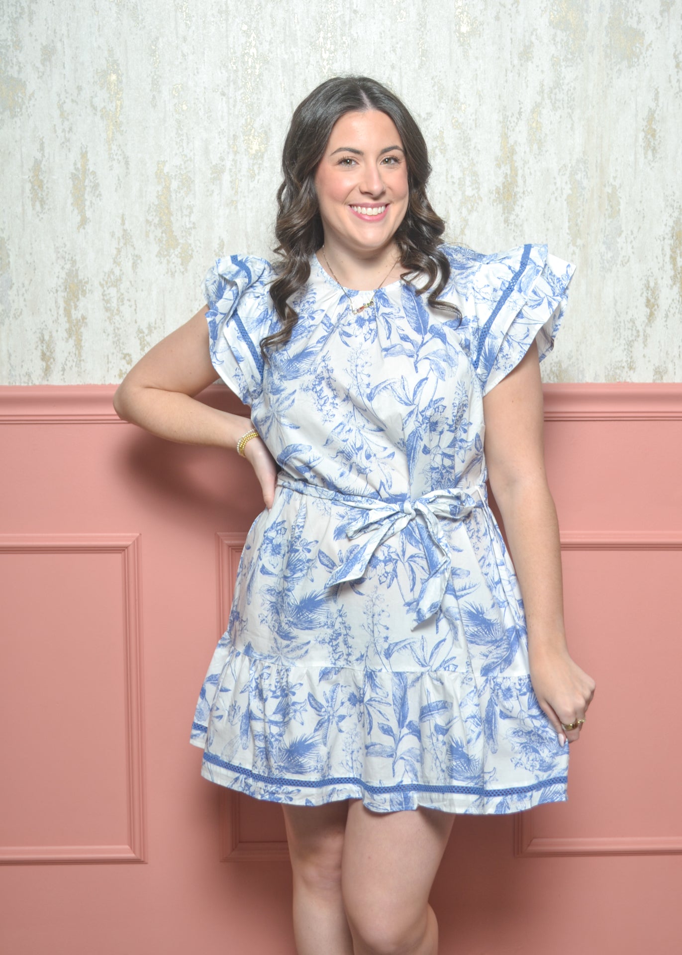 Light, airy, and effortlessly charming, this flutter-sleeve dress brings coastal elegance to everyday wear with its soft blue toile print and flattering tie waist—perfect for brunch, showers, or sunny strolls.
