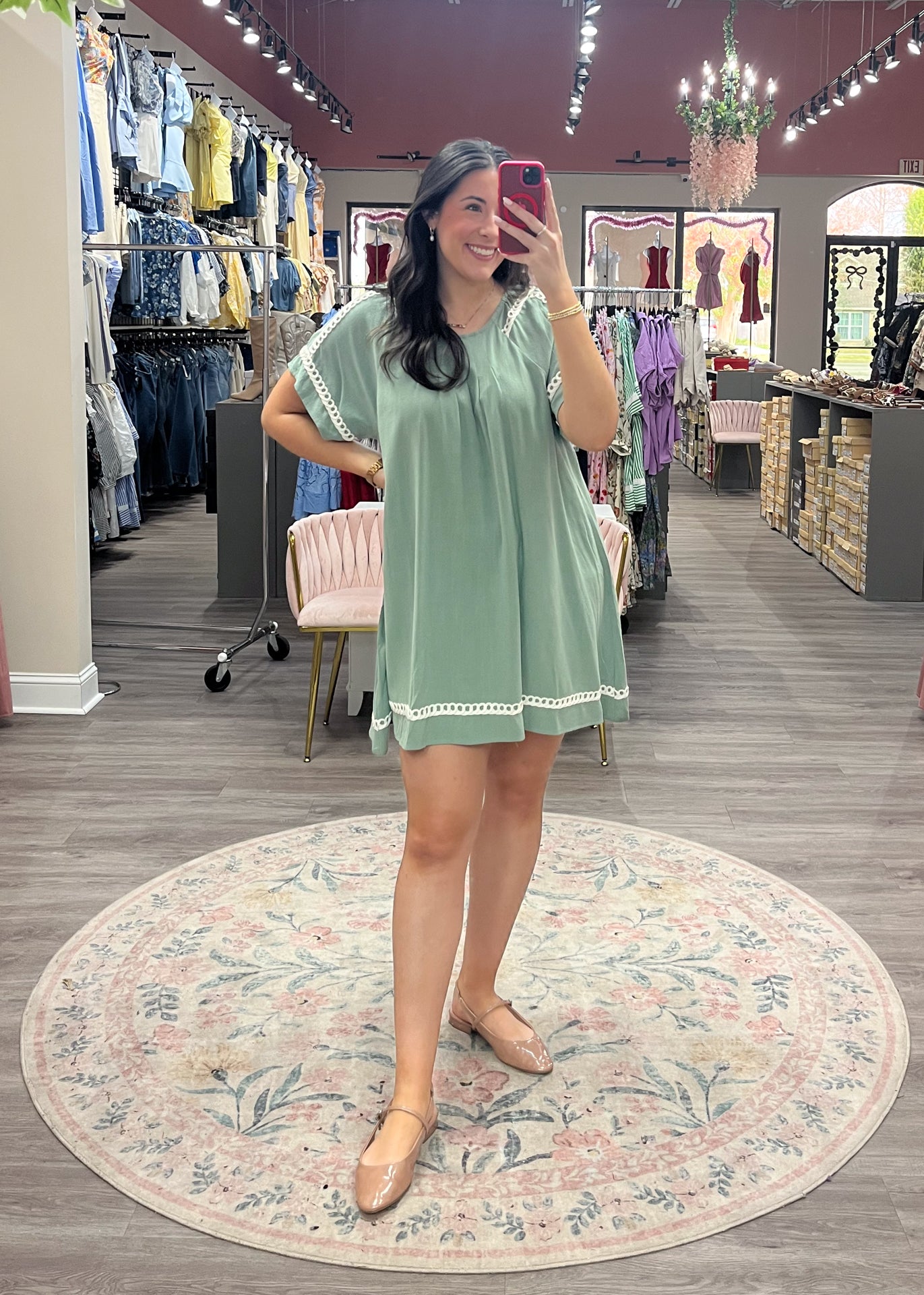 Easy, breezy, and made for sunny days, the Soft Sage Daydream Dress is one of those throw-on-and-go pieces you’ll reach for all season long. Designed with a relaxed, flowy silhouette and delicate contrast trim, this dress gives effortless charm with a polished boutique feel.