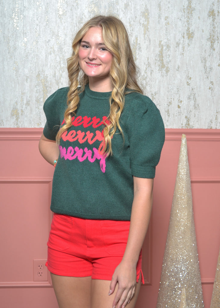 Say it three times because you mean it — merry, merry, merry! This green puff-sleeve sweater pops with pink and red script for a festive, fun, and modern twist on a holiday classic.