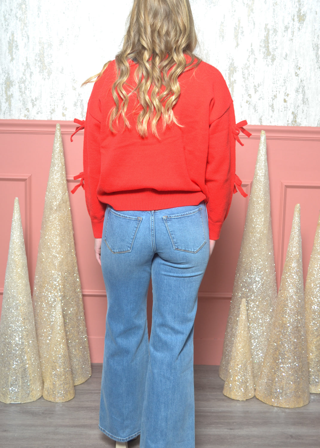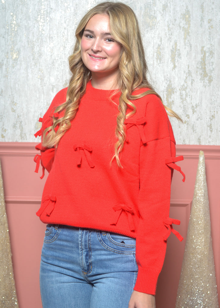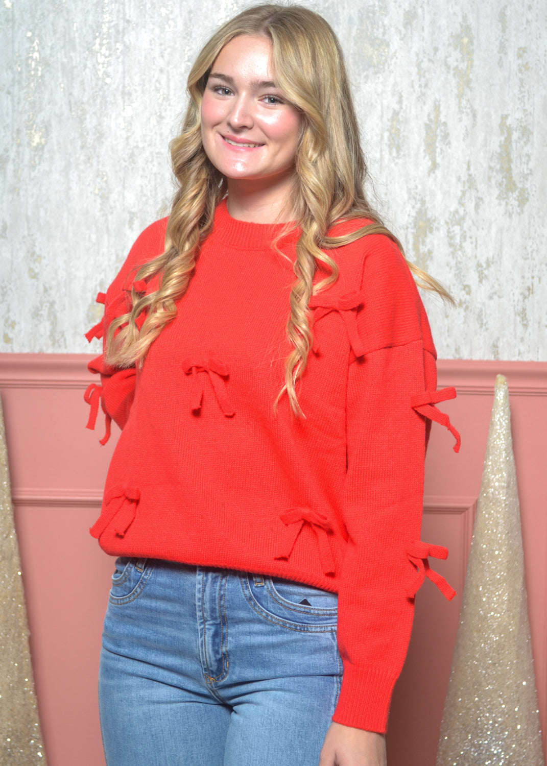 Playful yet chic — this vibrant red sweater with bow detailing adds a festive flair to any outfit! A statement piece for the holiday season or any day you want to stand out.