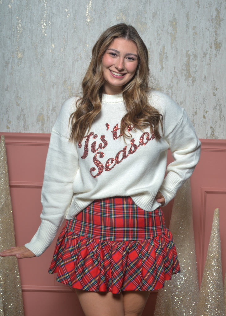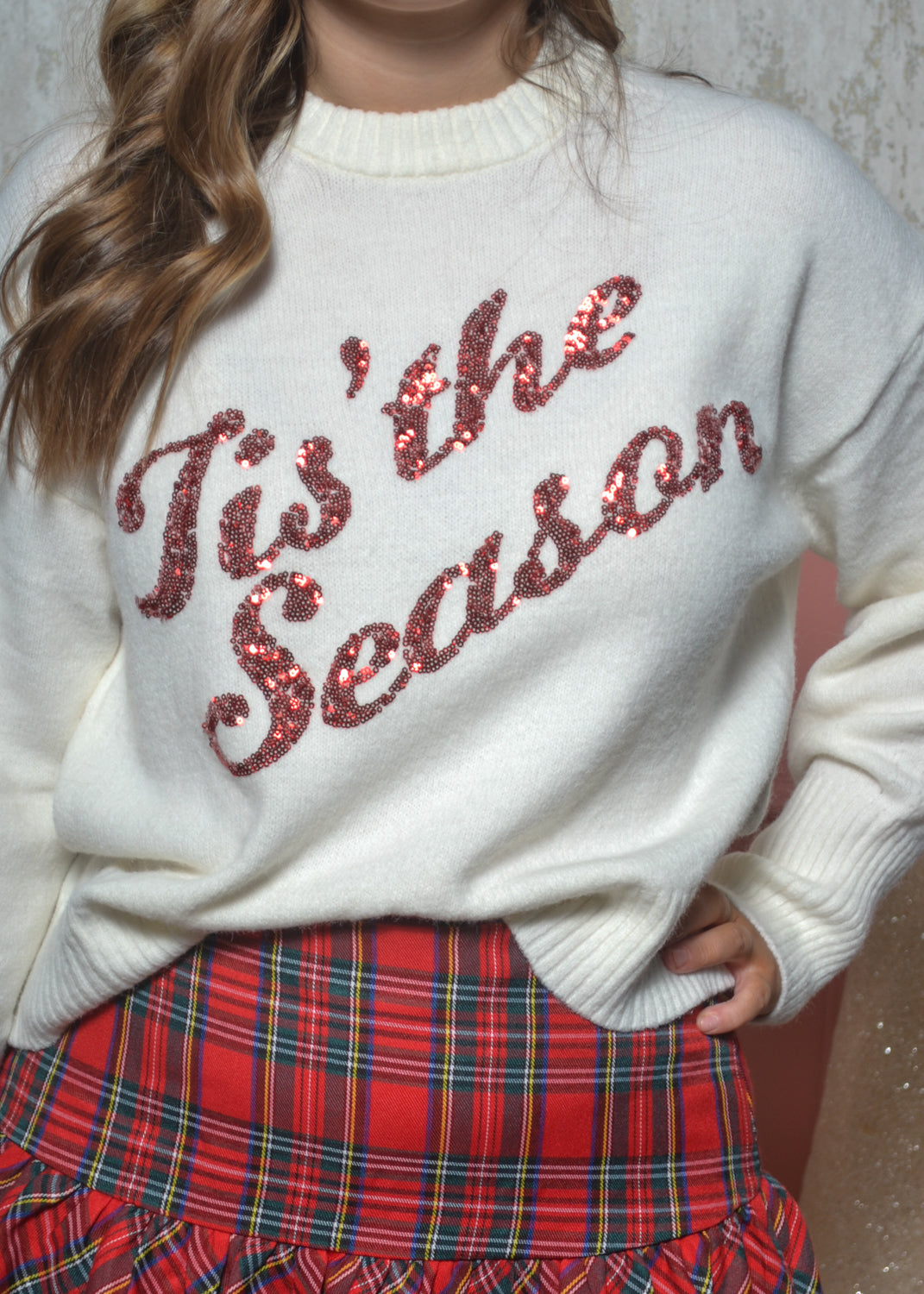 Sparkle through the season in this cream knit featuring red glitter script that says it all — ’Tis the Season! Pair it with denim or a festive skirt for instant holiday cheer.