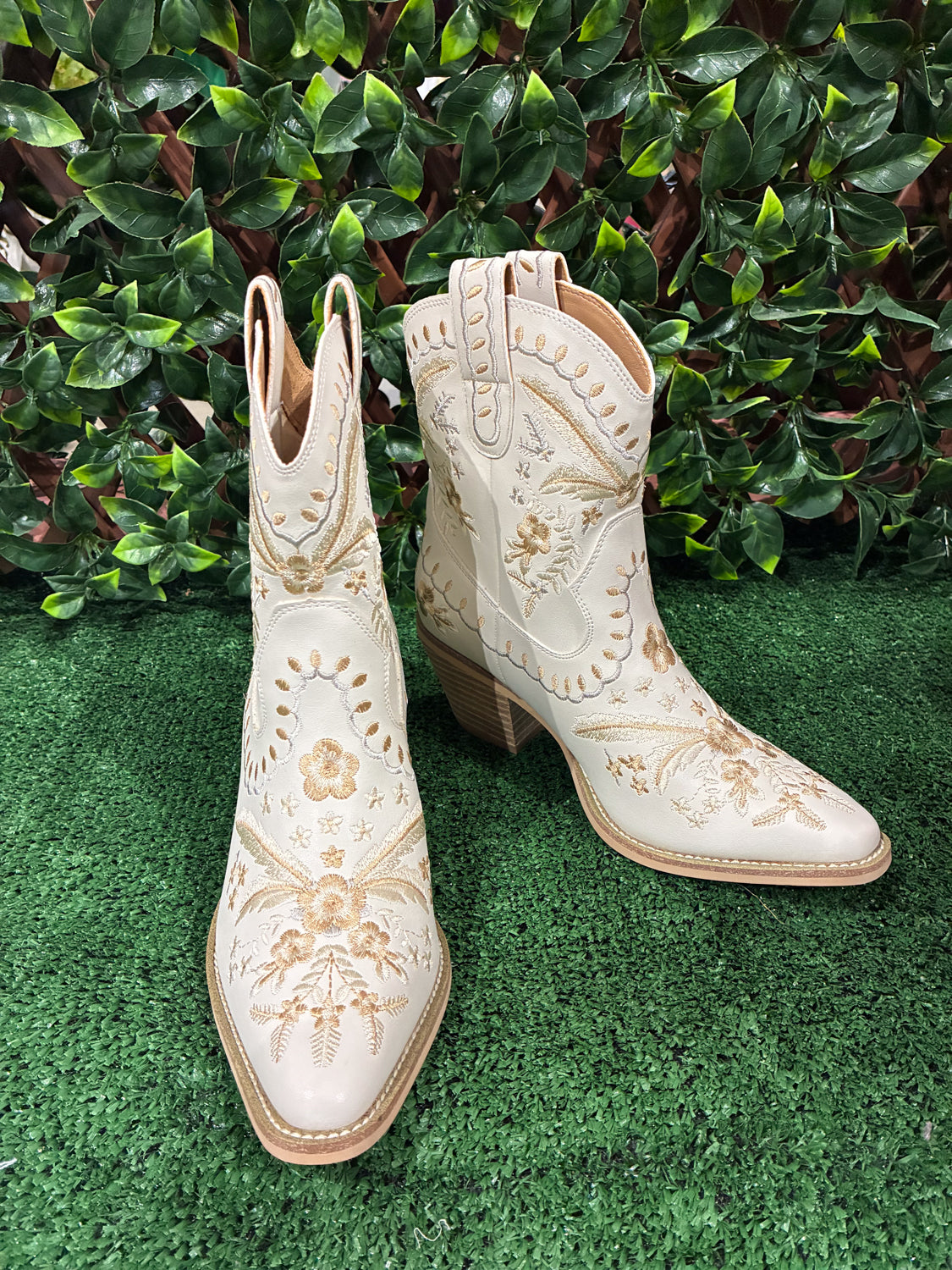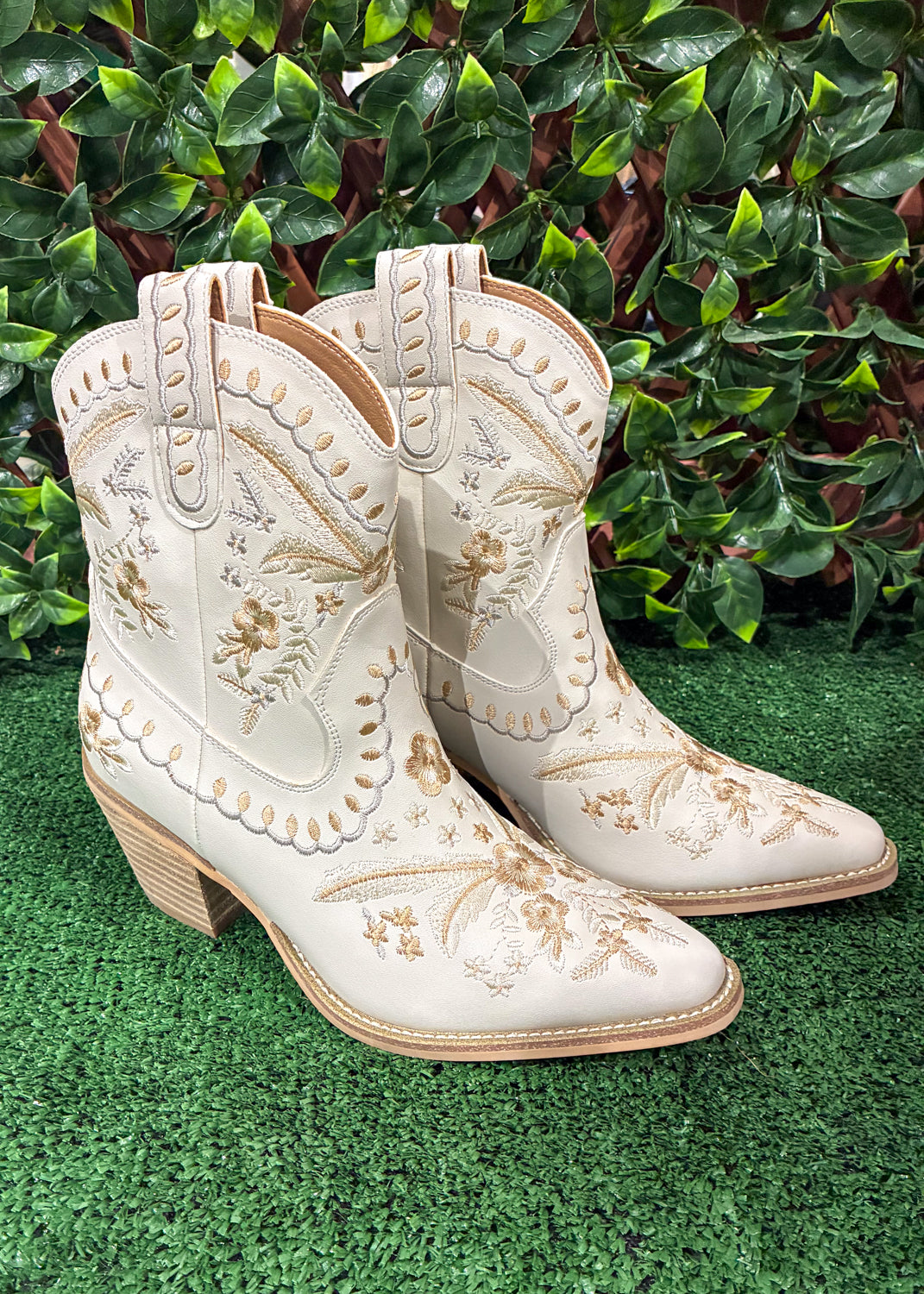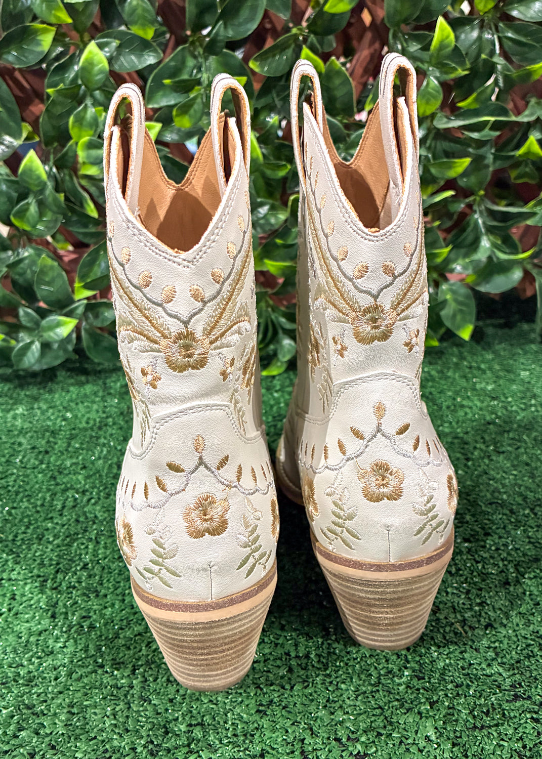 The Corral Embroidered Boot brings a touch of Western romance to every outfit. Designed in a soft cream finish with intricate gold and taupe floral embroidery, this short cowboy boot blends vintage charm with modern comfort. The stacked wooden heel gives you the perfect lift, while the pull-on tabs and pointed toe keep the look classic and flattering. Dress them up with a fall dress or style them casually with denim—either way, they steal the show.