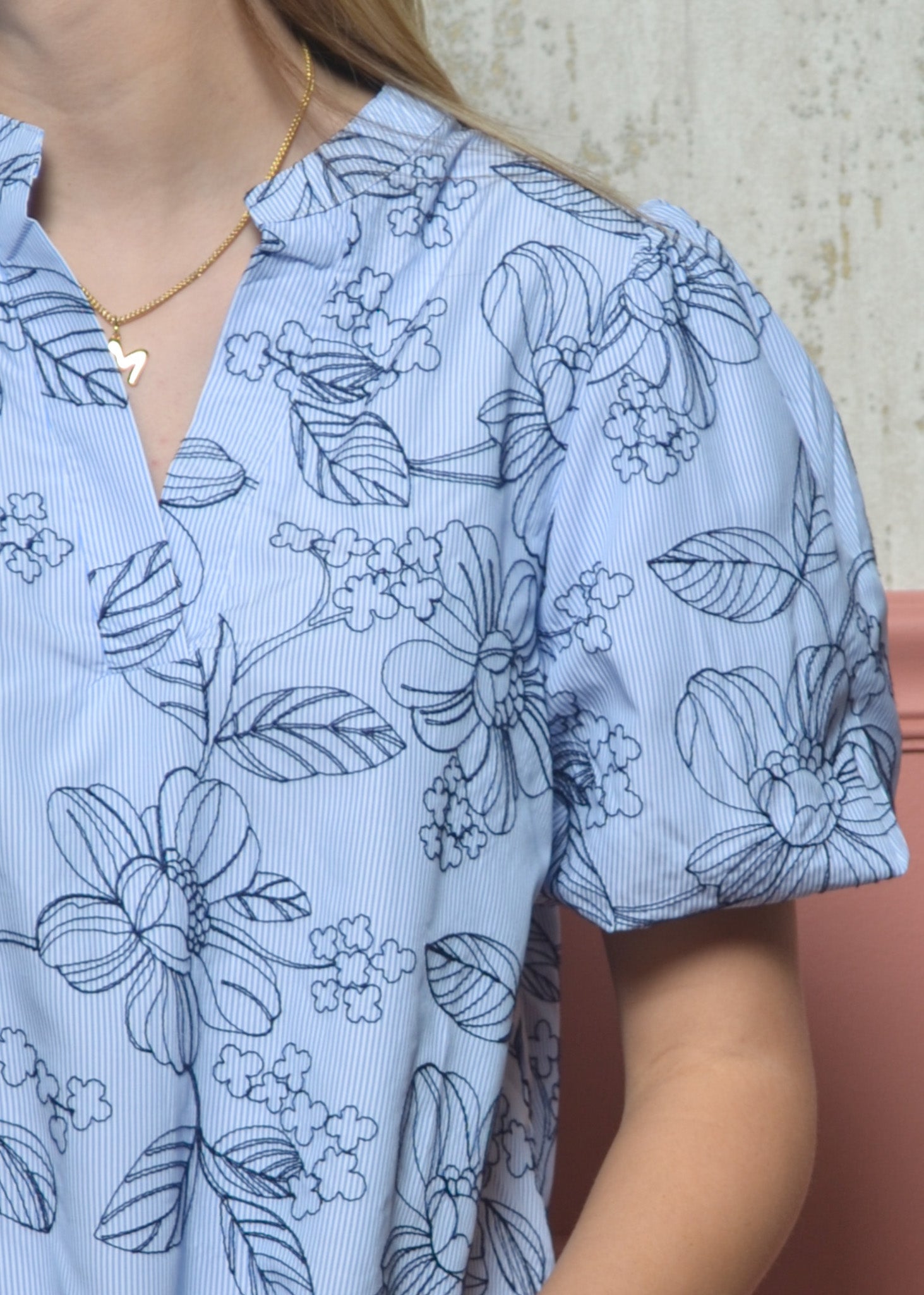 - Color: Light blue with navy sketch floral print
