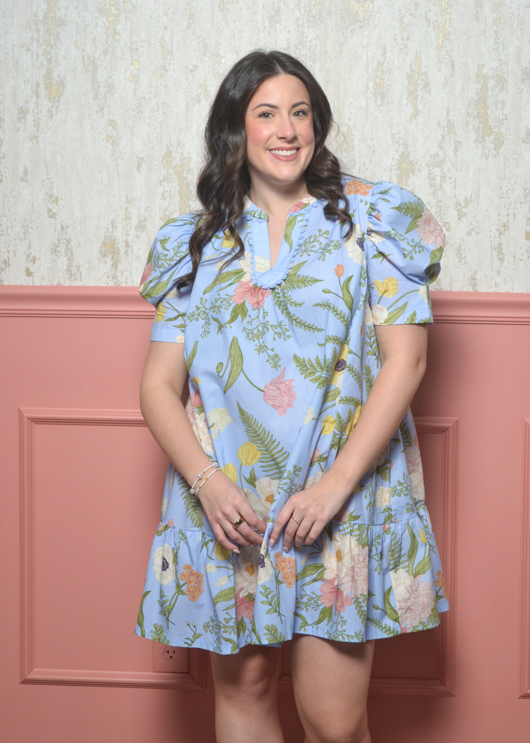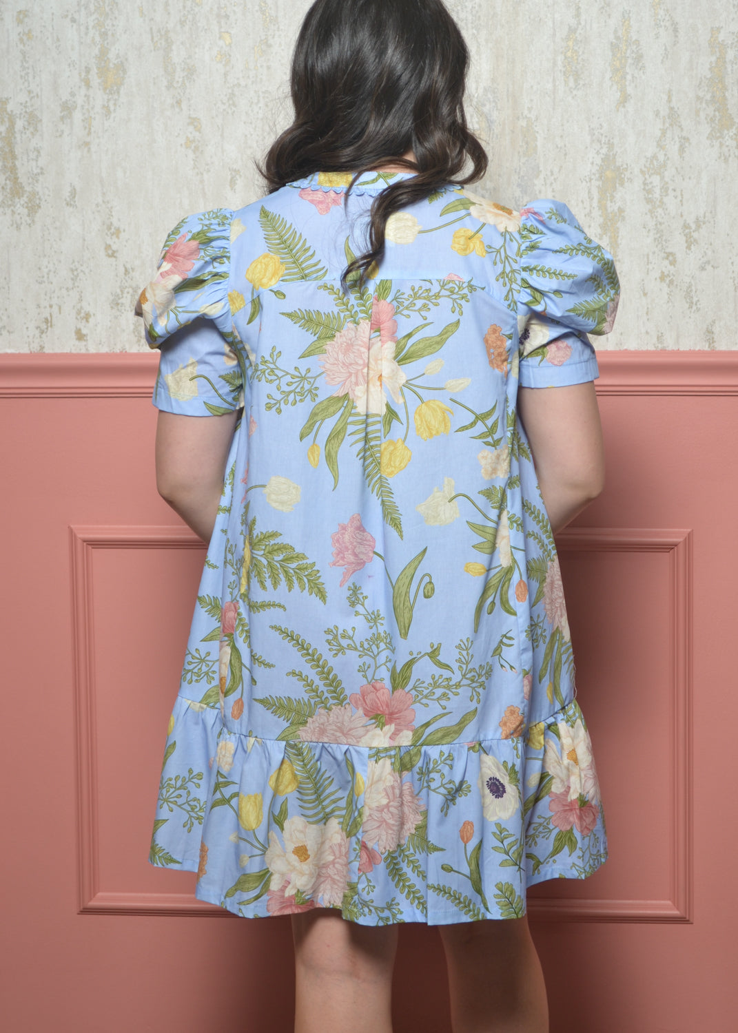 Fresh, feminine, and effortlessly flattering, this floral swing dress is made for sunny days and easy styling. Featuring a soft blue base with a delicate botanical print, puff sleeves, and a relaxed fit, it’s a go-to for brunch, showers, or everyday spring wear.