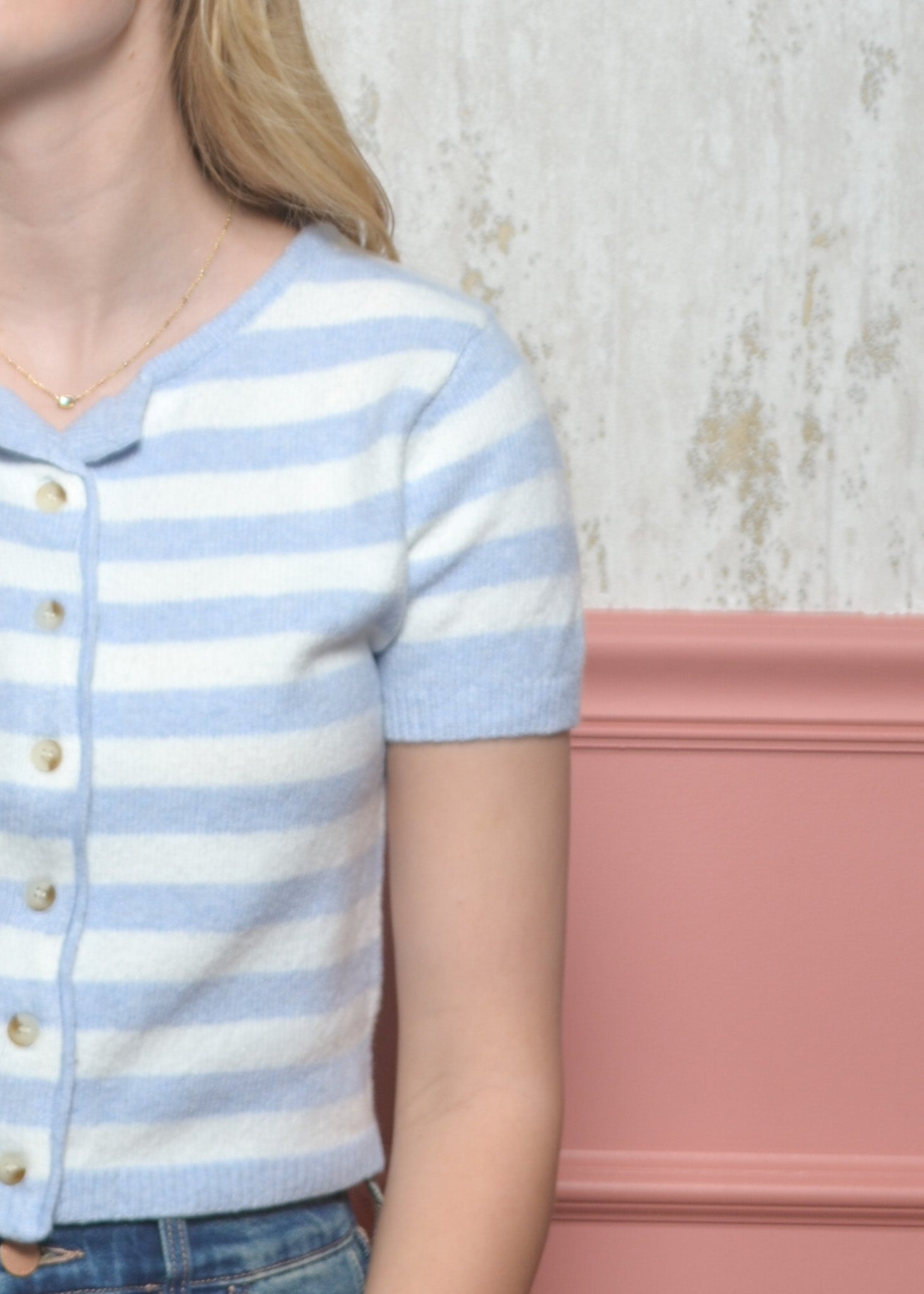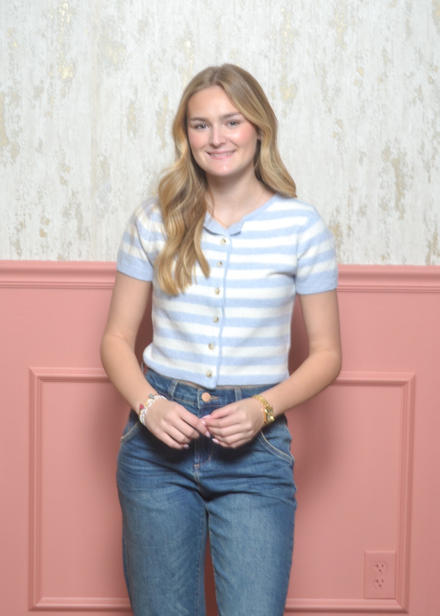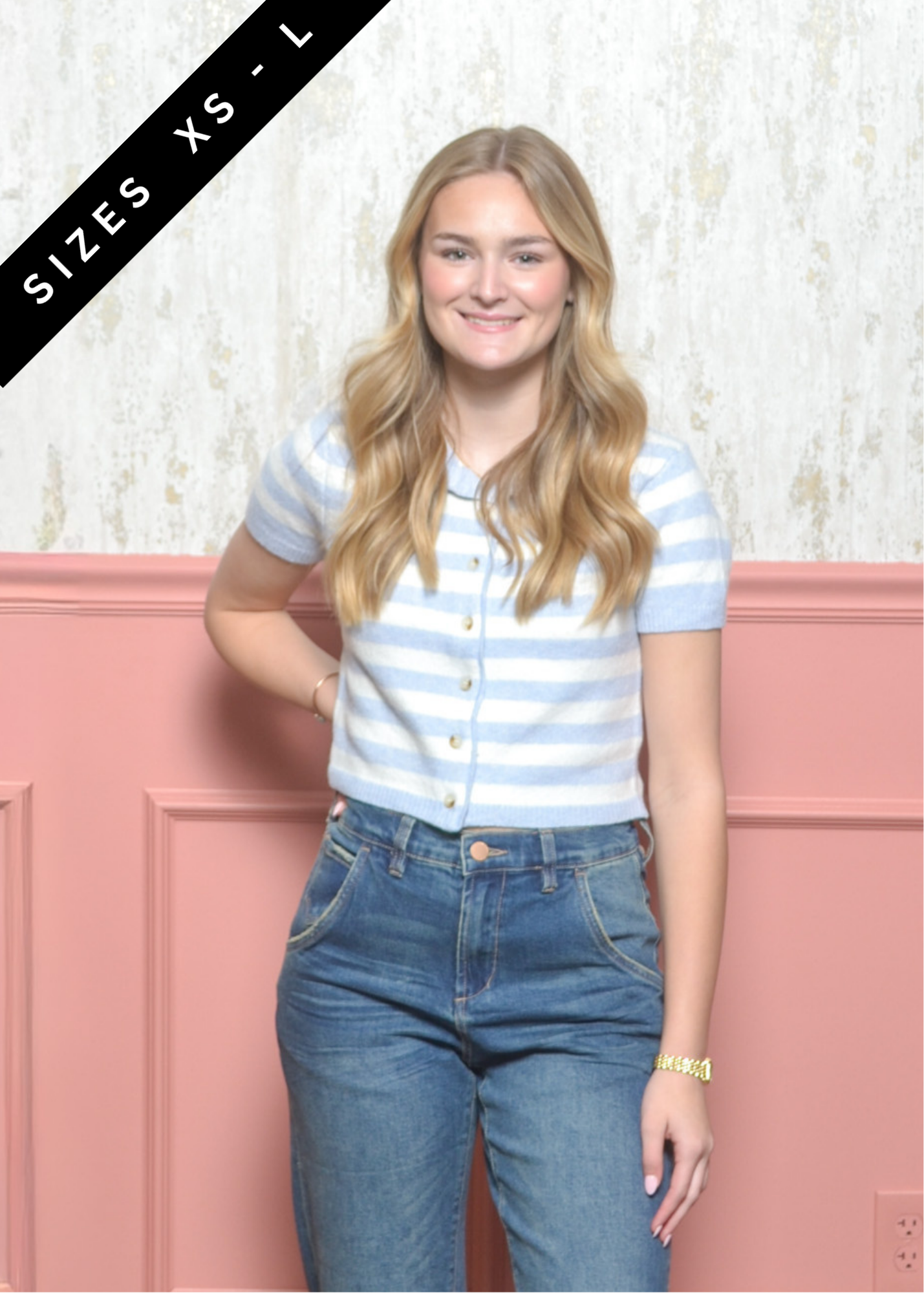 Easy, classic, and ready for the season ahead, the Fresh Start Stripe Sweater is the kind of piece you’ll reach for again and again. With soft blue and ivory stripes and a lightweight knit feel, it’s perfect for everyday spring styling.
