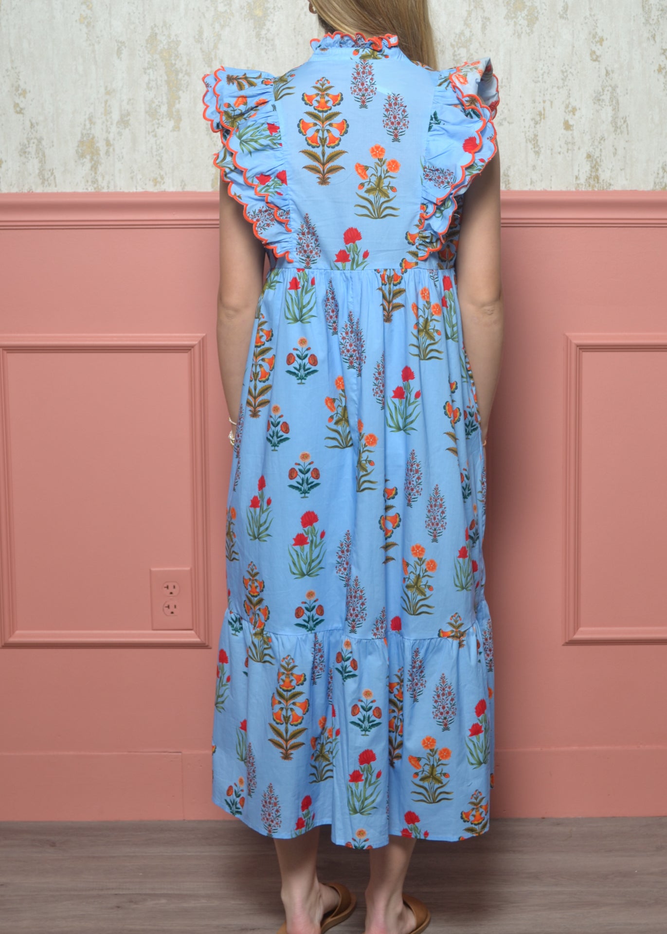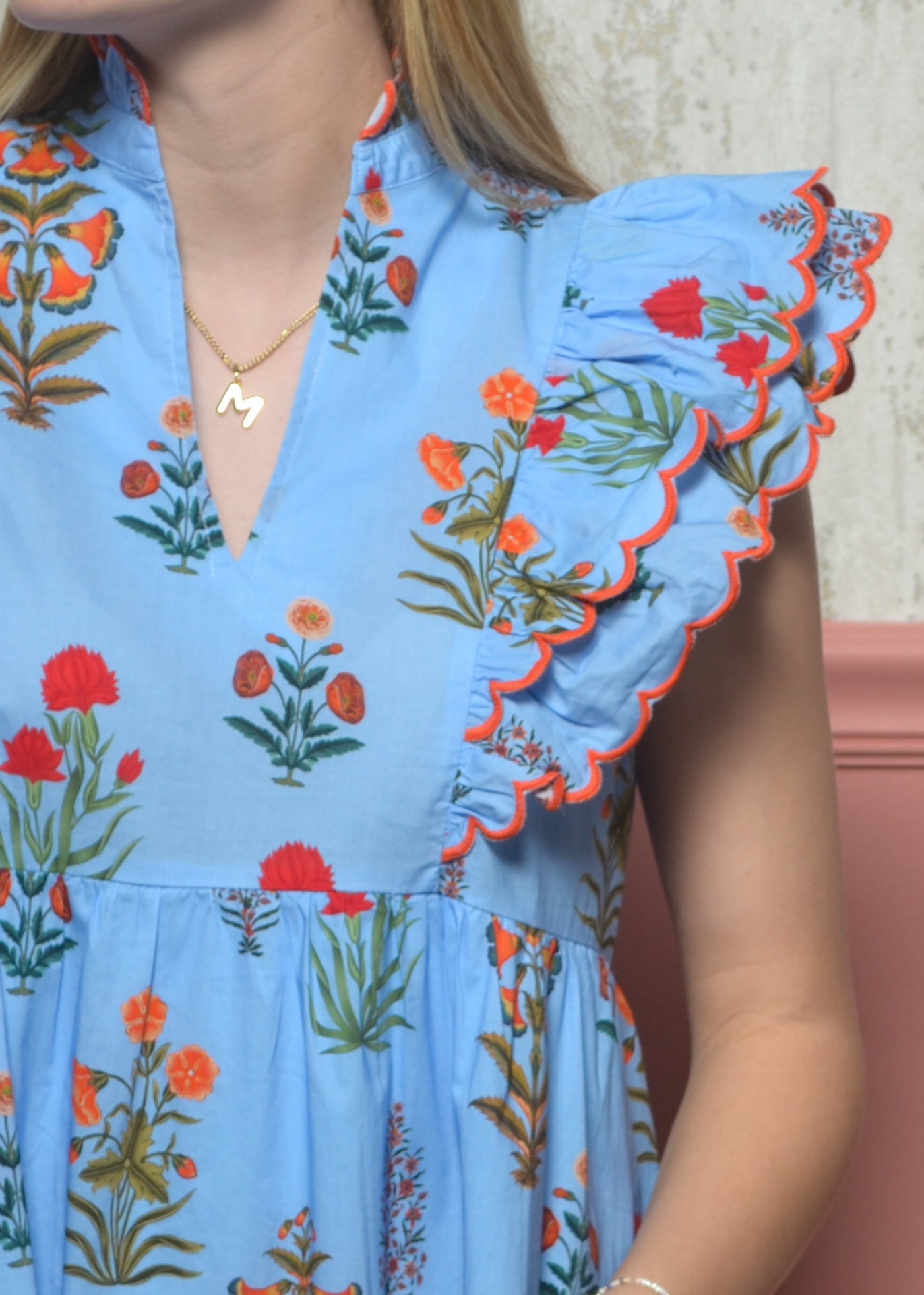 - Sleeves: Flutter sleeves with scalloped trim