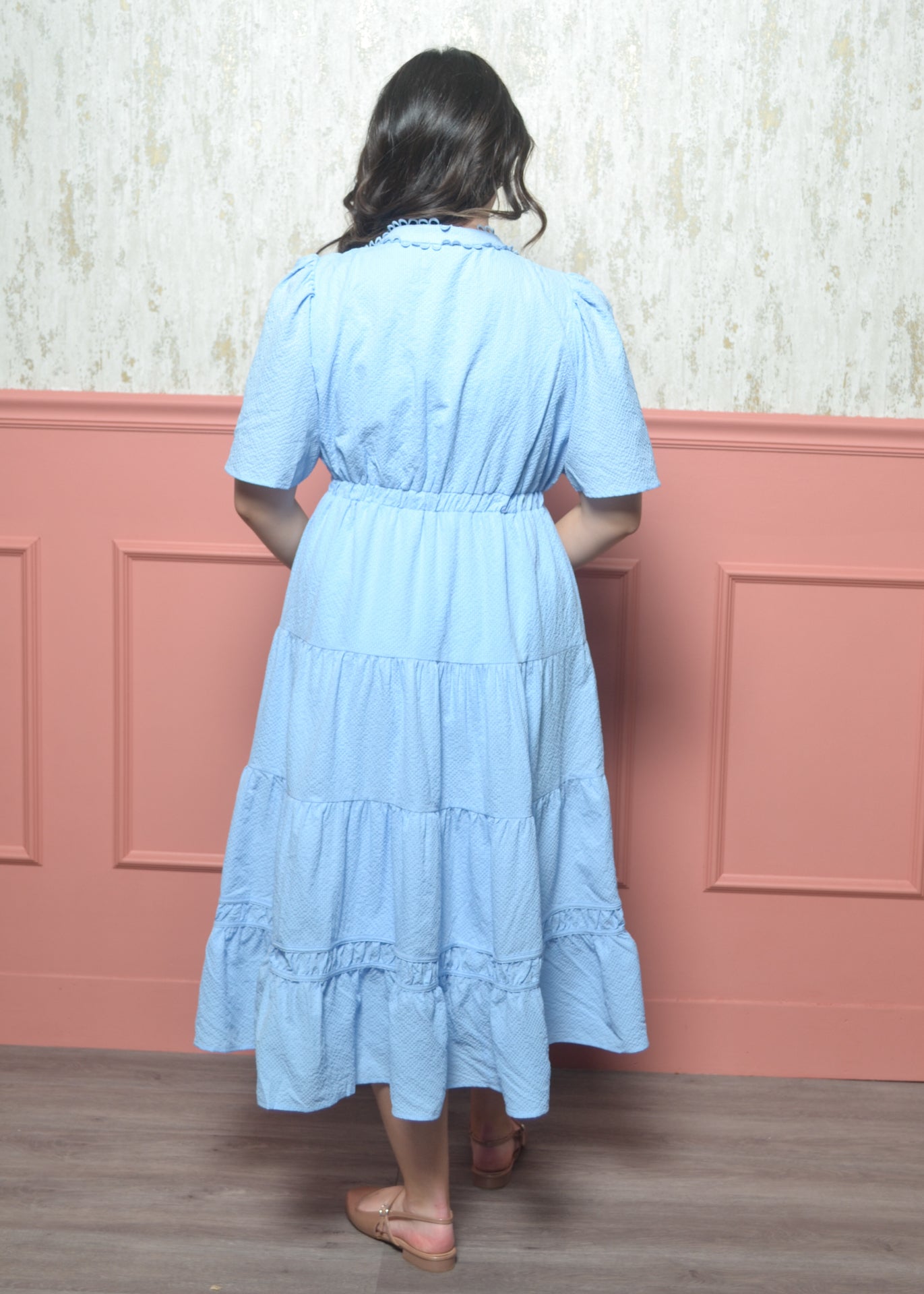 Light, airy, and effortlessly flattering, this soft blue midi dress is made for spring days and easy occasions. With delicate trim details and a flowy tiered skirt, it’s the kind of piece you’ll reach for again and again.