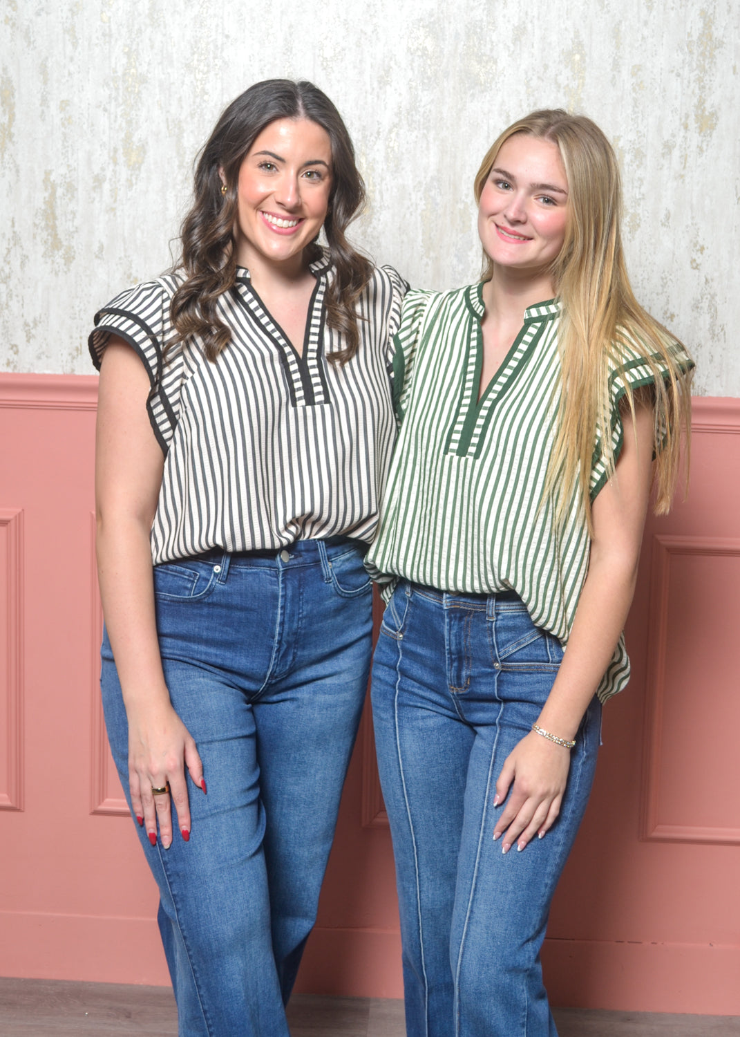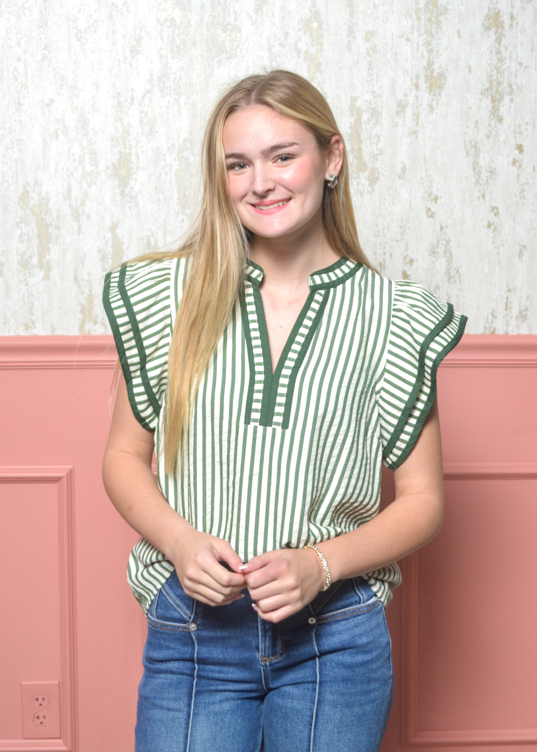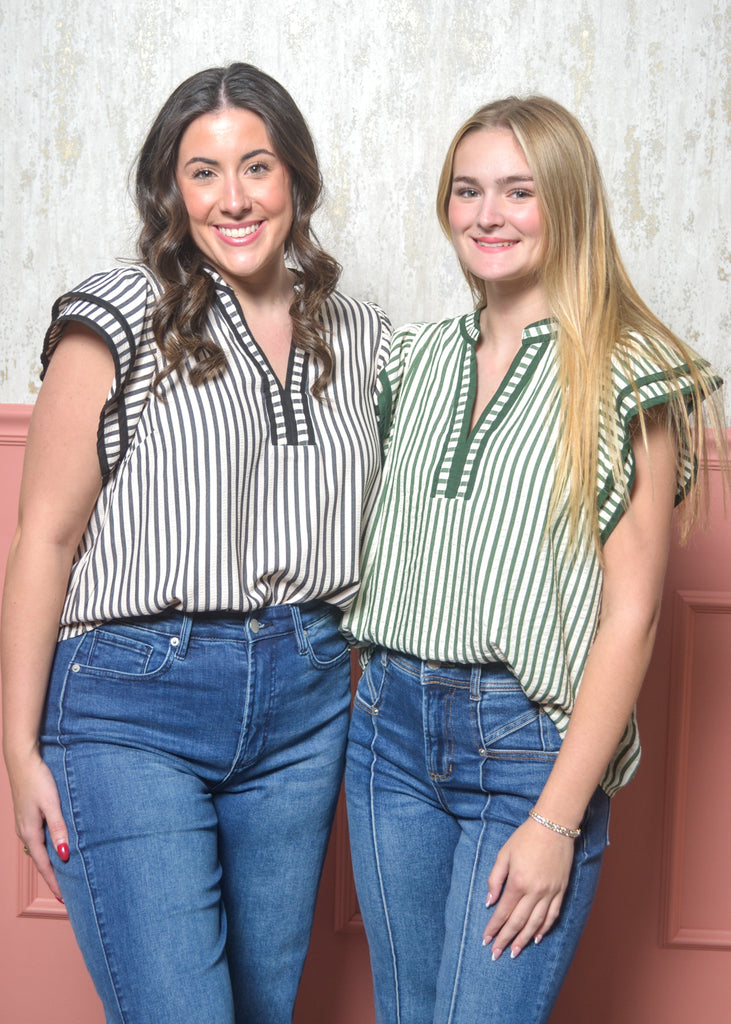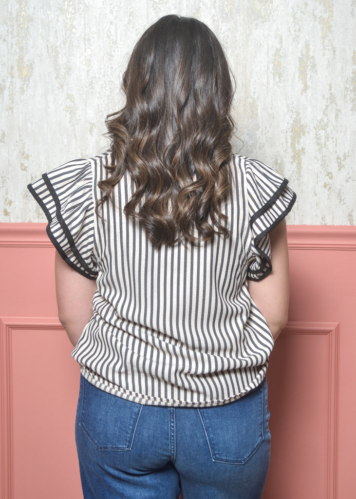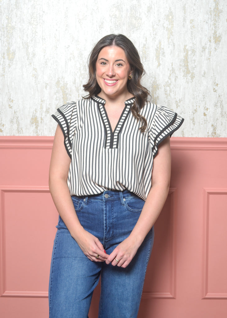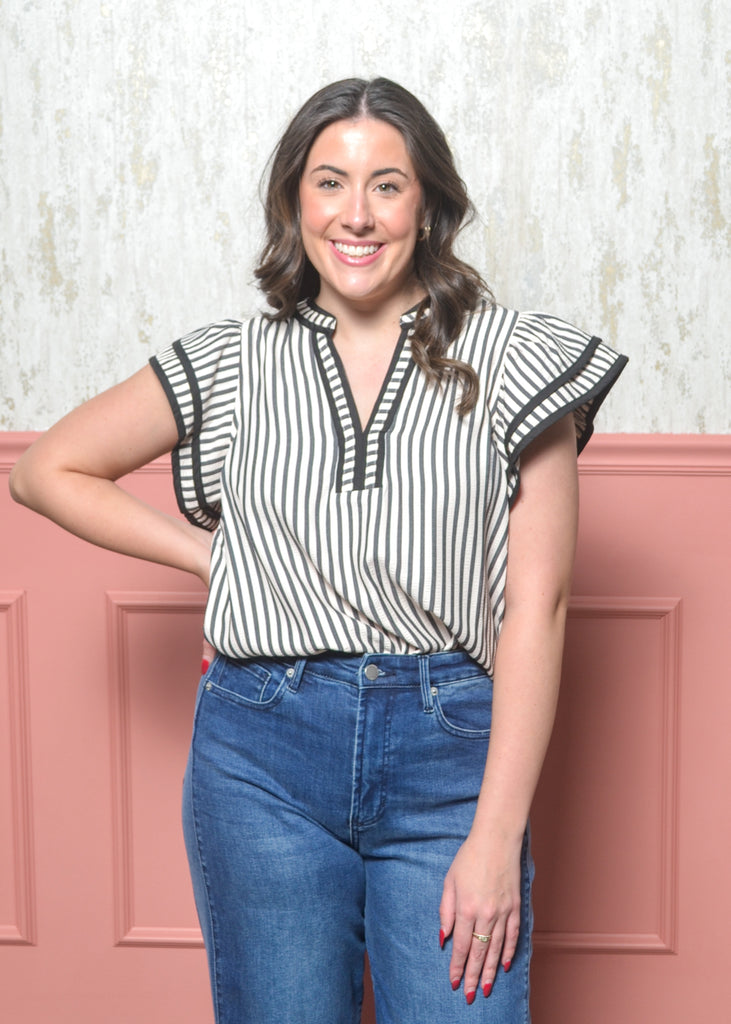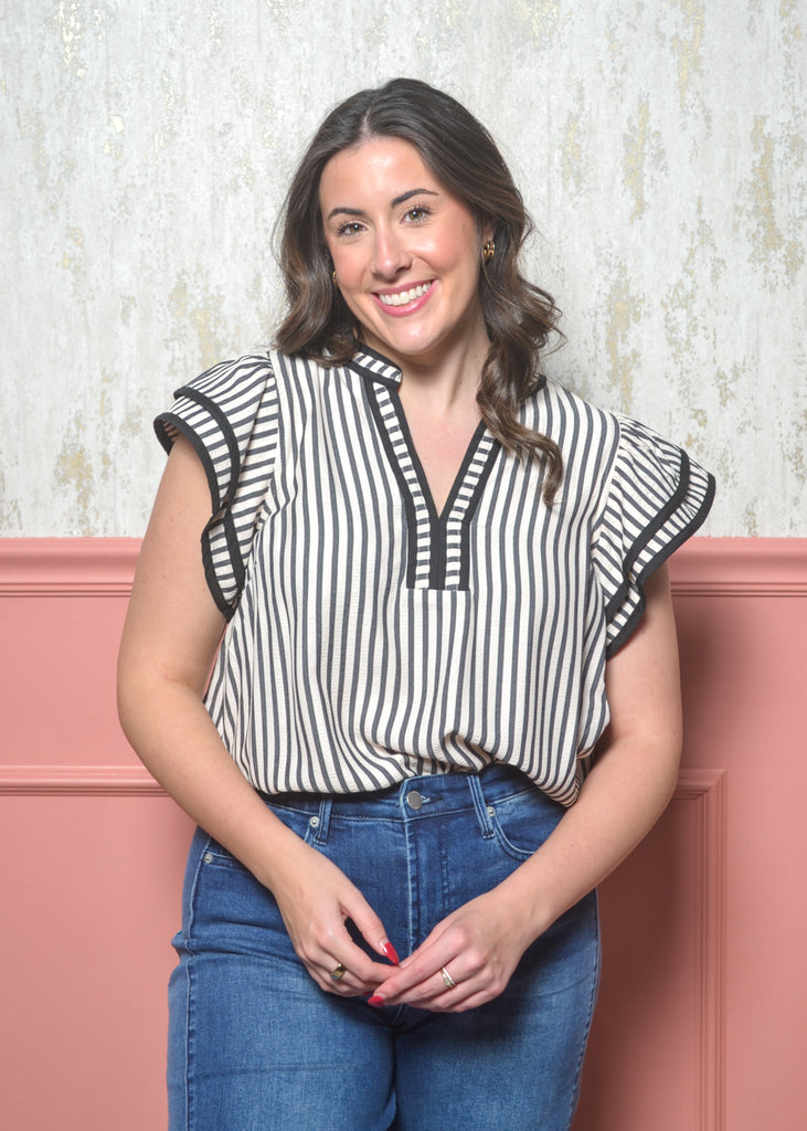 Chic, classic, and full of charm — The Refined Ruffle Top from our Classic Lines Collection is the perfect blend of timeless style and everyday ease. This striped blouse features a flattering split neckline with contrast trim, soft flutter sleeves, and a relaxed fit that tucks effortlessly into jeans or trousers.
