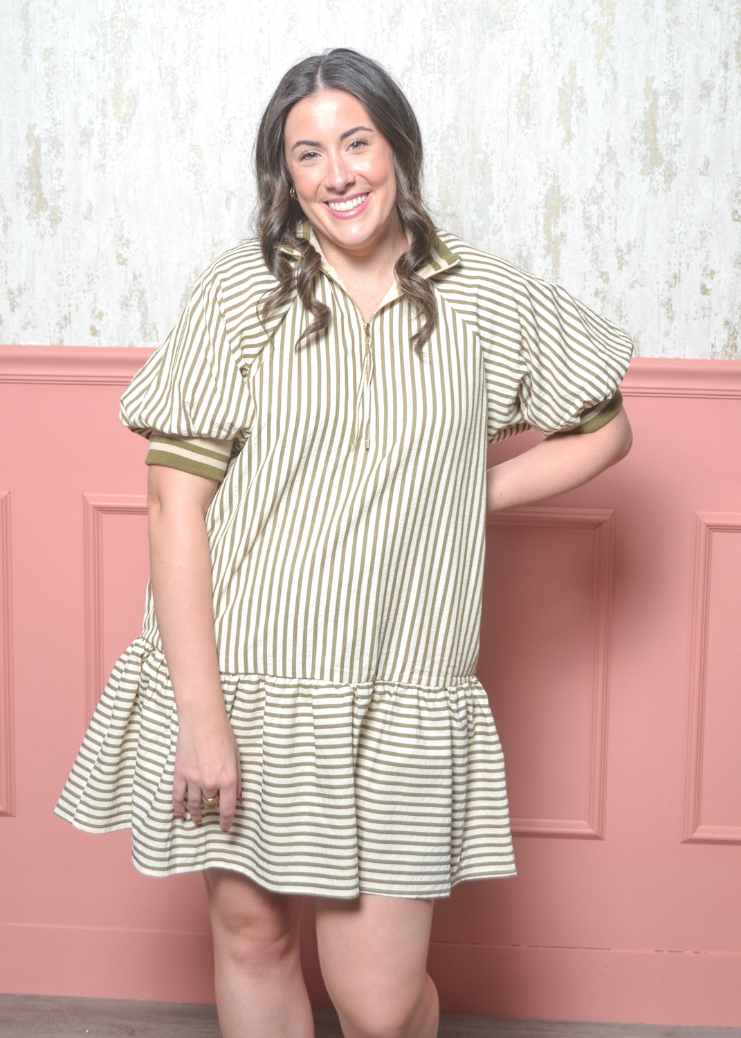 Bring a playful twist to classic style with The Stripe Story Dress — part of our Classic Lines Collection. This striped mini dress features a relaxed drop-waist silhouette, short puff sleeves with contrast cuffs, and a partial zip neckline for a modern touch. Its easy, lightweight fabric makes it perfect for all-day comfort and effortless style.