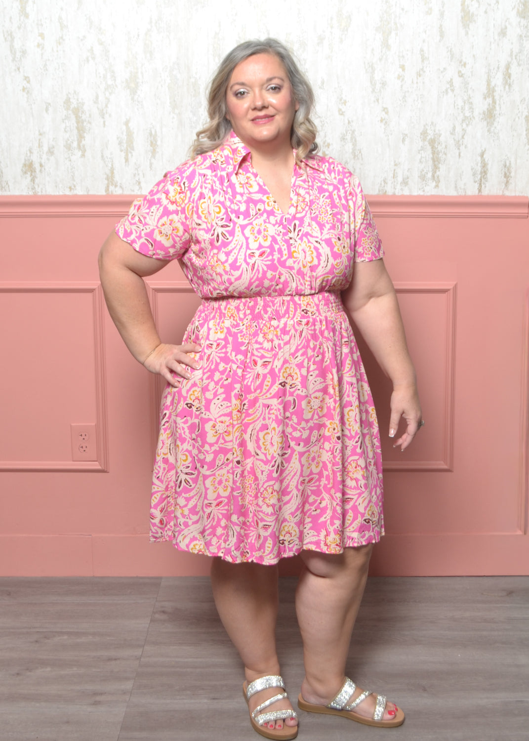 Sweet and flattering with a playful pop of pink, this floral dress features a smocked waist and soft collar neckline for an easy, polished look. Perfect for brunch dates, showers, or everyday spring styling.