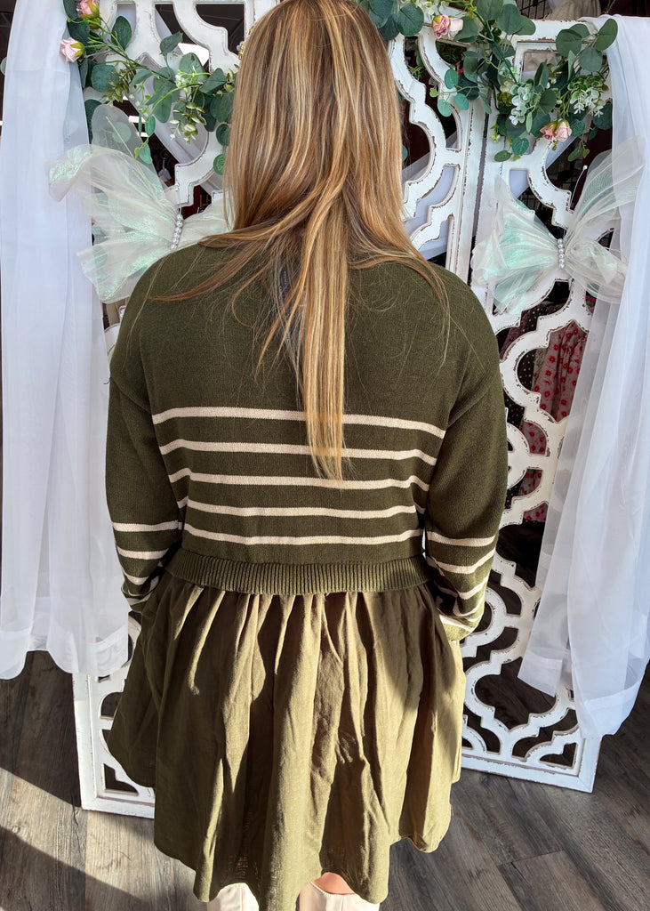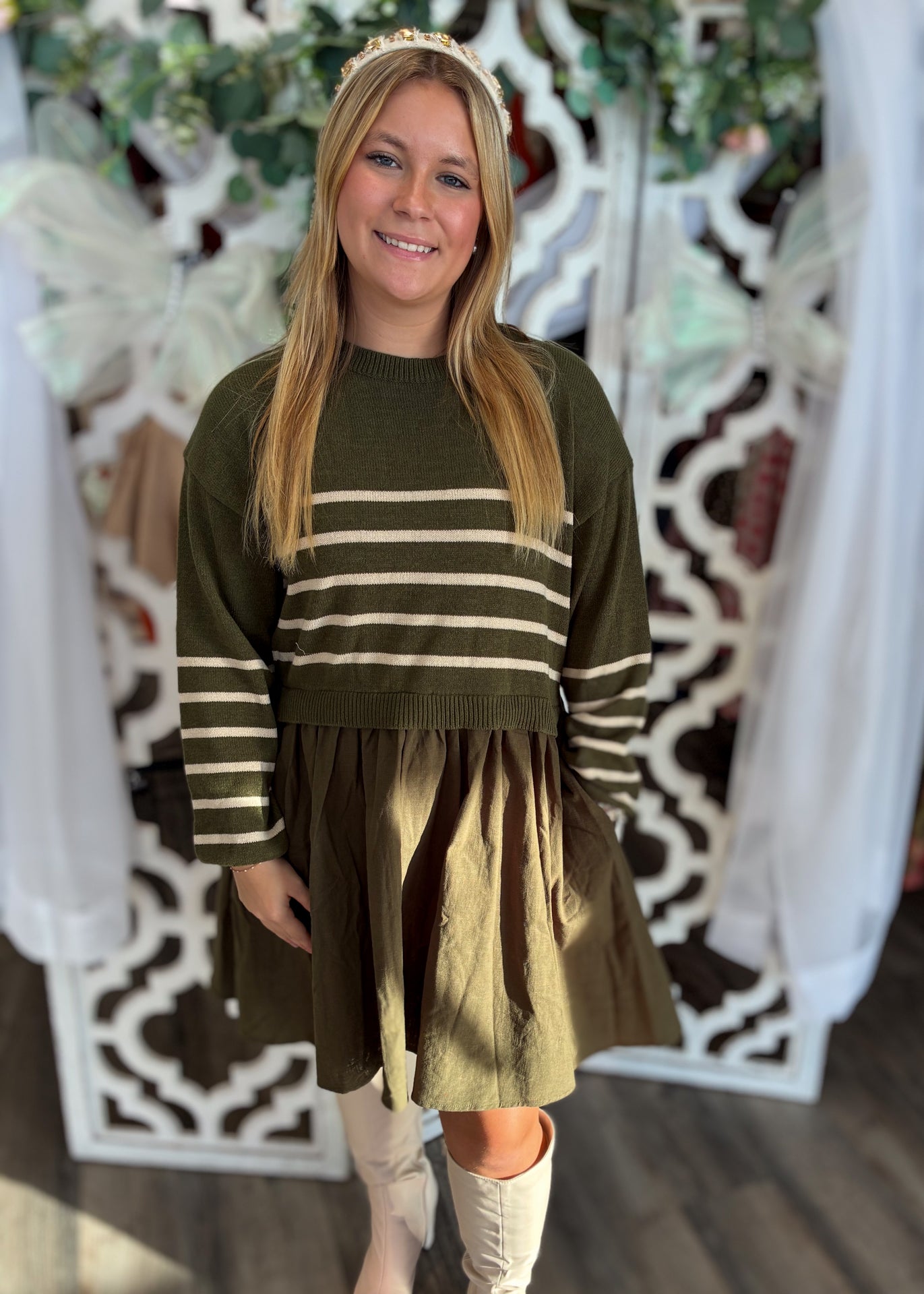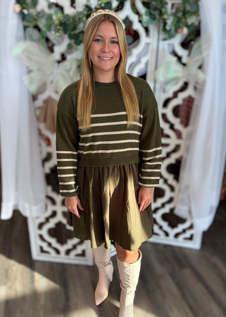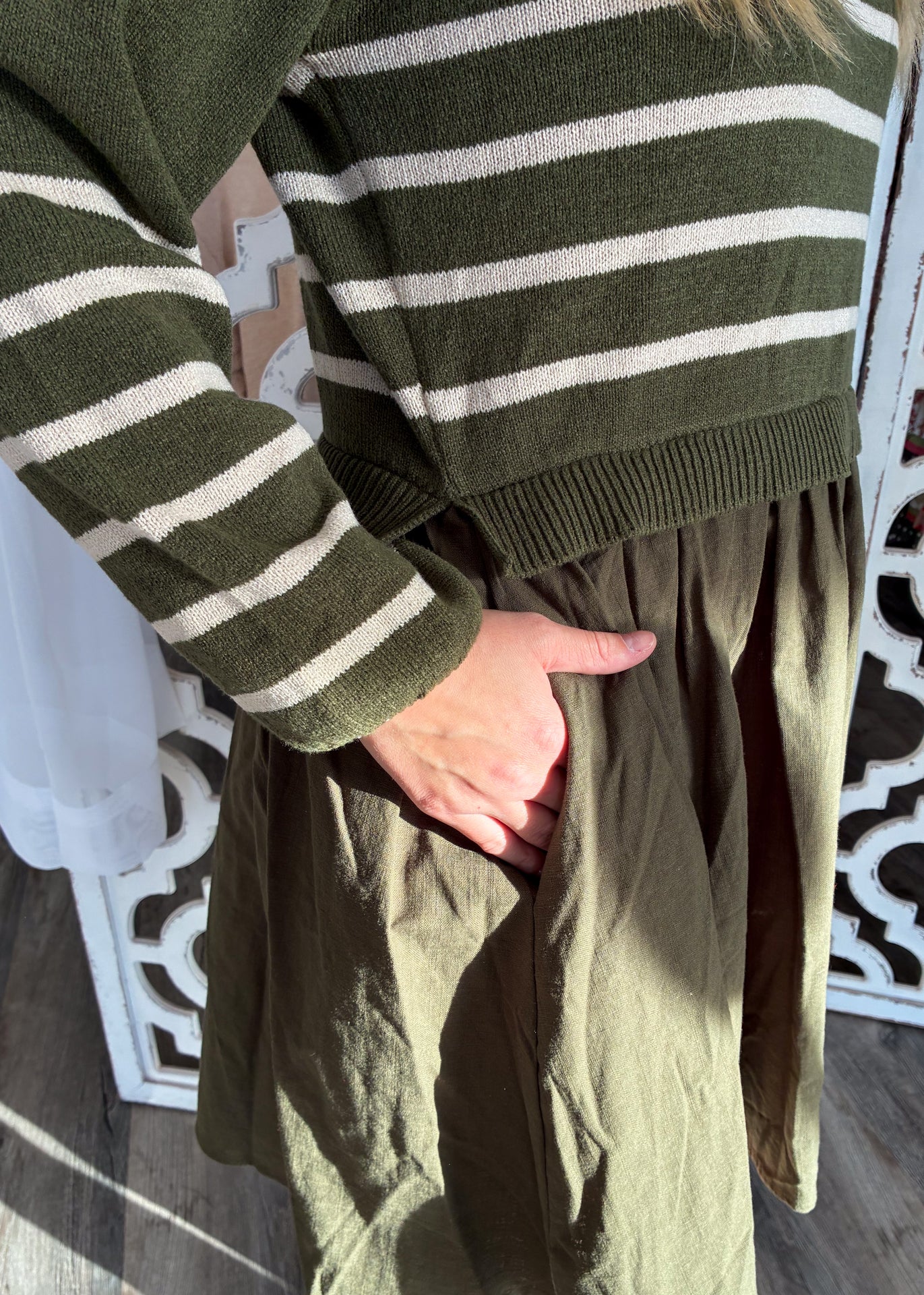 The Olive Stripe Sweater Dress is the perfect blend of cozy and cute. This two-tone style pairs a soft olive striped sweater top with a flowy, gathered skirt in a matching shade for a layered look—without any of the bulk. The relaxed sweater knit meets an easy, lightweight skirt, giving you an effortlessly styled outfit in one piece. Finished with pockets and a comfortable fit, it’s an ideal throw-on dress for fall days, casual outings, and holiday gatherings.
