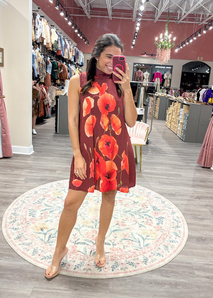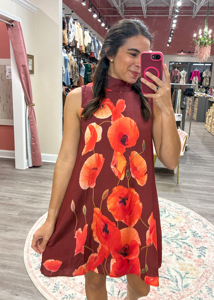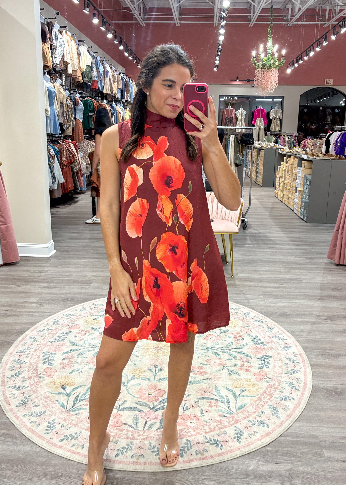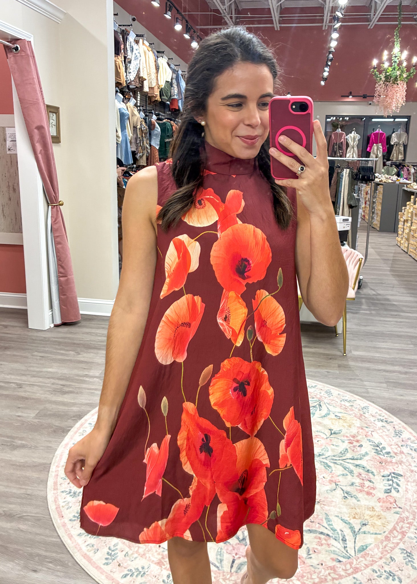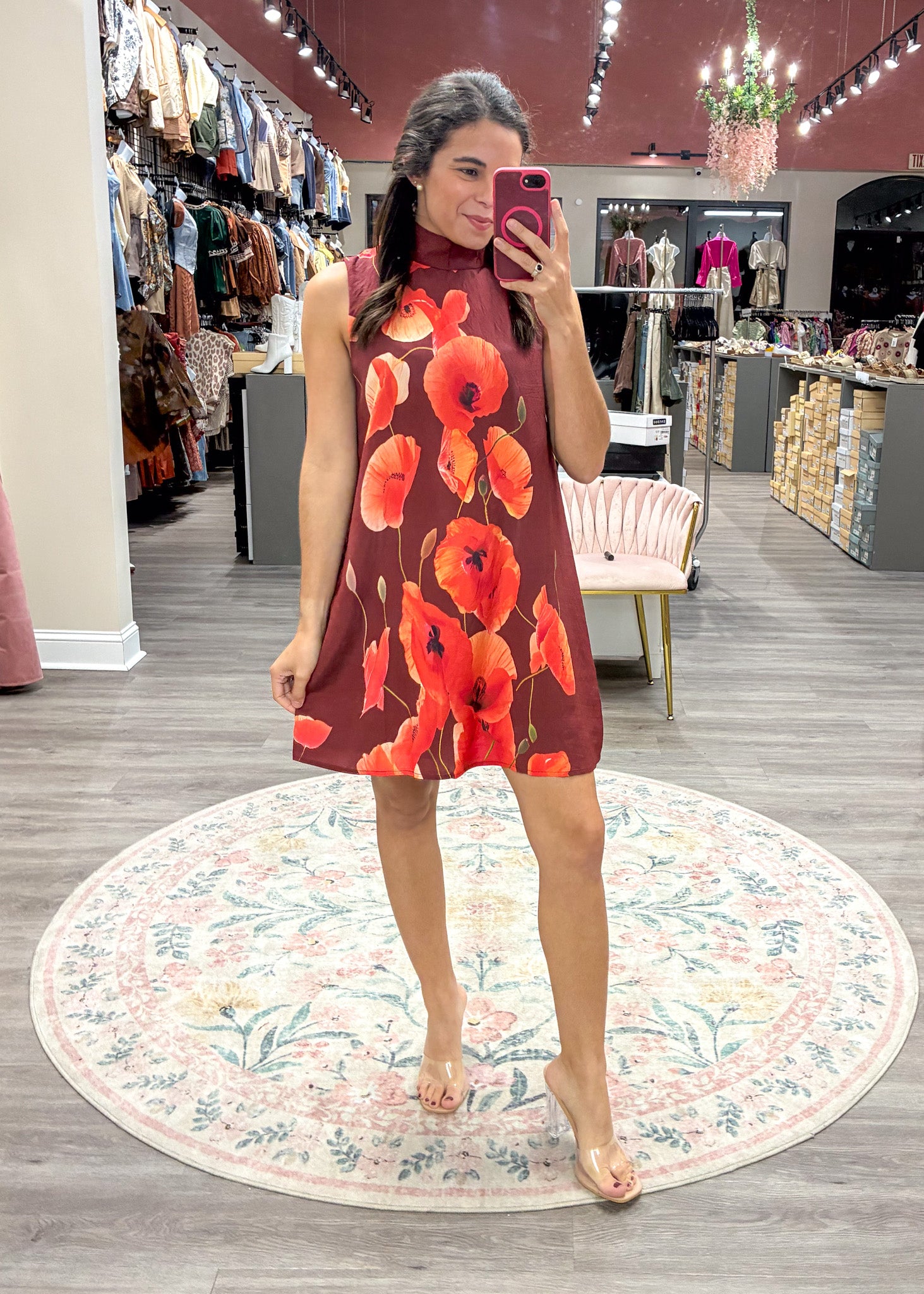 Bold, bright, and beautifully effortless — the Scarlet Bloom Dress brings a statement to every season. This sleeveless, high-neck A-line dress features a stunning red floral print that pops against a deep wine background. Lightweight and fully lined, it’s perfect for holiday parties, fall weddings, or dinner dates.