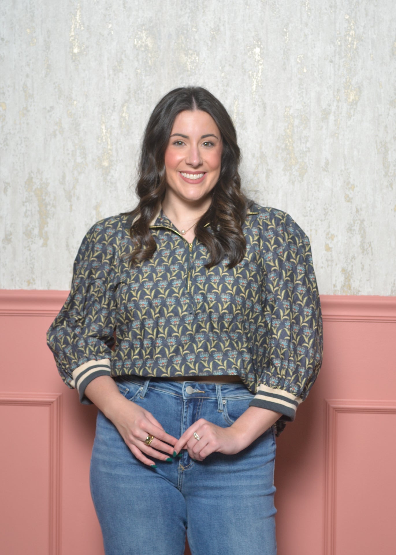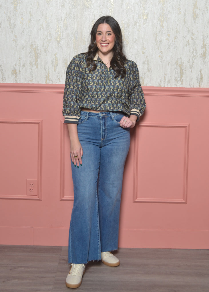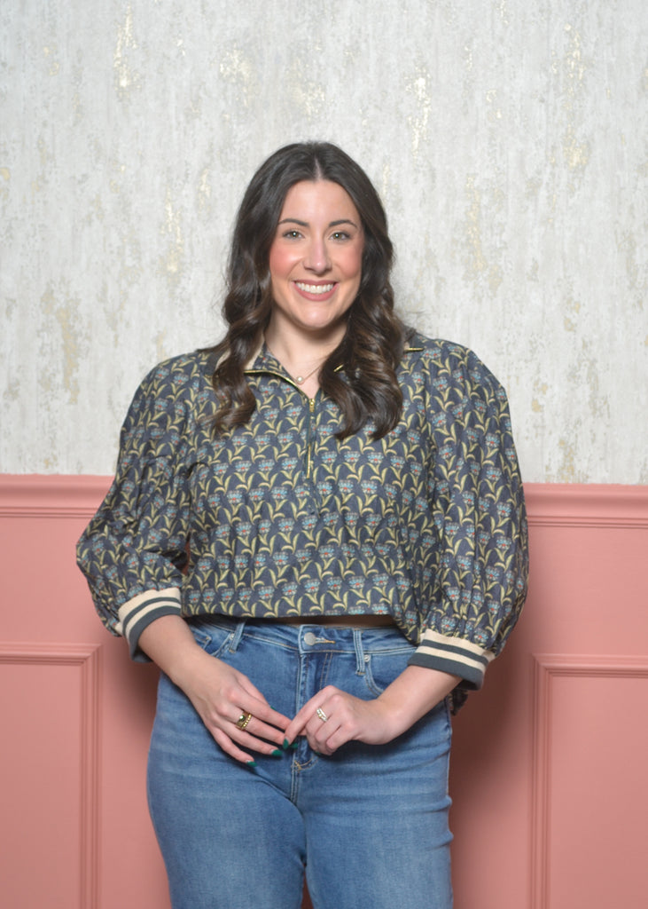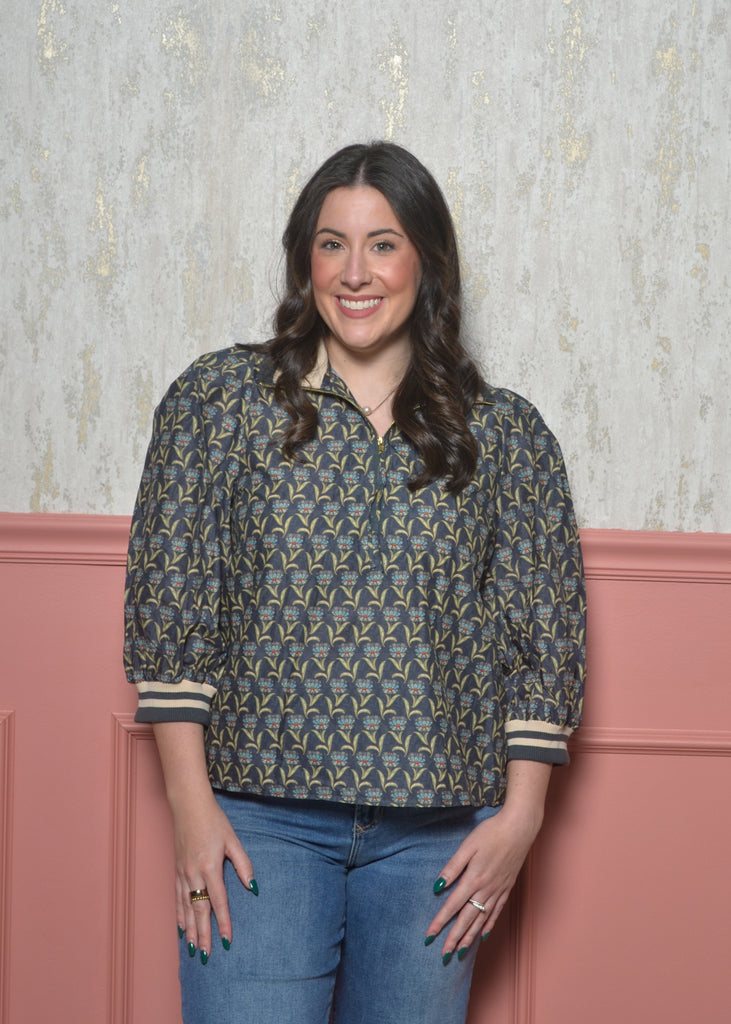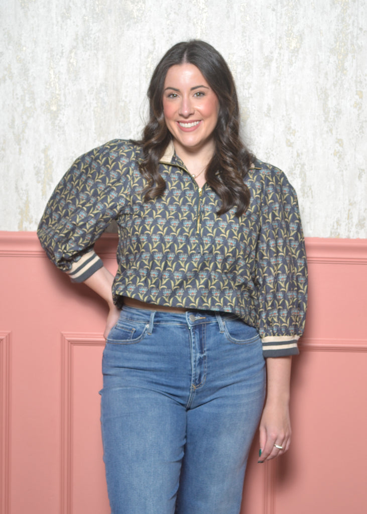 The zip-front collar gives it a modern twist, and the striped ribbed cuffs make the print pop in the prettiest way. Pair it with denim, trousers, or fall skirts — it’s the kind of top that makes an outfit without even trying.