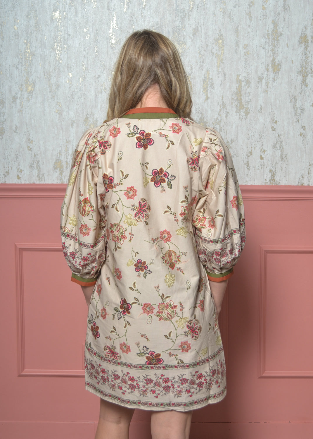 - 3/4 puff sleeves with embroidered detail