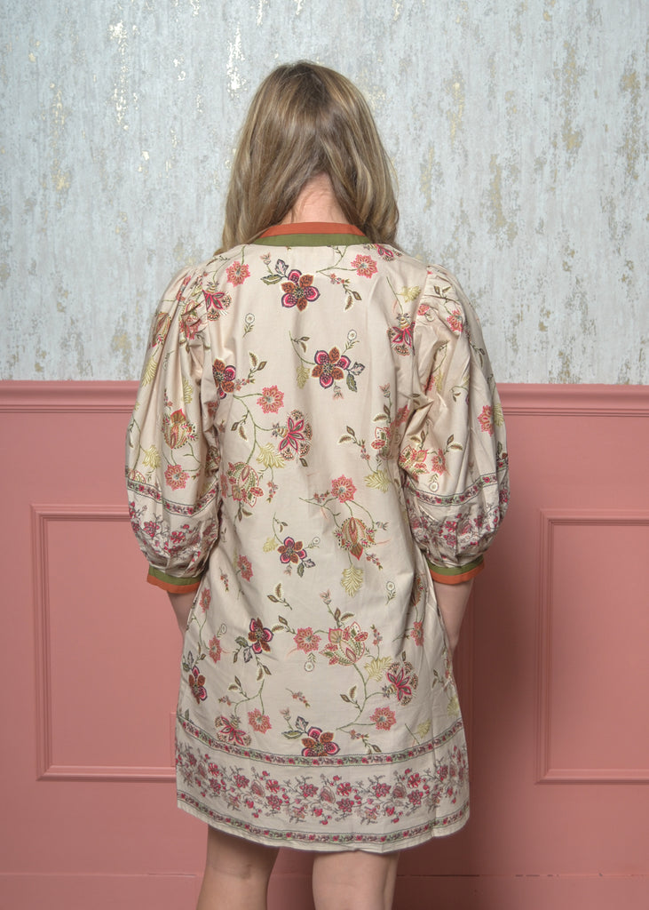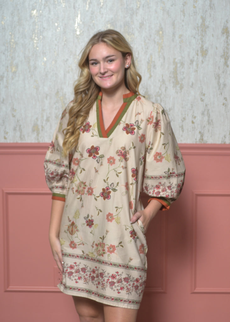 The Meadow Muse Dress brings all the charm of fall florals with a playful, boho twist. Designed with a soft ecru base and pops of red, green, and coral, this flowy mini features a contrast-trim neckline, puff sleeves, and a floral border hem that adds the perfect finishing touch. Pair it with boots or flats for an effortless fall look you’ll wear on repeat.