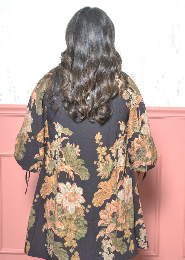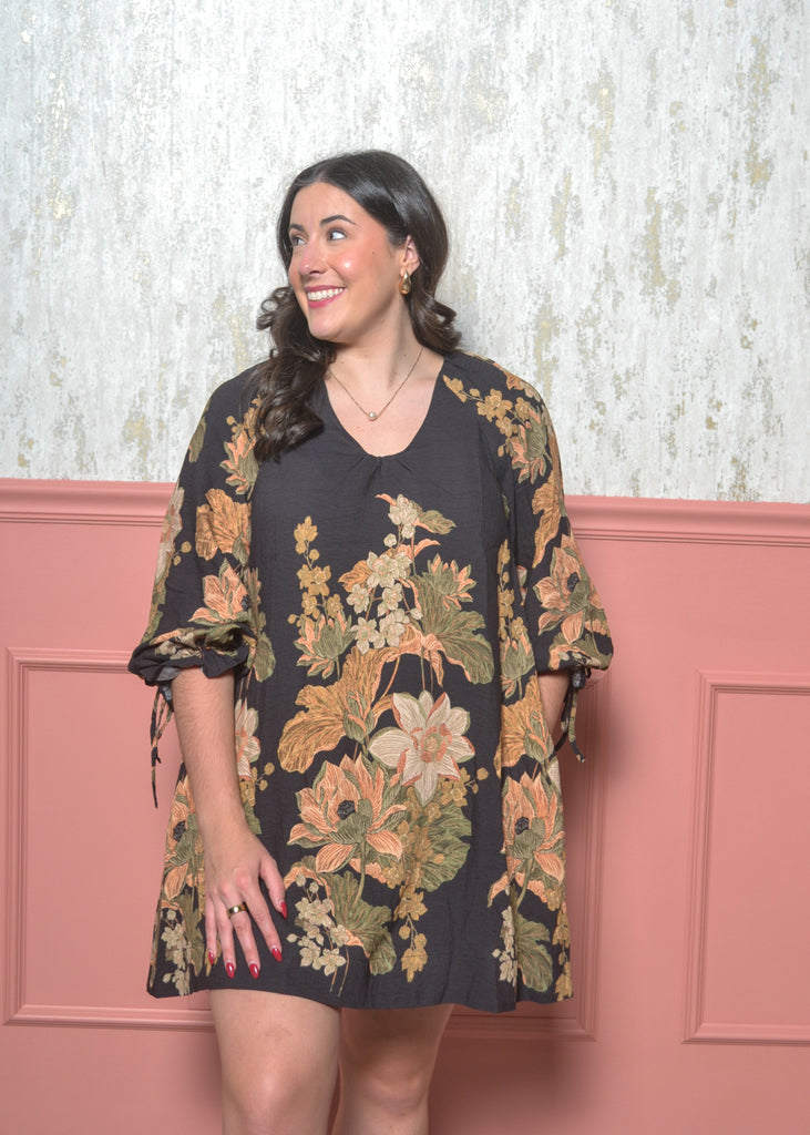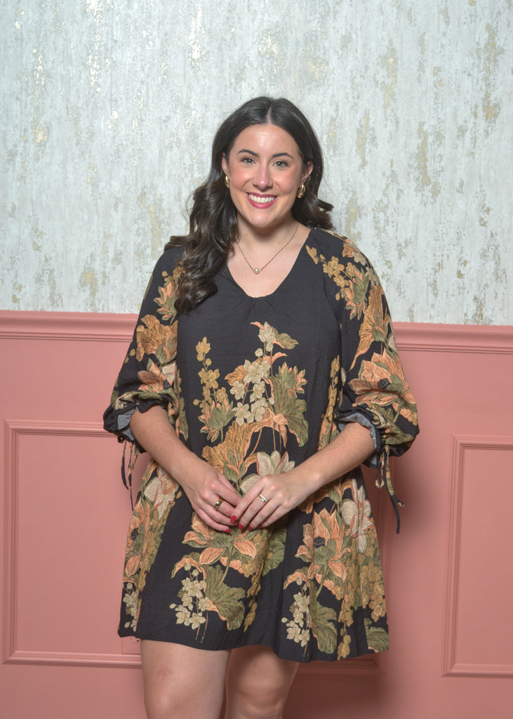 Soft, sophisticated, and oh-so-fall — The Midnight Petal Dress is your go-to for everything from brunch to a night out. The bold floral print and tie-cuff sleeves add a statement touch, while the relaxed fit keeps it comfortable and flattering.