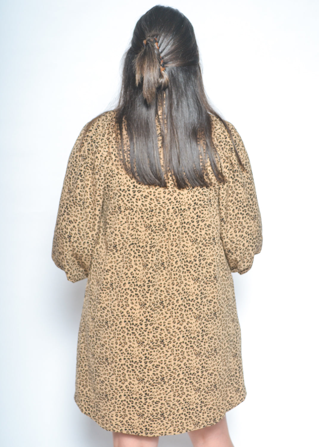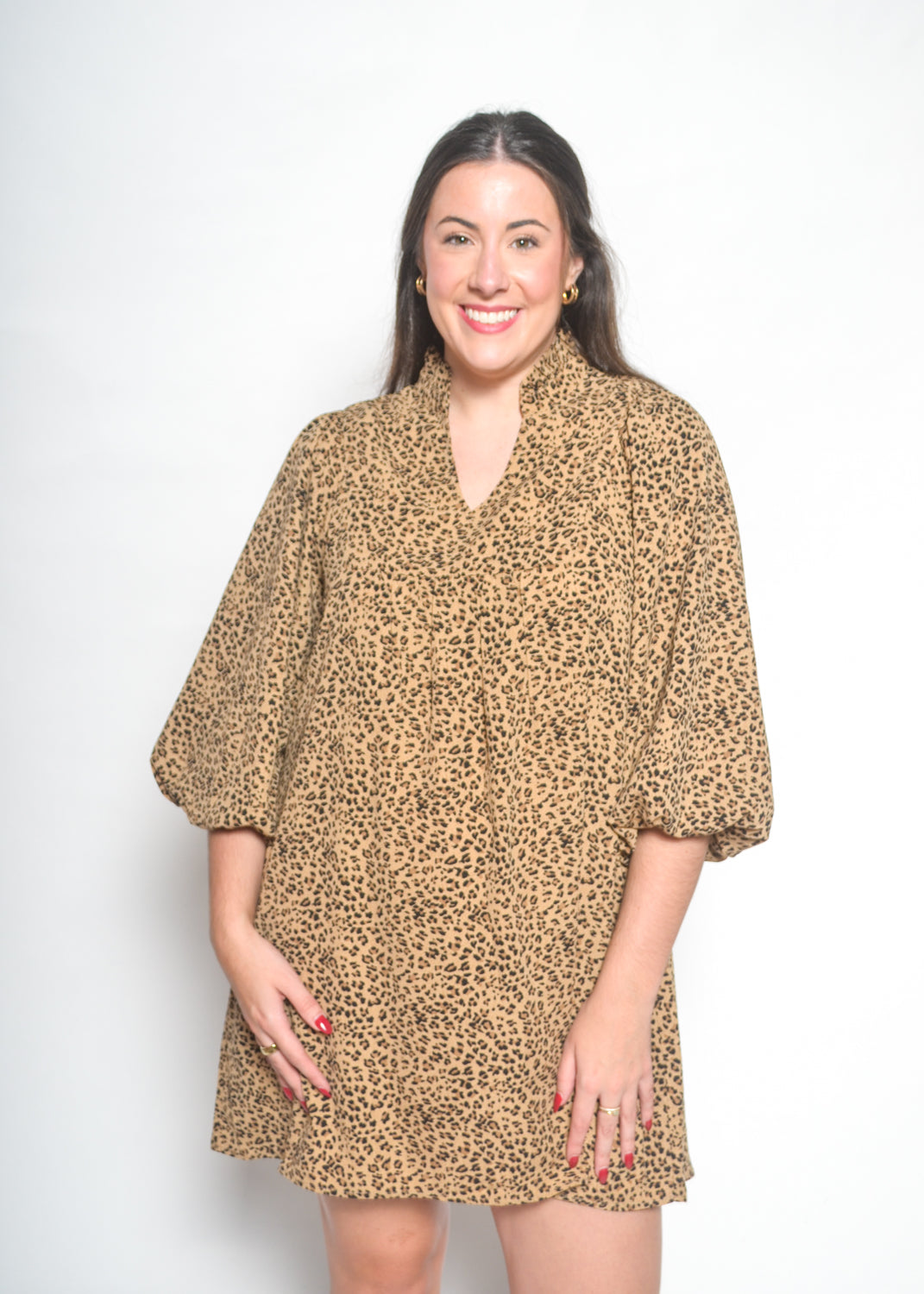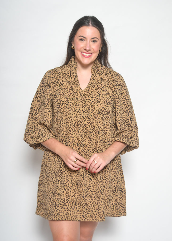 Bring effortless charm to your wardrobe with this leopard print mini dress. Featuring a relaxed silhouette with voluminous ¾ sleeves and a flattering v-neckline, this lightweight dress is perfect for making a bold yet comfortable statement.