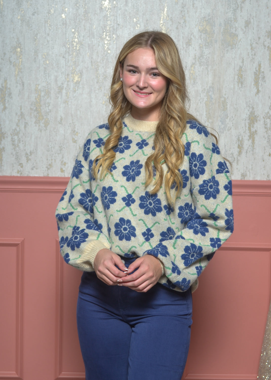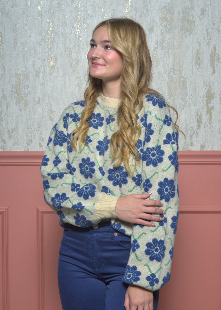 Add a pop of retro charm to your fall wardrobe with this cozy floral sweater! Featuring bold blue blooms on a soft cream base, this piece is perfect for pairing with denim or corduroy for a laid-back yet feminine look.