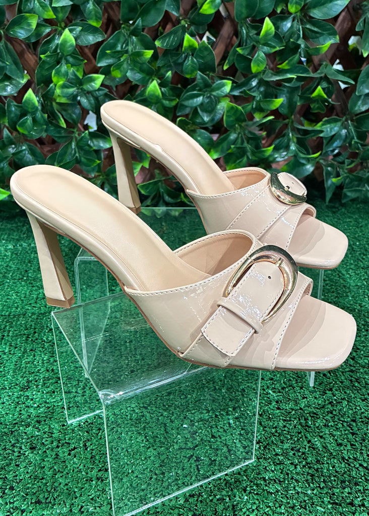 Polish off your look with the Luxe Buckle Heel. Featuring a glossy patent finish and bold gold buckle, this stiletto mule is the ultimate statement shoe that works for date nights, holiday parties, or chic workwear.