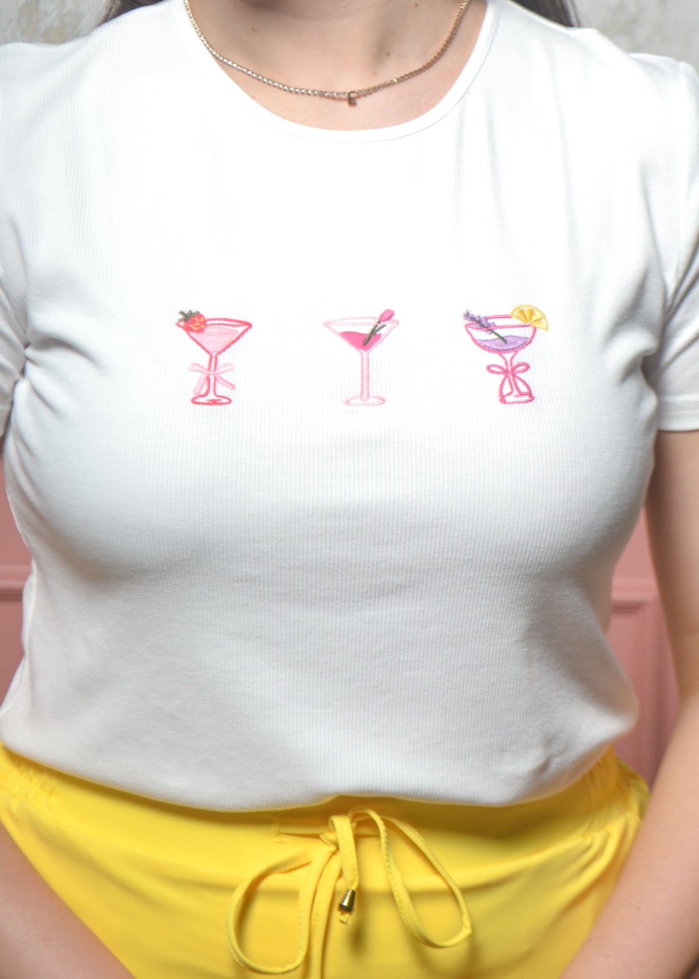 - Cream tee with embroidered cocktail designs