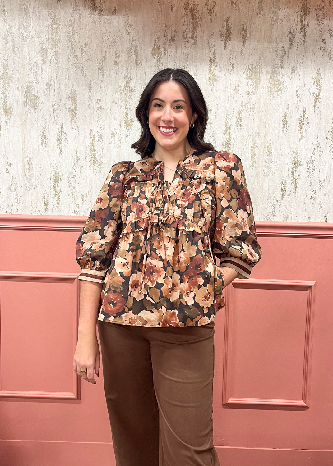 Fall florals meet feminine charm in this stunning peplum blouse. Featuring soft ruffles across the chest, front tie details, and a warm floral print in shades of mocha, rust, and cream — this top is your go-to for effortless elegance this season. Pair it with denim or a skirt for a look that’s as cozy as it is chic.