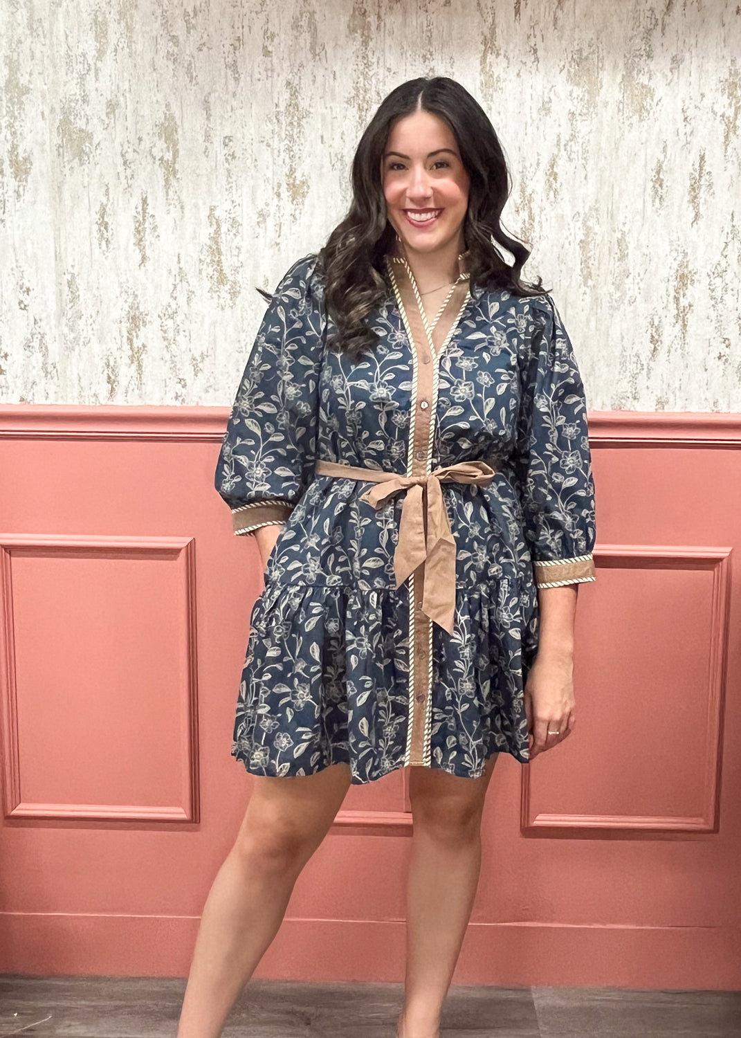 Elegant and effortless, The Blue Willow Dress blends timeless florals with a touch of modern charm. The navy base and tan trim give it a refined fall feel, while the belted waist and button-front design make it flattering and easy to style. Perfect for workdays, brunches, or fall events.