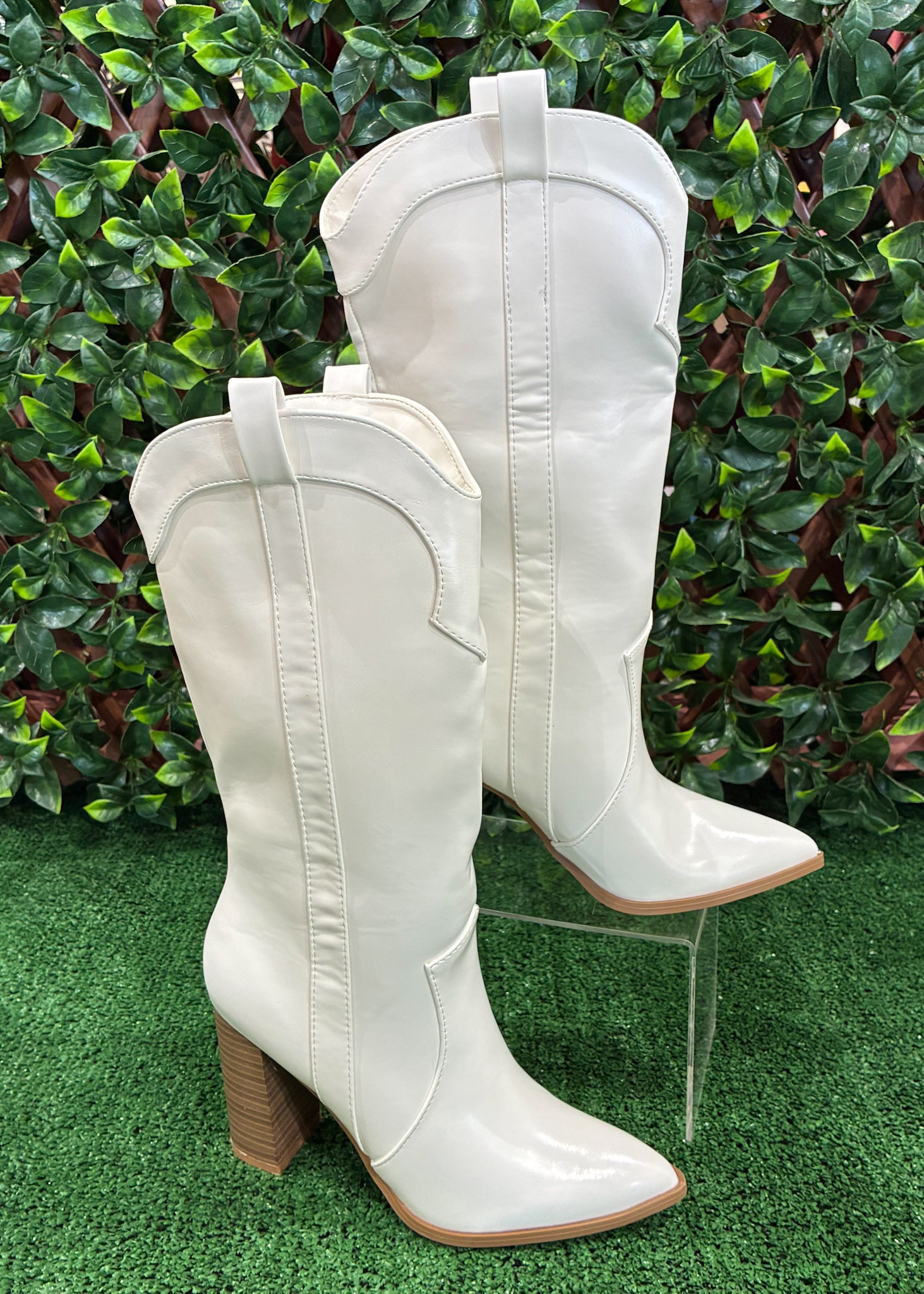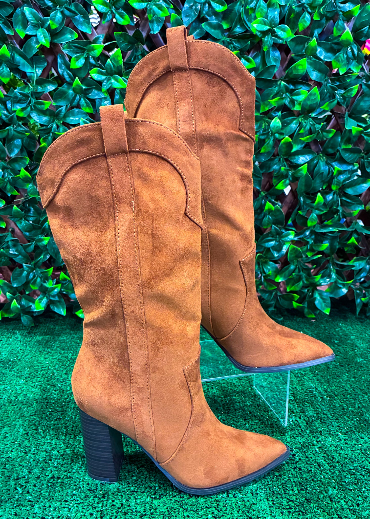 Take your fall wardrobe to new heights with The City Limits Boot. This tall western-inspired boot blends timeless cowgirl charm with a sleek city edge. Available in two stunning finishes — Cognac Suede for that soft, rustic texture and White Faux Leather for a crisp, modern touch — these boots are the perfect statement piece for any outfit. Pair them with dresses, skirts, or denim for an effortlessly chic look all season long.