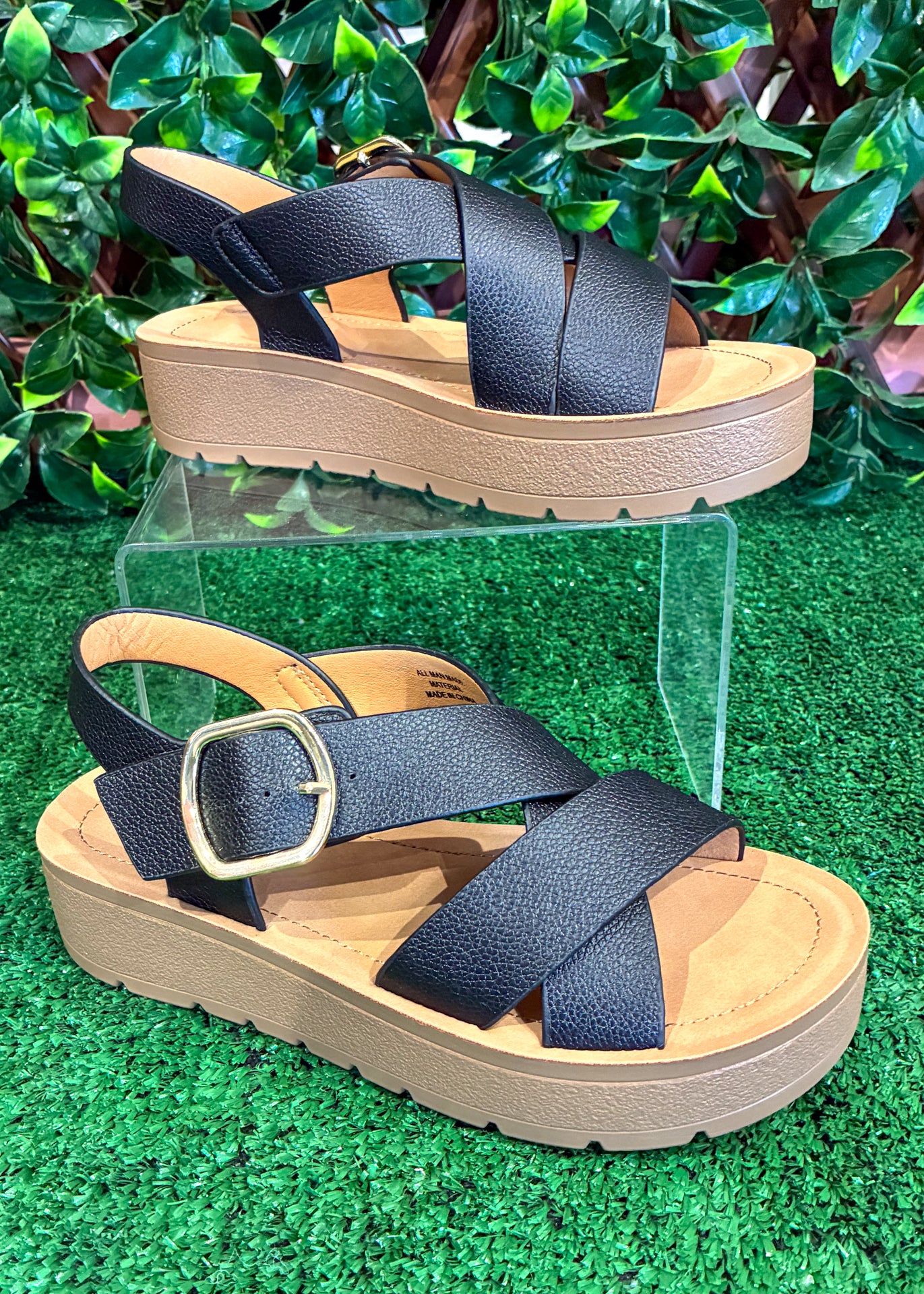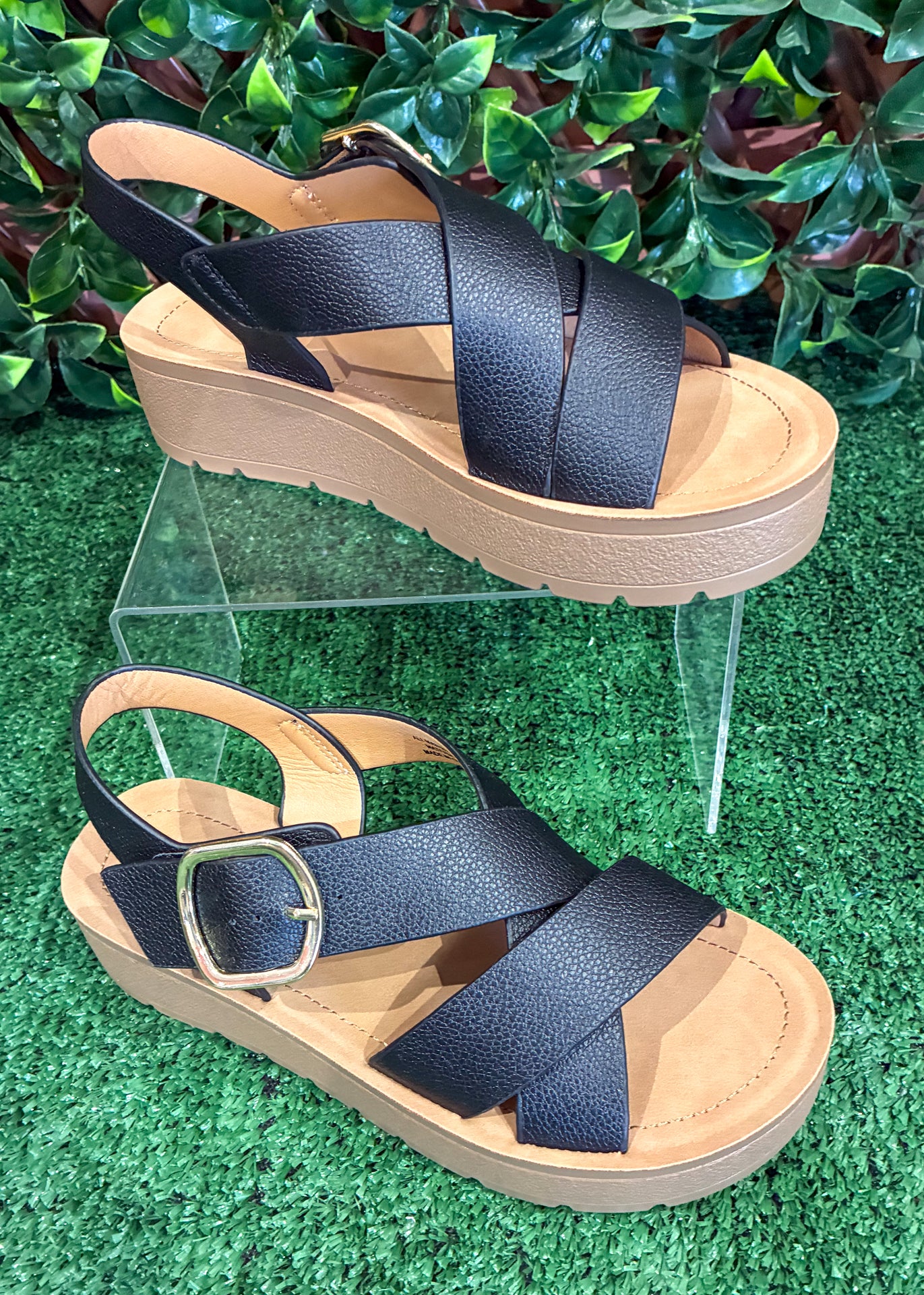 The textured faux leather upper gives it a polished feel, while the cushioned footbed and lightweight flatform sole provide comfortable lift and support. Whether you're running errands, heading to brunch, or packing for a getaway, this versatile sandal pairs perfectly with denim, dresses, and casual summer outfits.