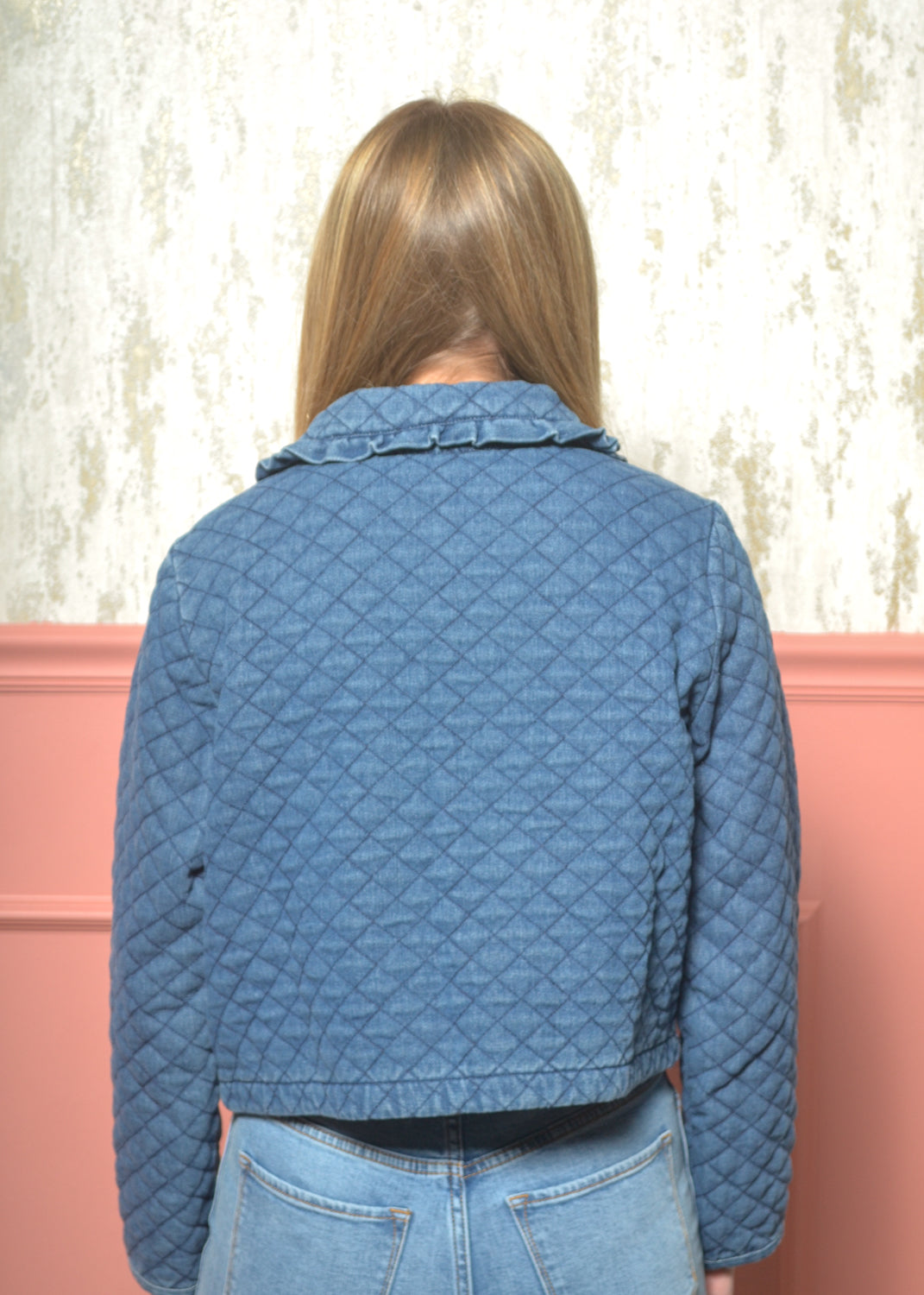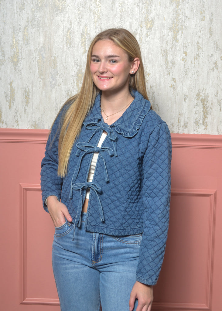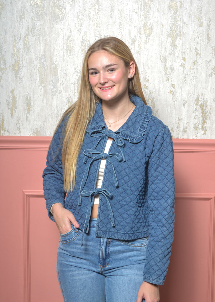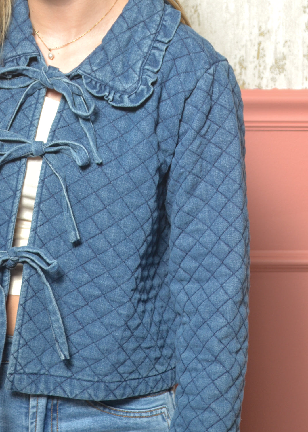 Sweet, soft, and oh-so-chic — this quilted denim jacket features feminine bow ties and a ruffled collar for a touch of charm. Perfect for layering over your favorite basics all season long.