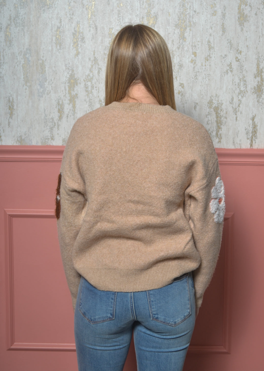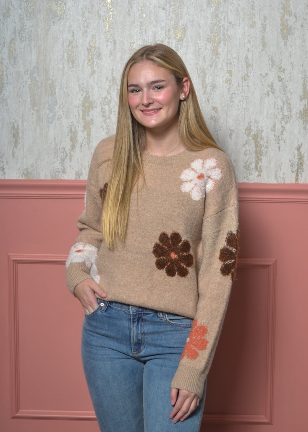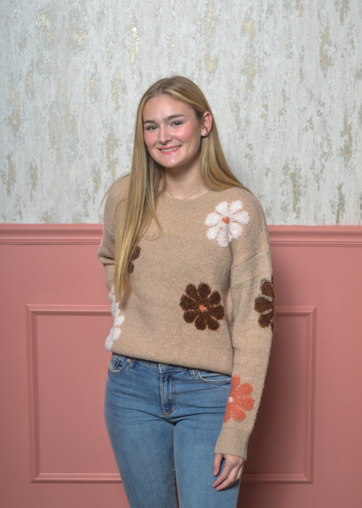 Flirty florals meet soft comfort in this dreamy sweater. The fuzzy texture and earthy tones make it ideal for chilly fall mornings and cozy nights in.