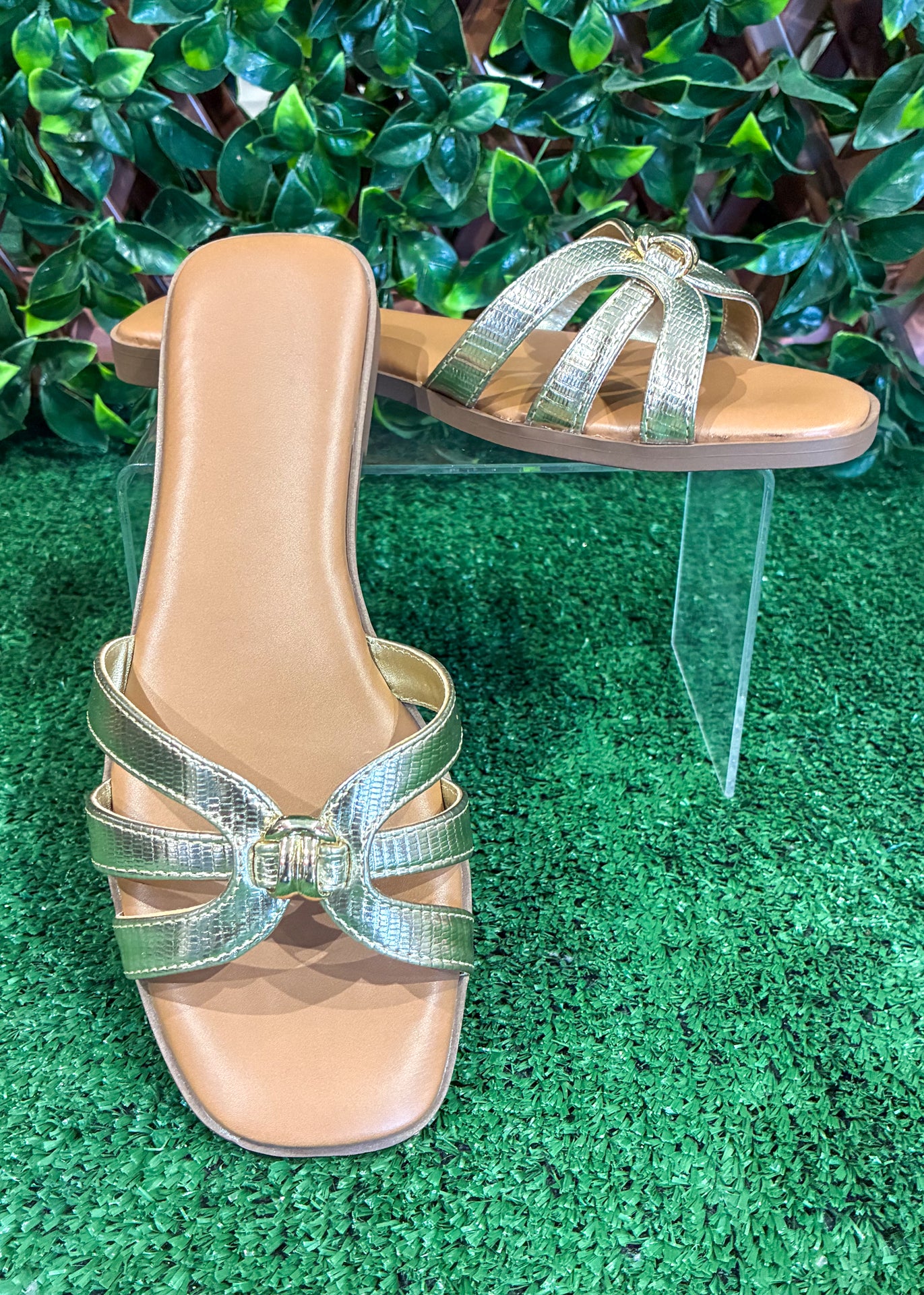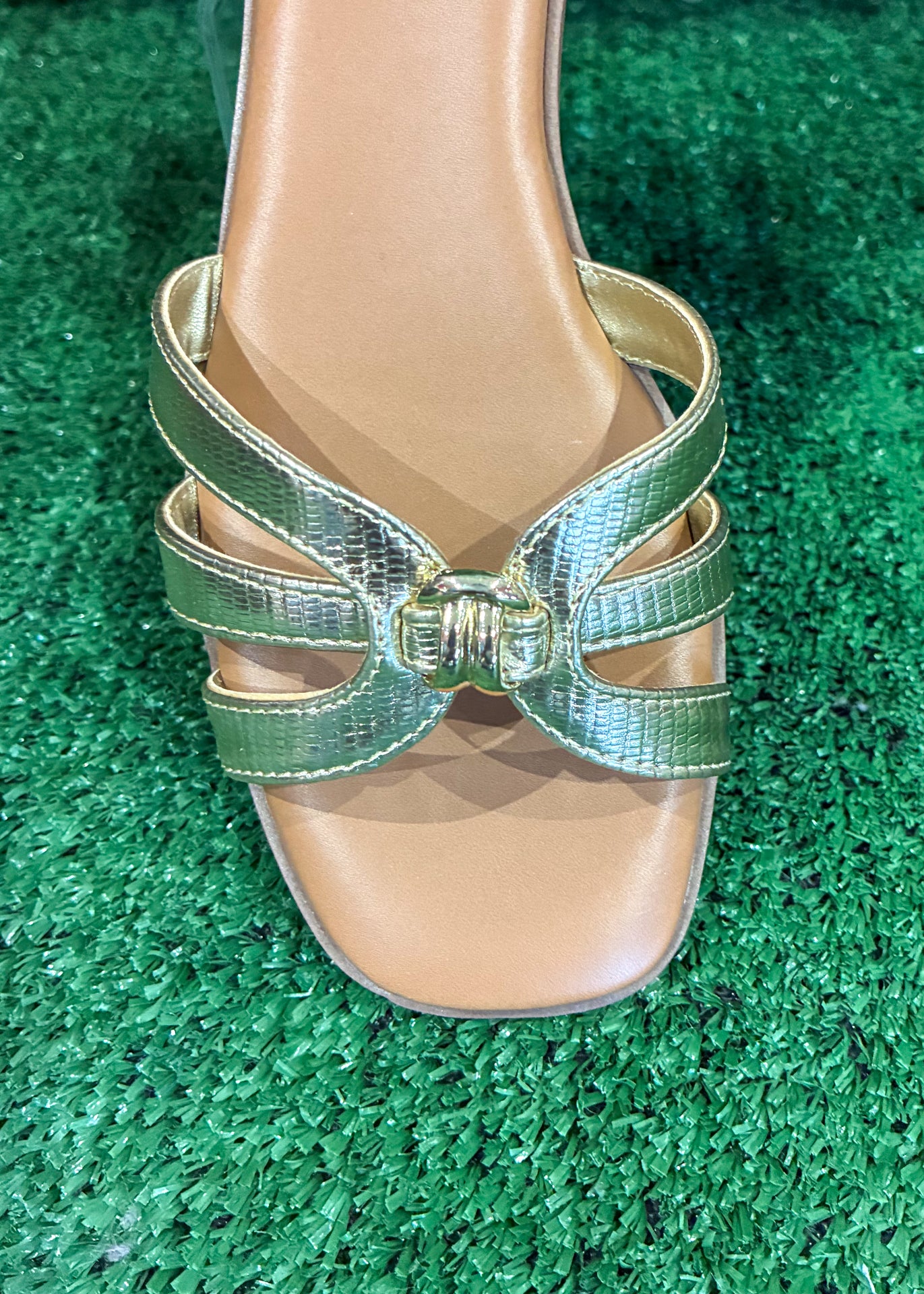 Add a touch of shine to your everyday style with The Gilded Grace Sandal. This elegant slide sandal features slim metallic straps with a subtle textured finish and a chic gold knot detail at the center for a polished, feminine look.