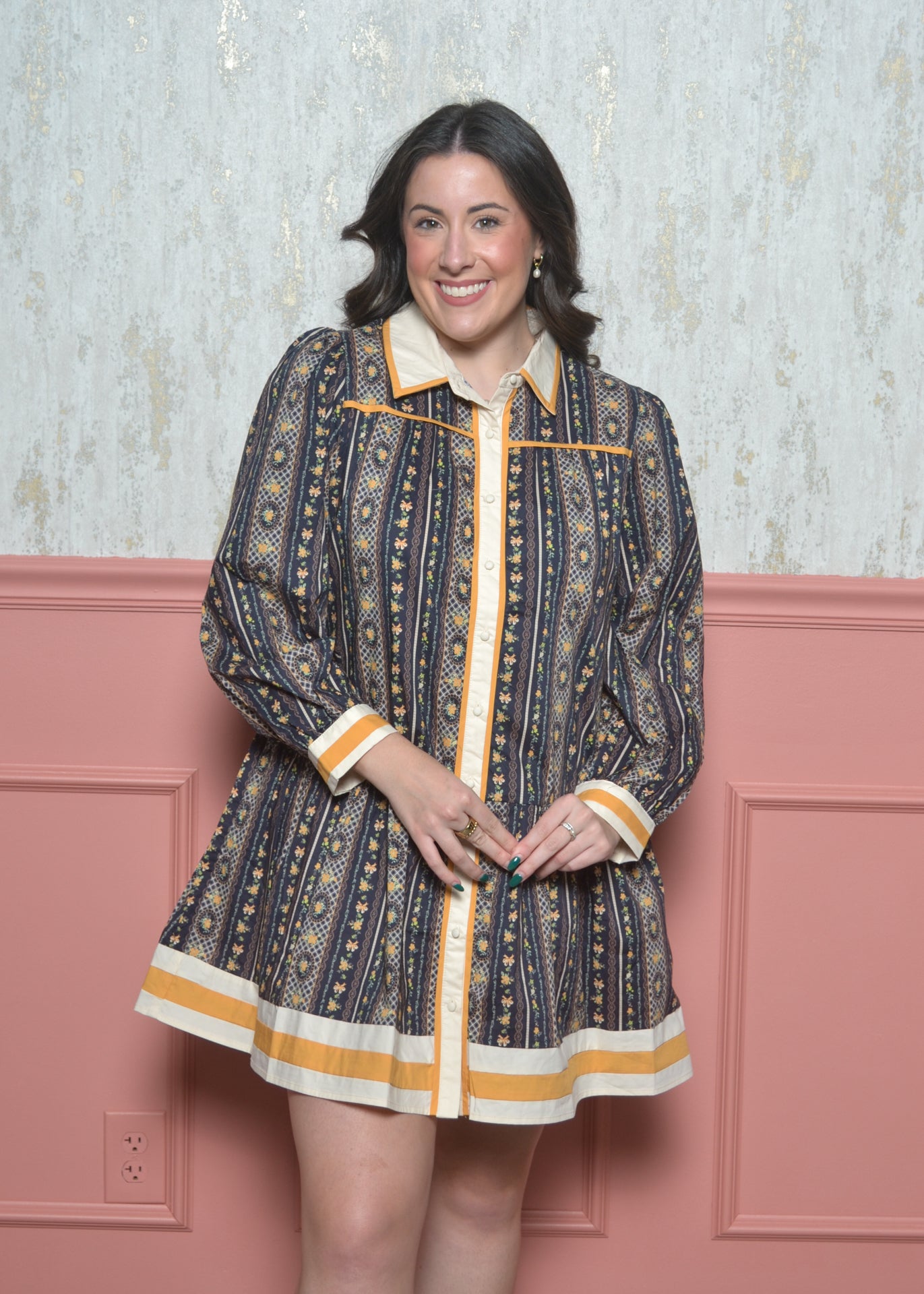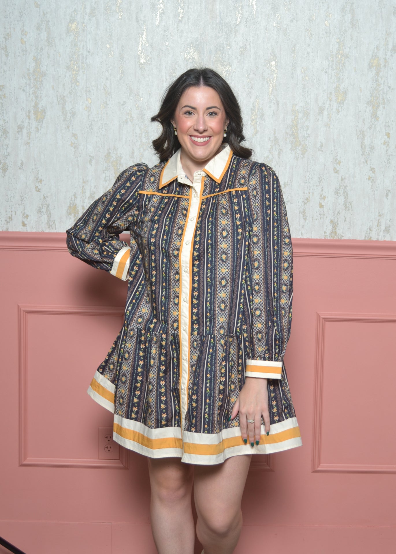 Say hello to The Marigold Market Mini — the patterned statement dress that makes any day feel special. With its vintage-inspired print, contrast trim, and crisp collar, this dress blends playful charm with polished detail. The tiered mini silhouette gives you an easy, flattering fit that works for brunch, work events, or fall festivals.
