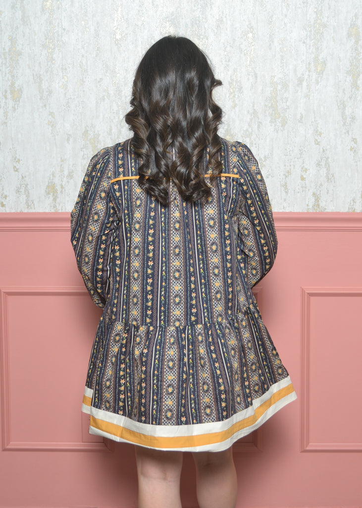 - Navy, mustard, and cream patterned mini dress