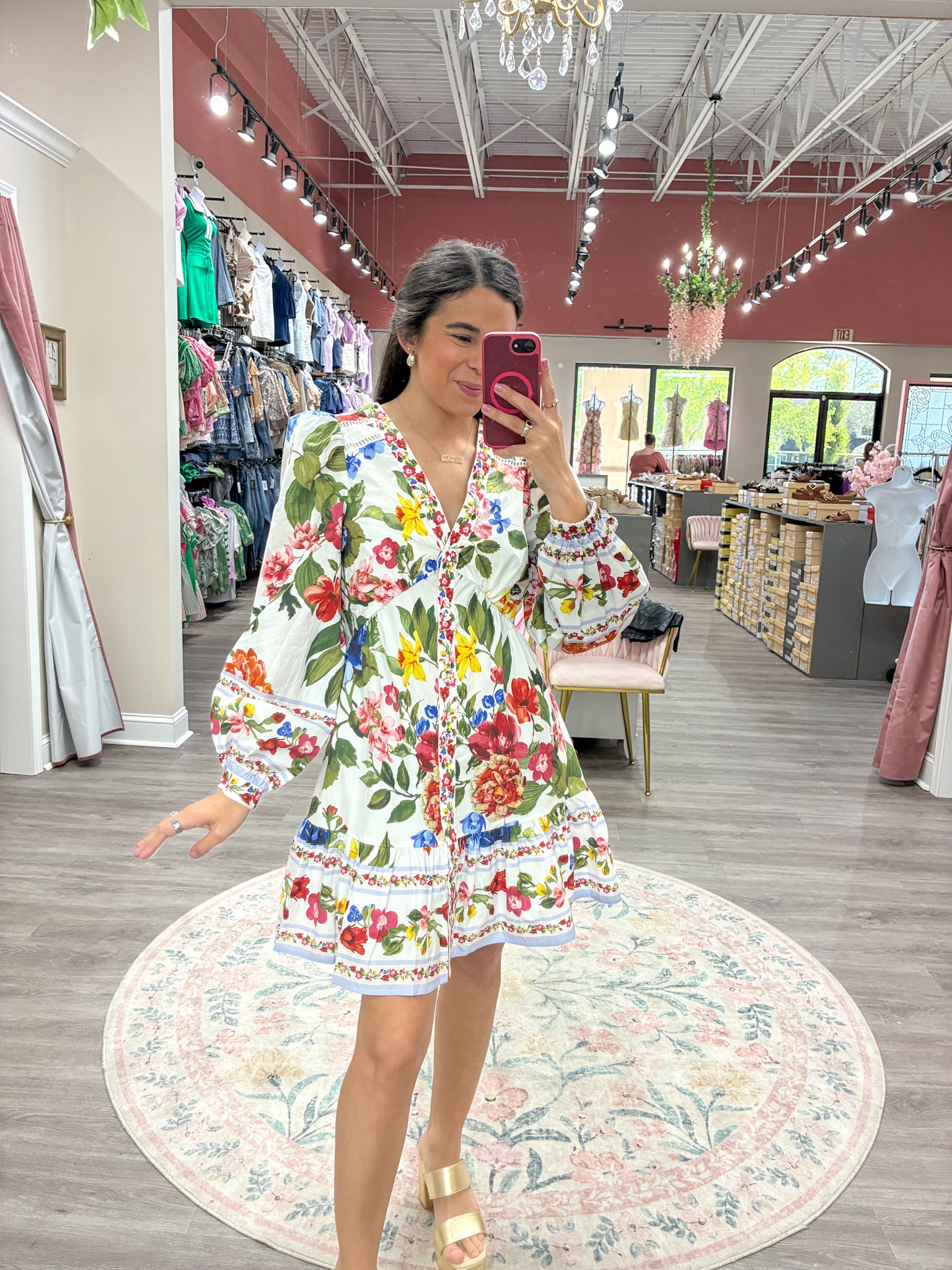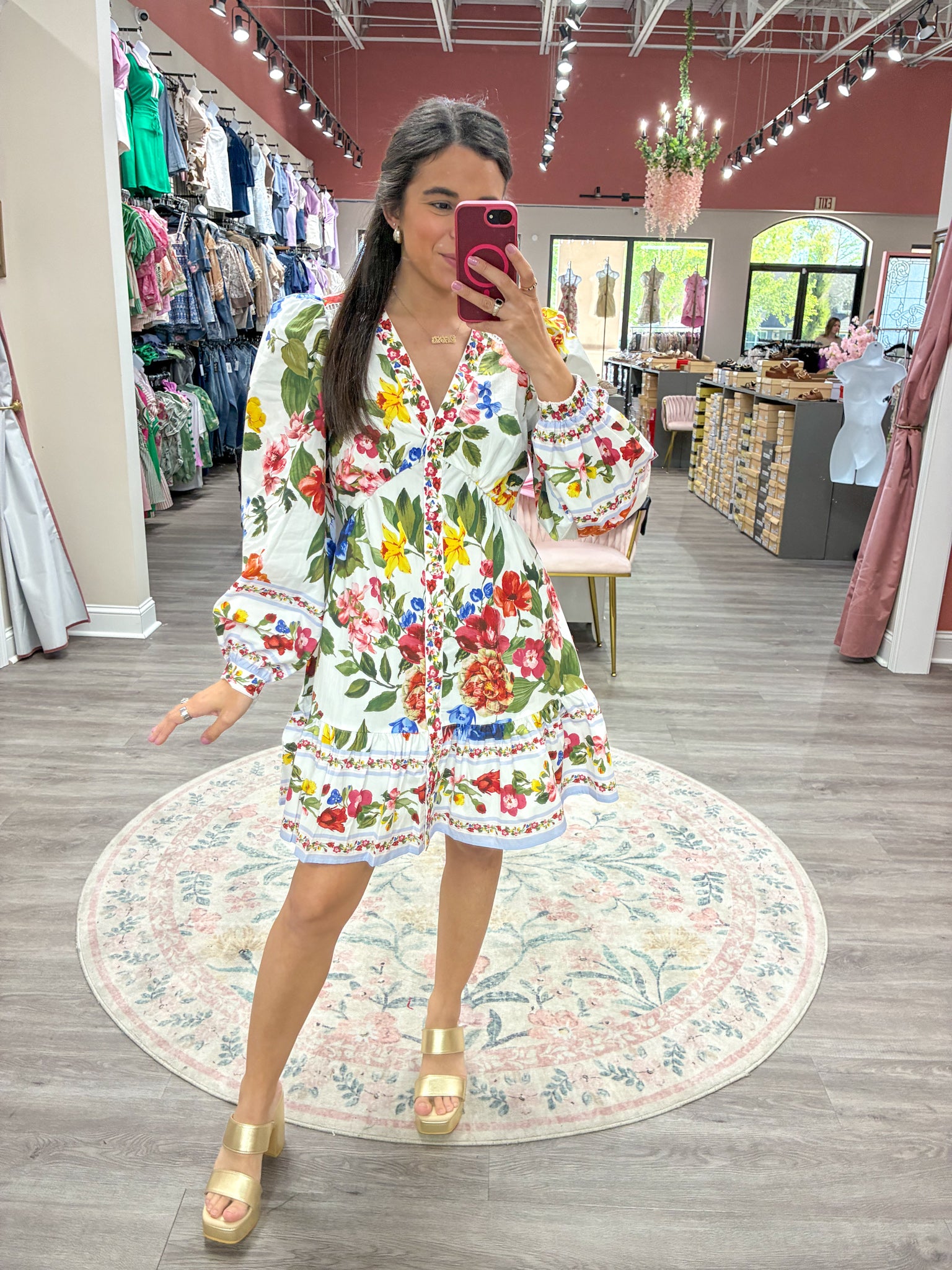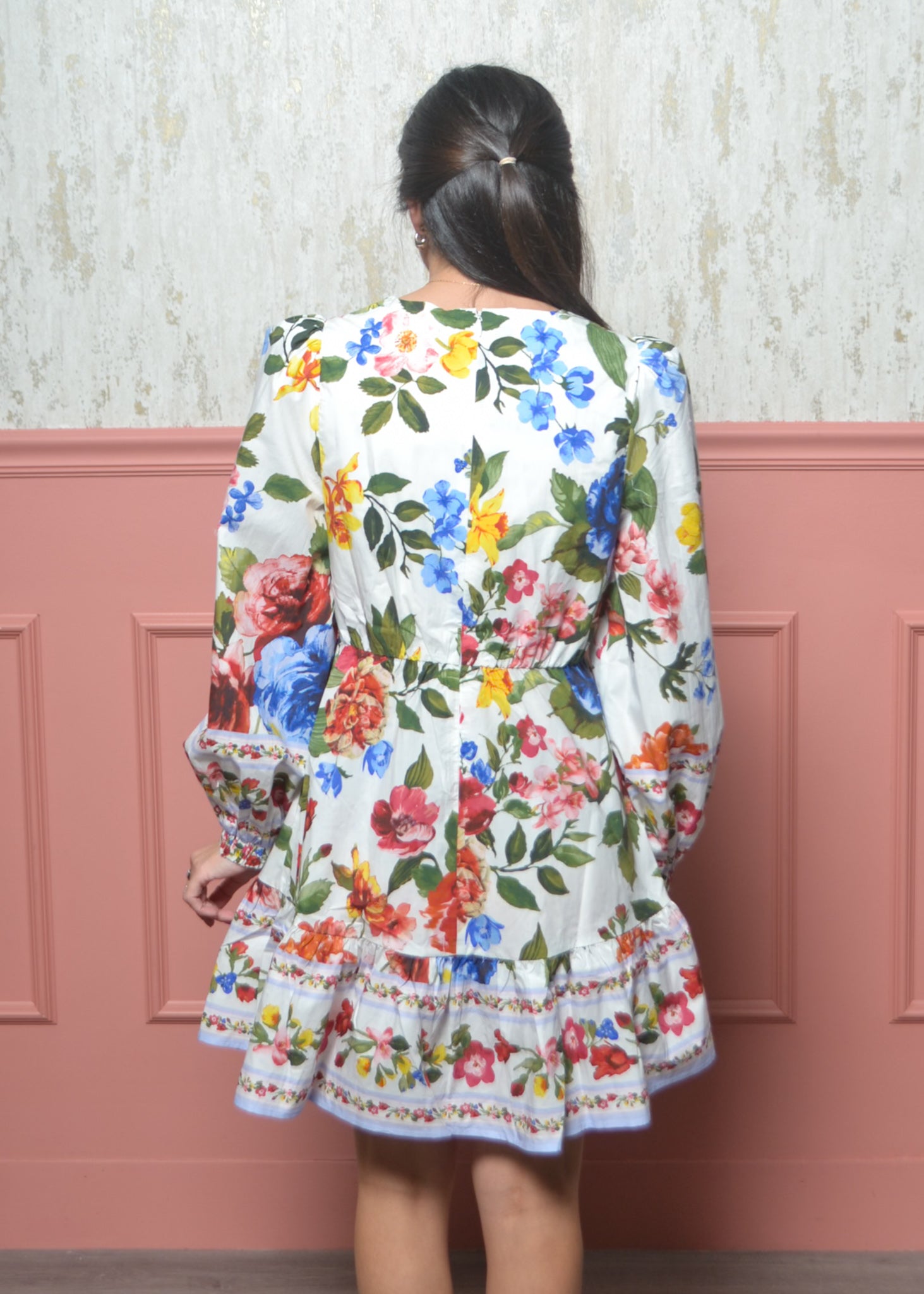 Romantic, colorful, and effortlessly feminine — The Painted Garden Dress features a vibrant floral print that looks like it came straight from a blooming spring garden. With its flowy silhouette, statement sleeves, and delicate border details, this mini dress is perfect for brunch dates, showers, and sunny weekend outings.