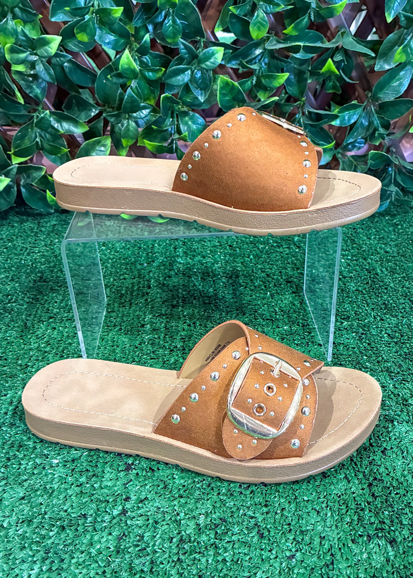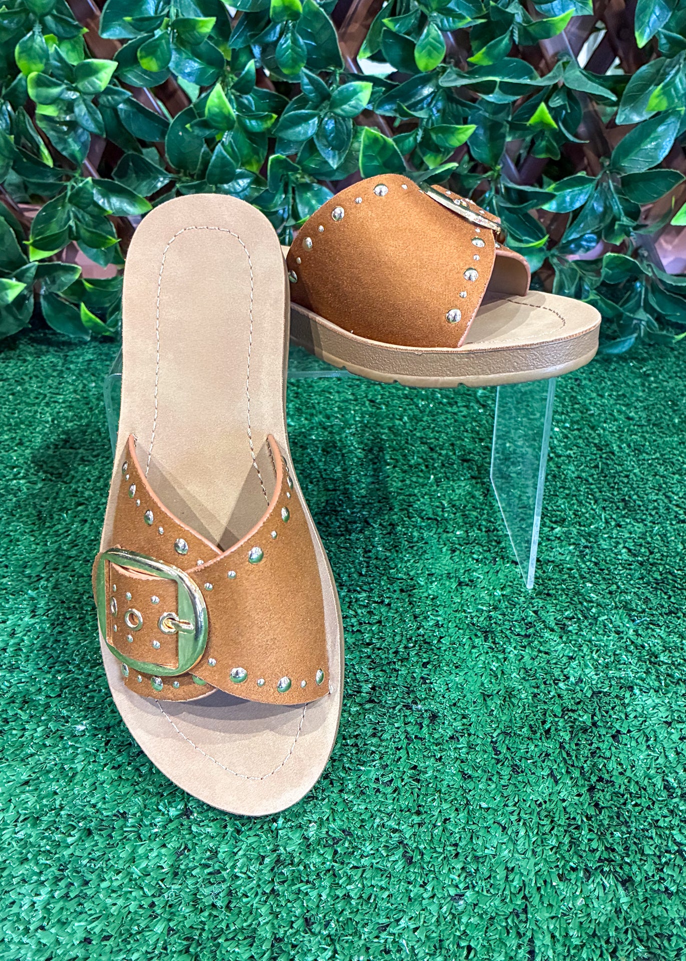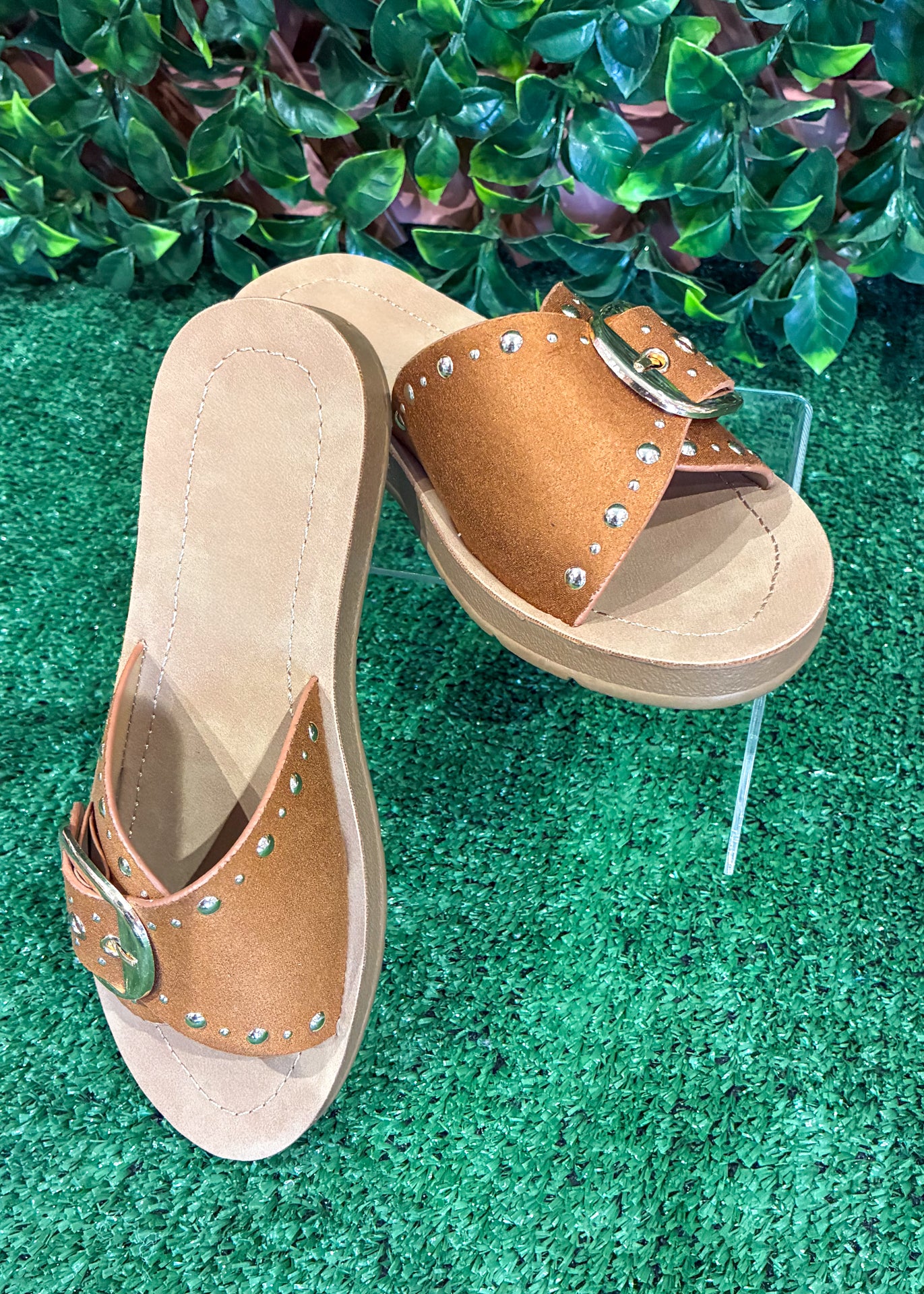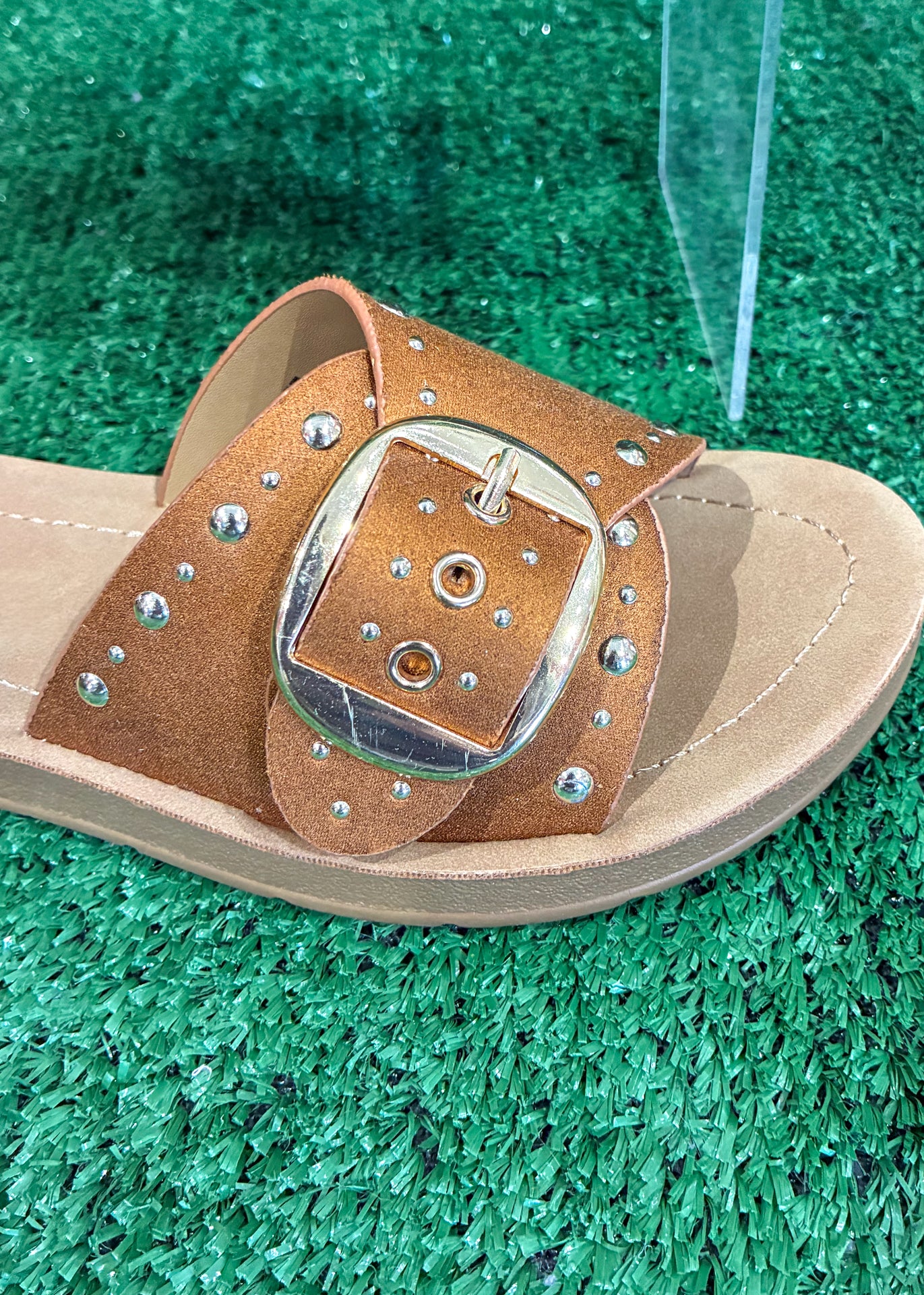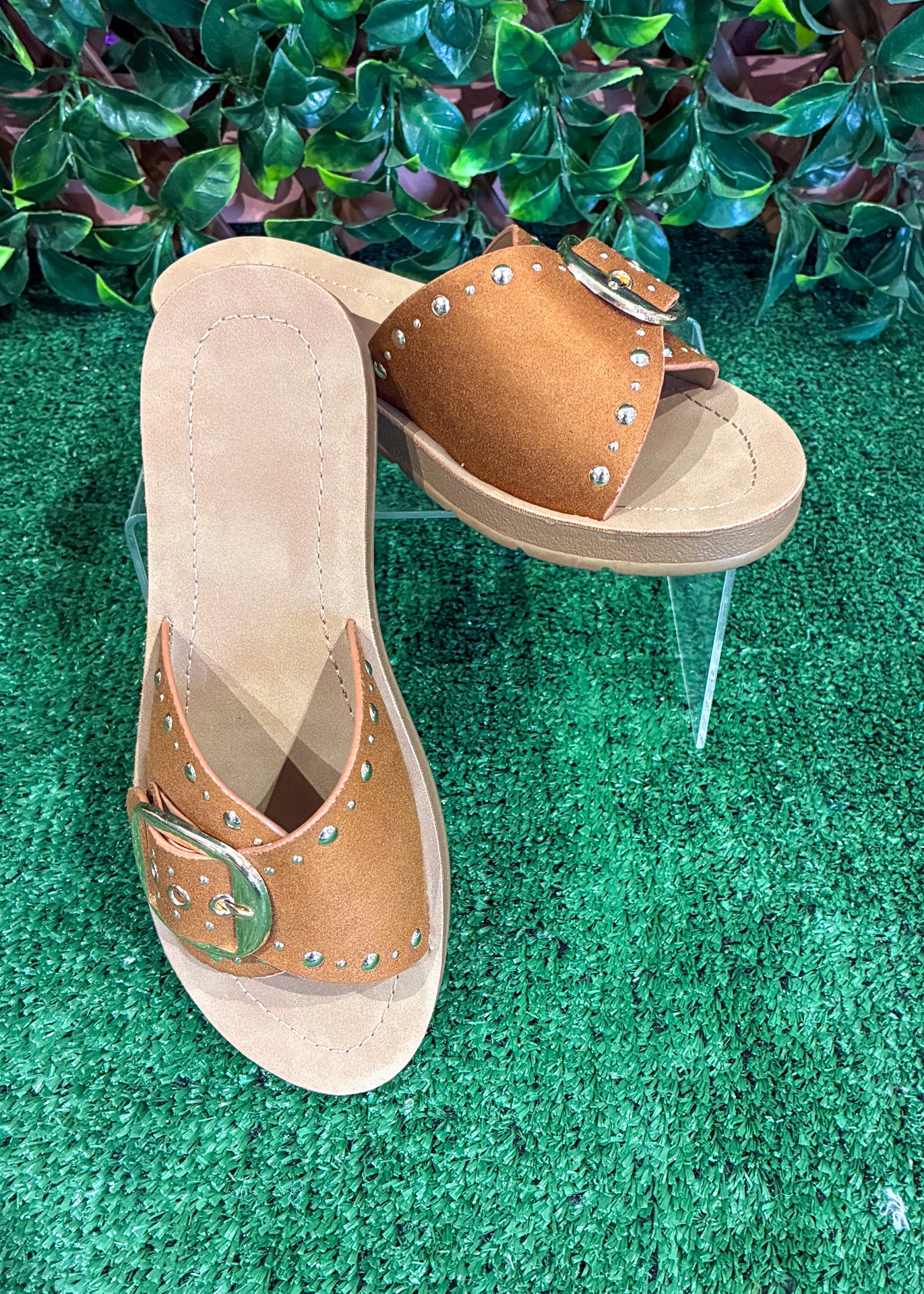 The Studded Charm Sandal brings a little western-inspired edge to your everyday style. Featuring a wide suede-look strap with silver stud details and an oversized buckle accent, this slide sandal adds just the right amount of statement to casual outfits.