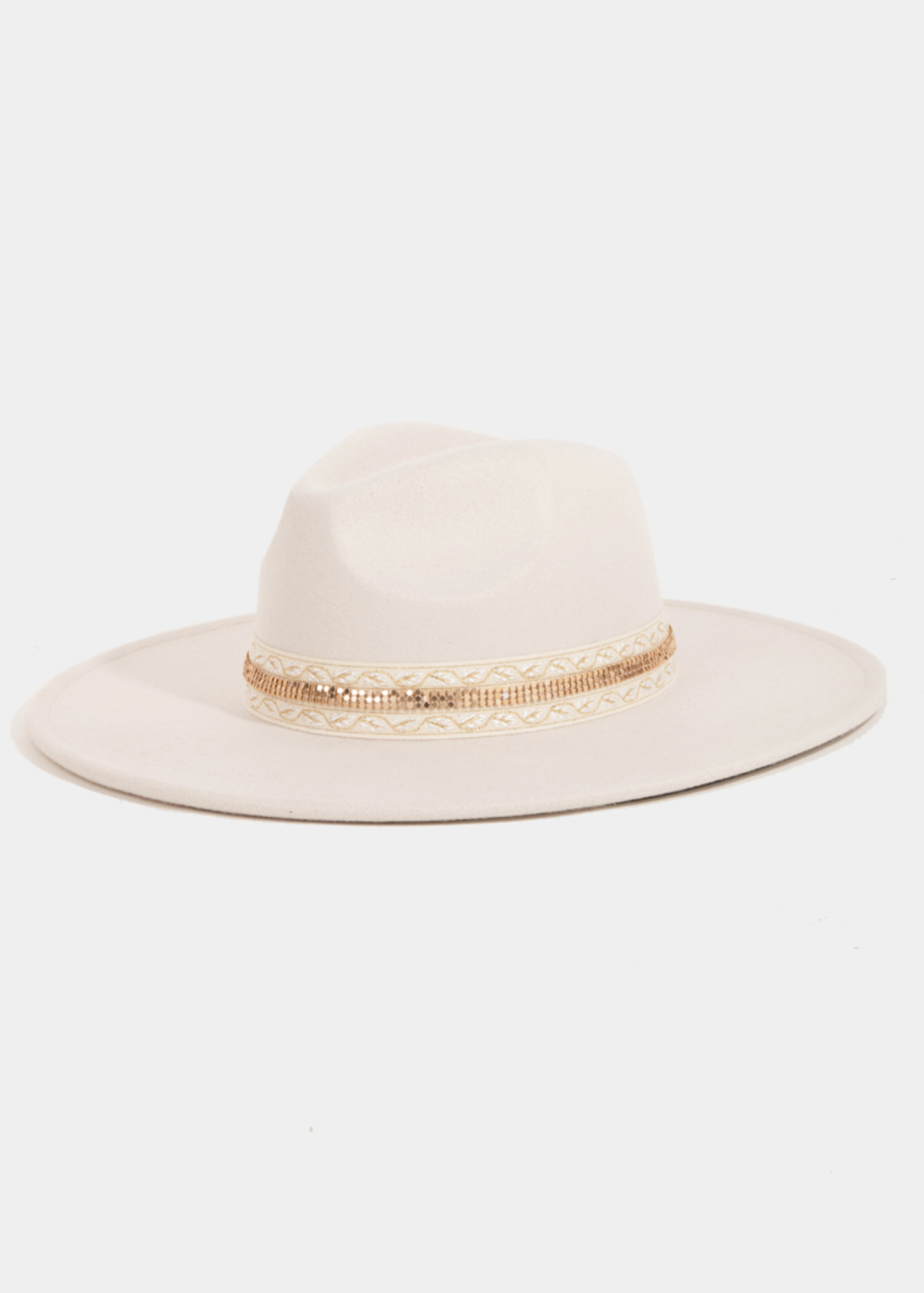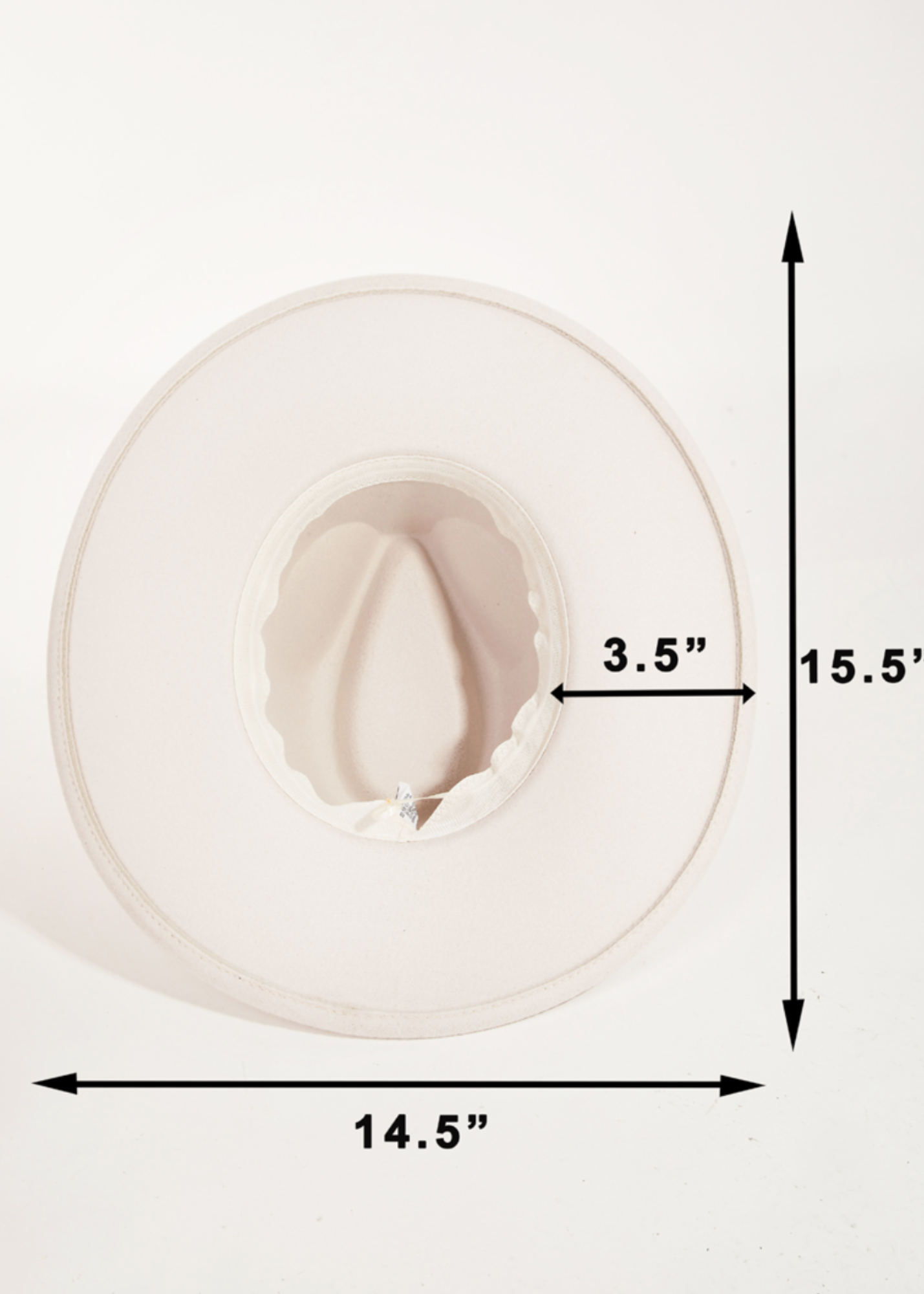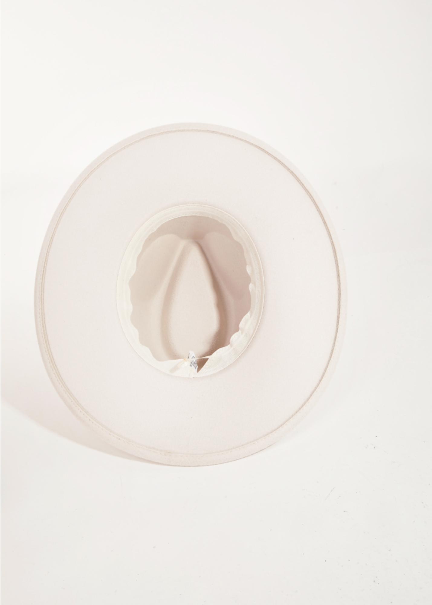Soft, timeless, and effortlessly elevated, the Golden Hour Ivory Cowboy Hat brings a refined western touch to any outfit. Designed in a creamy ivory tone with a structured crown and wide brim, this hat is finished with an elegant woven band and subtle gold detailing for a clean, elevated look that works year-round.