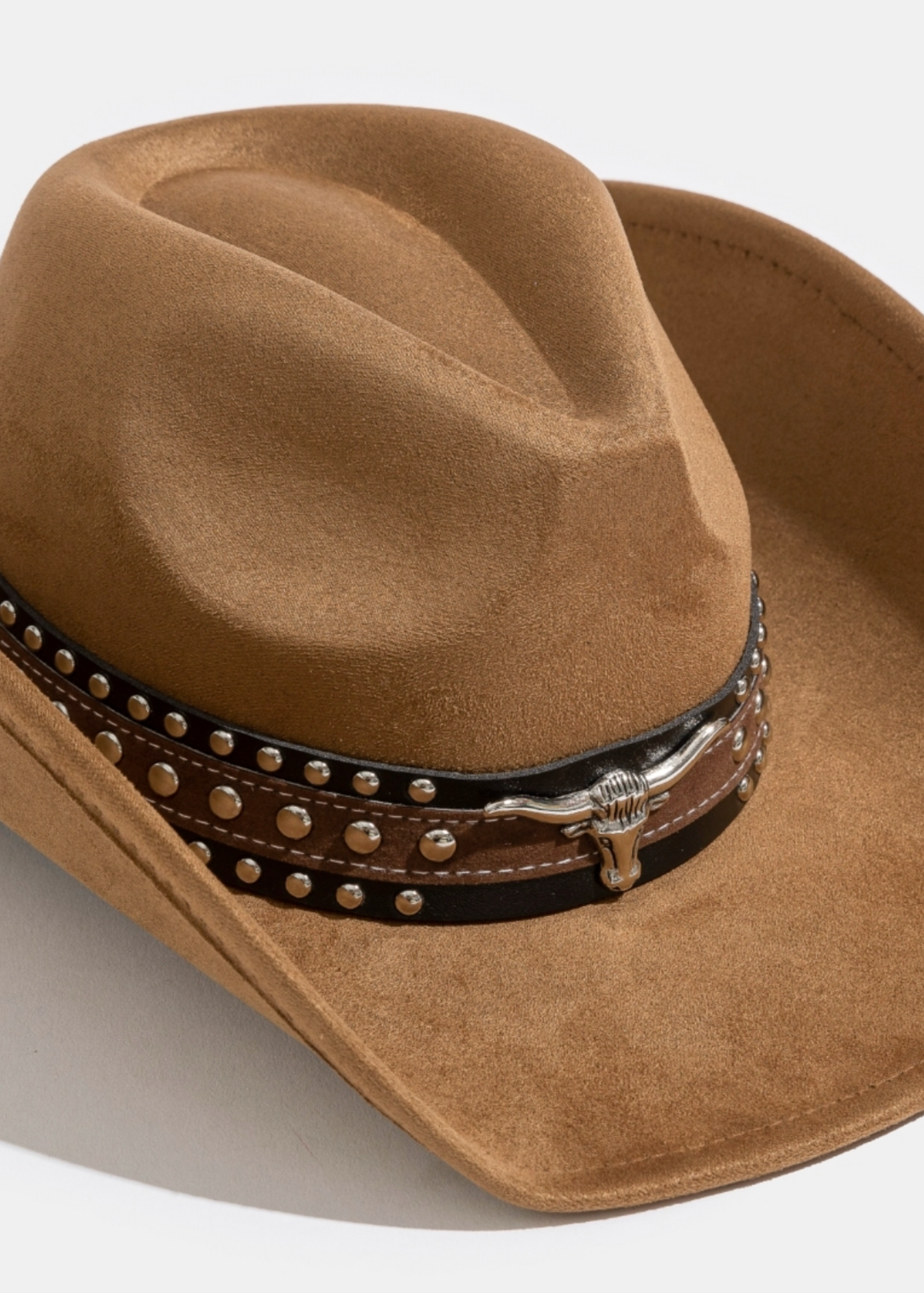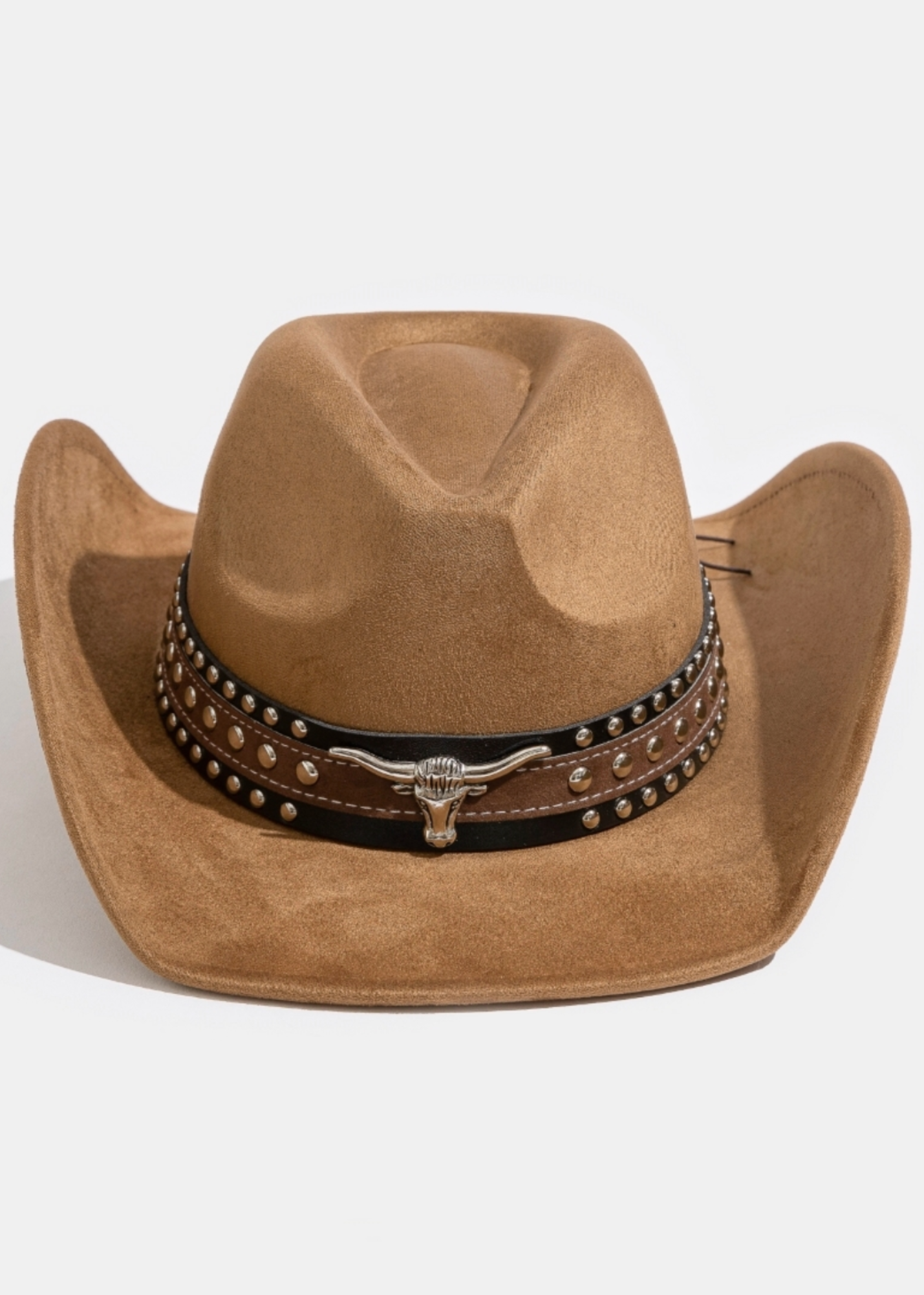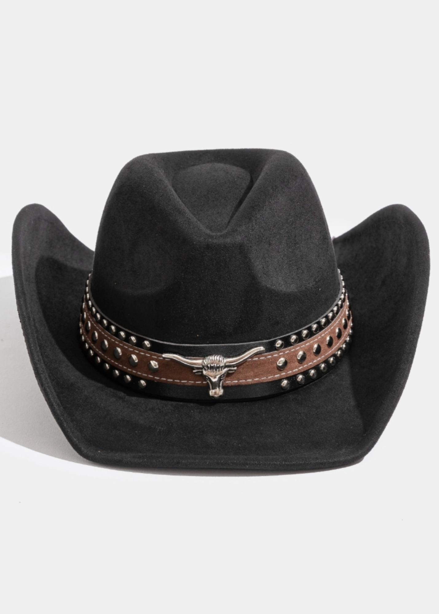 Bold and unmistakably western, the Midnight Longhorn Cowboy Hat is a statement accessory made to stand out. Available in classic black or rich brown, this structured cowboy hat features a curved brim and eye-catching studded band with a silver longhorn emblem for a rugged, confident finish.
