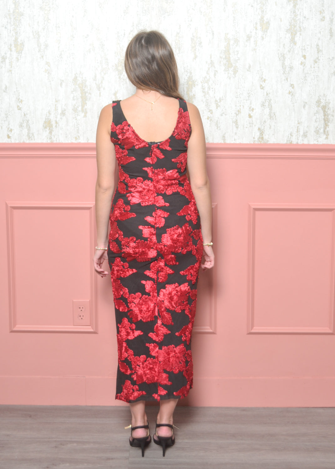 Turn heads in the Midnight Rose Velvet Gown, a striking black formal dress adorned with bold red velvet floral appliqué. This sleeveless silhouette features a flattering scoop back, a comfortable midi-to-maxi length, and a curve-skimming fit that moves beautifully with you. Perfect for holiday parties, winter formals, weddings, and any night you want to make a dramatic entrance. Pair it with classic heels and simple jewelry—this gown speaks for itself.
