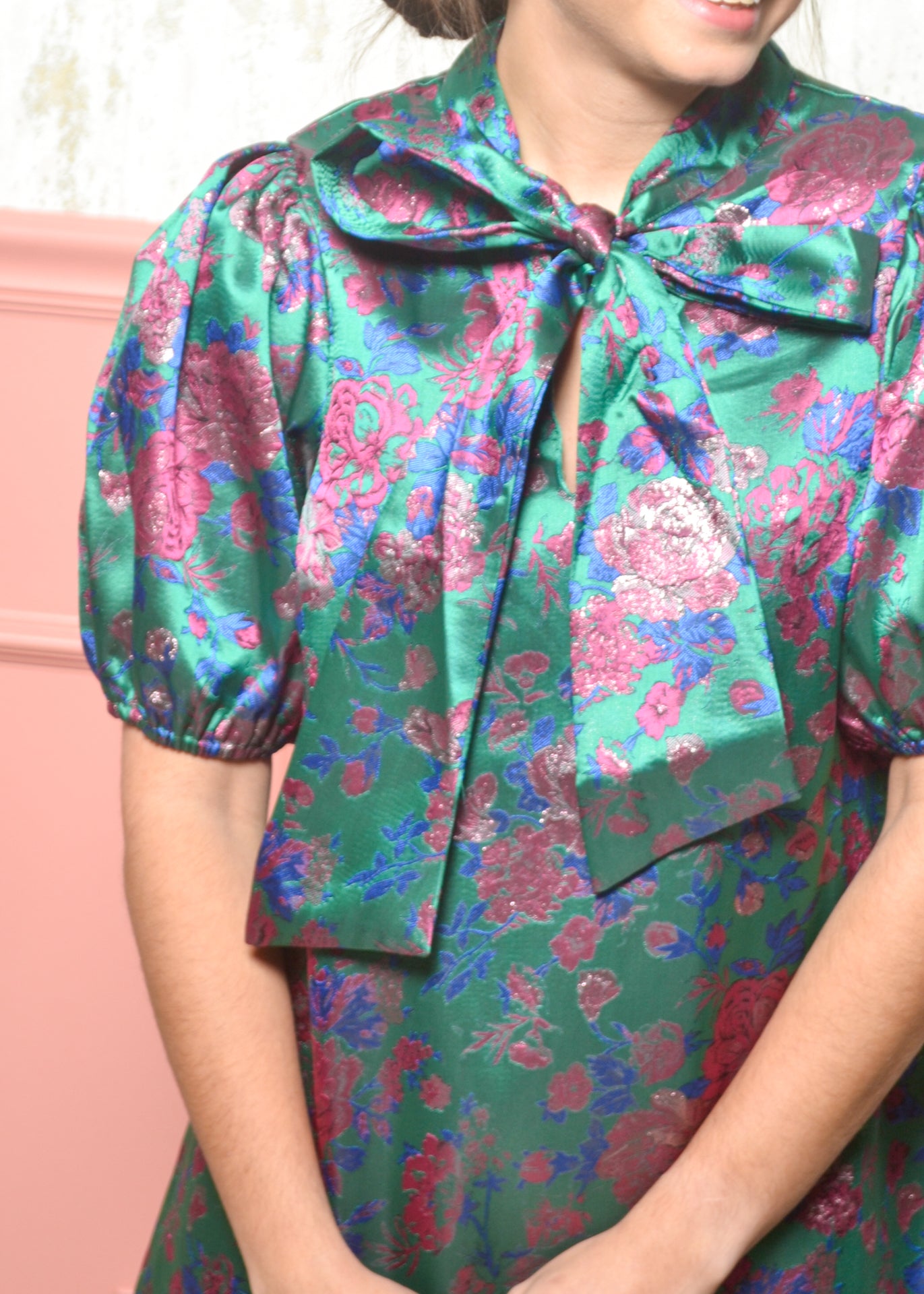 Shine under the twinkling lights in this luxe emerald jacquard dress with metallic floral detailing and a statement bow neckline. It’s festive, flirty, and full of Christmas charm.