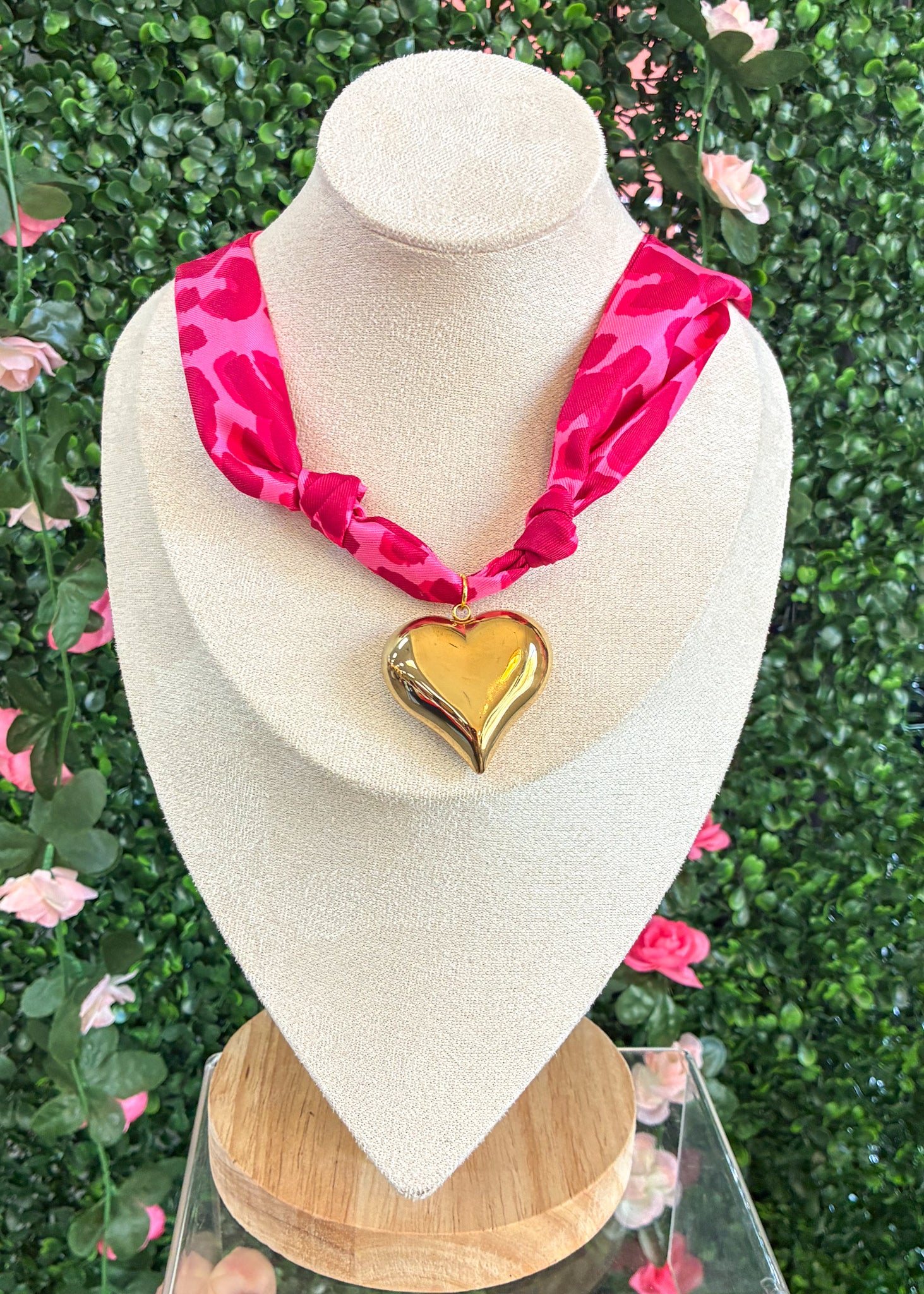 Add a pop of playful glam with the Heart of Bold Scarf Necklace. Featuring a silky pink and red leopard print scarf and a bold, shiny gold heart pendant, this statement piece brings the perfect mix of fierce and feminine. Tie it around your neck to dress up a basic tee or elevate your Valentine’s look with a standout accessory.