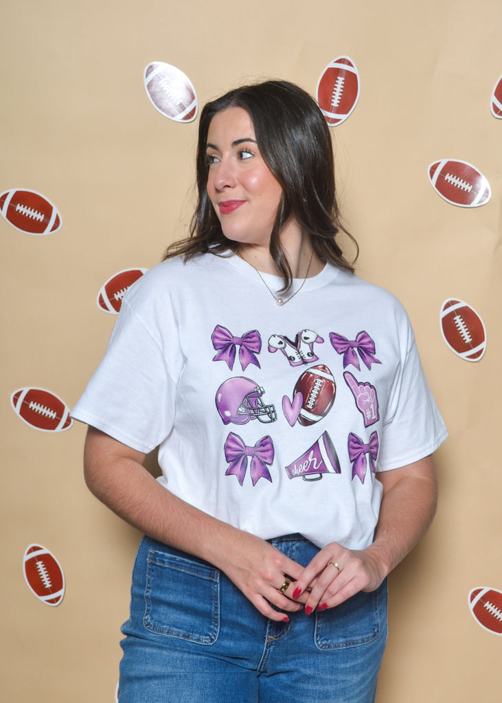Cheer on your team in style with the Spirit Squad Graphic Tee! This white t-shirt is covered in fun gameday icons—from purple bows to helmets, megaphones, and foam fingers—making it the perfect playful top for showing off your school spirit. Pair it with denim shorts, a skort, or boots for a spirited look on game day.