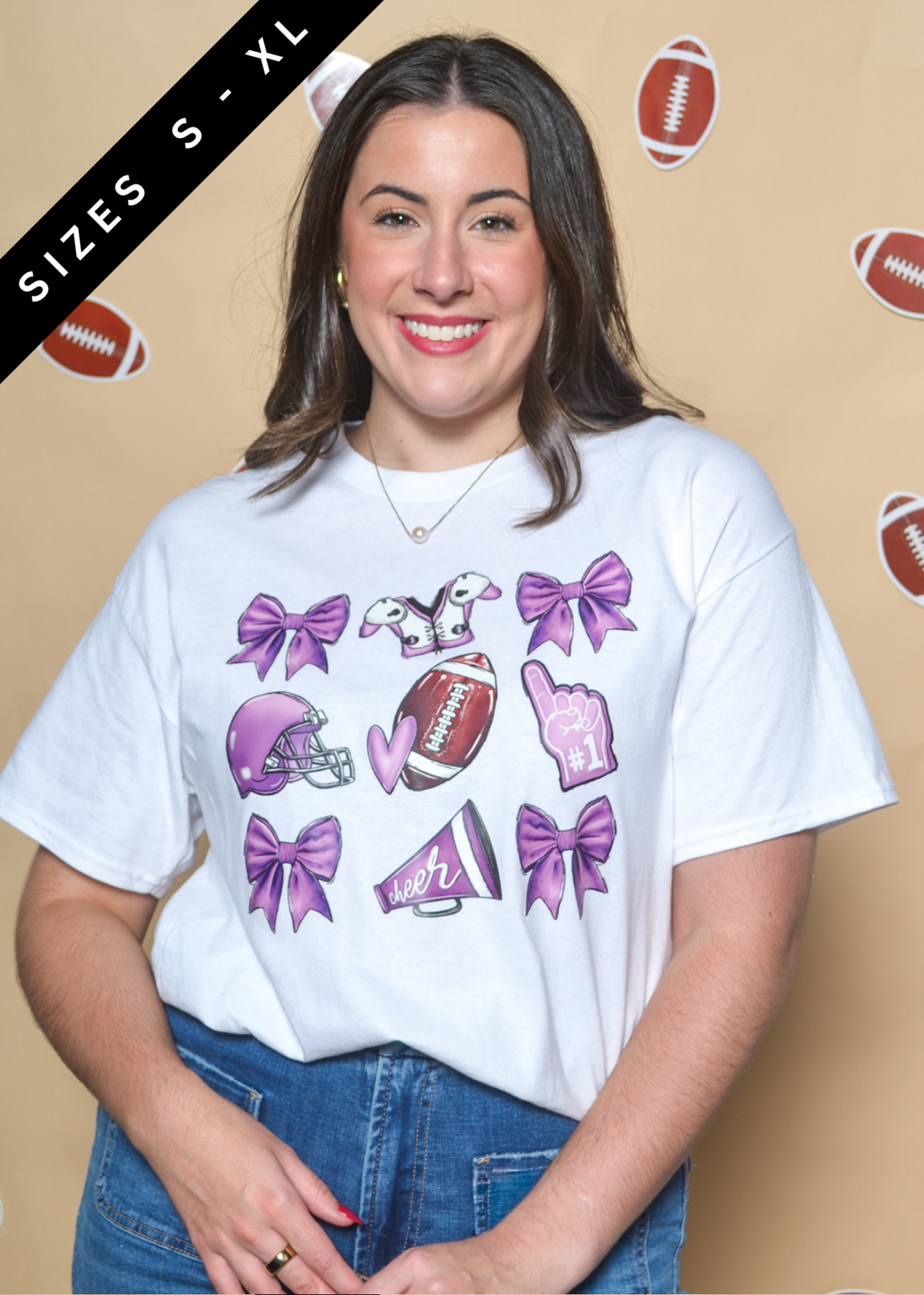 - Features purple gameday icons: bows, football, helmet, megaphone & foam finger