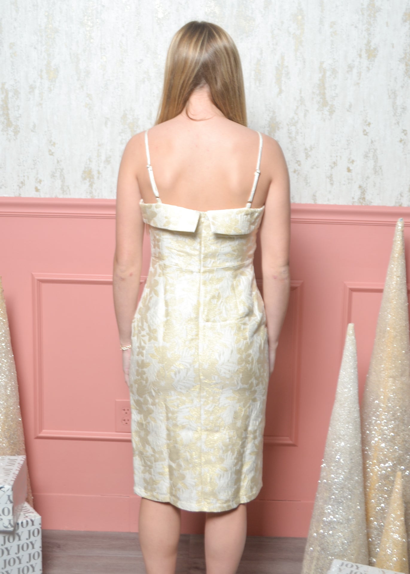 Sophisticated with a touch of shimmer — this gold jacquard midi is a showstopper for any season. The structured silhouette and side slit create an effortlessly polished look for weddings, formals, and celebrations year-round.