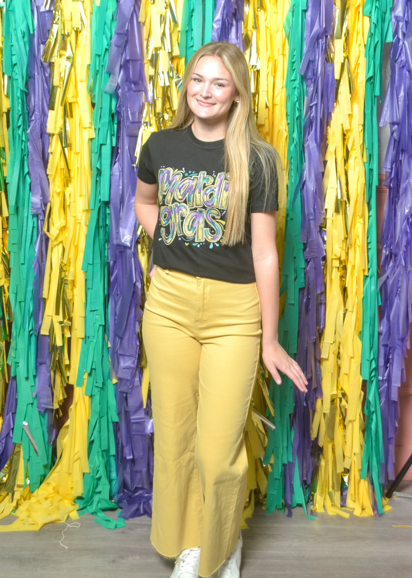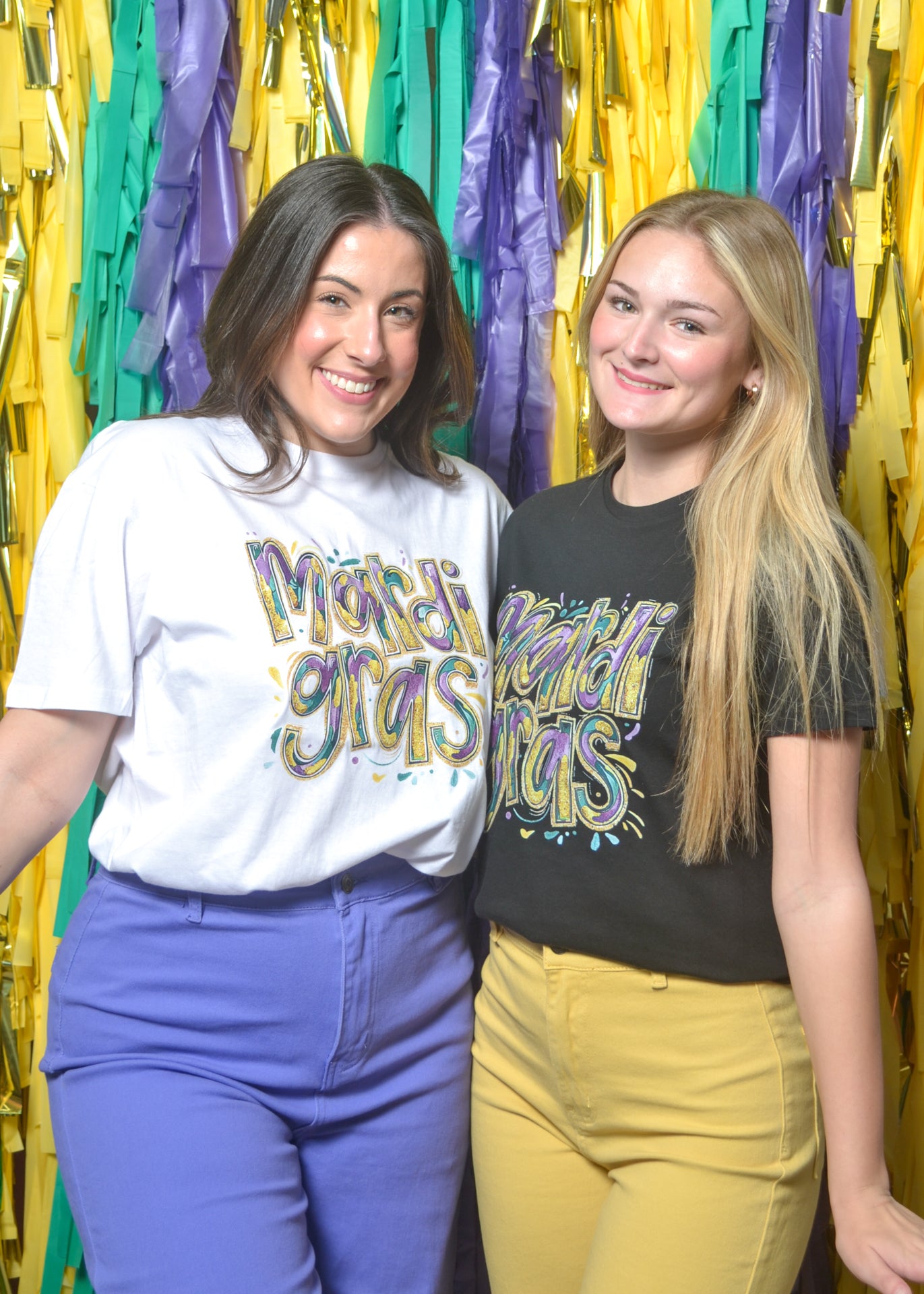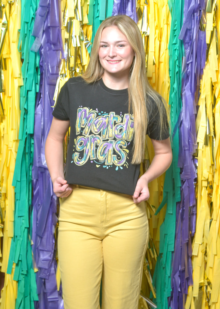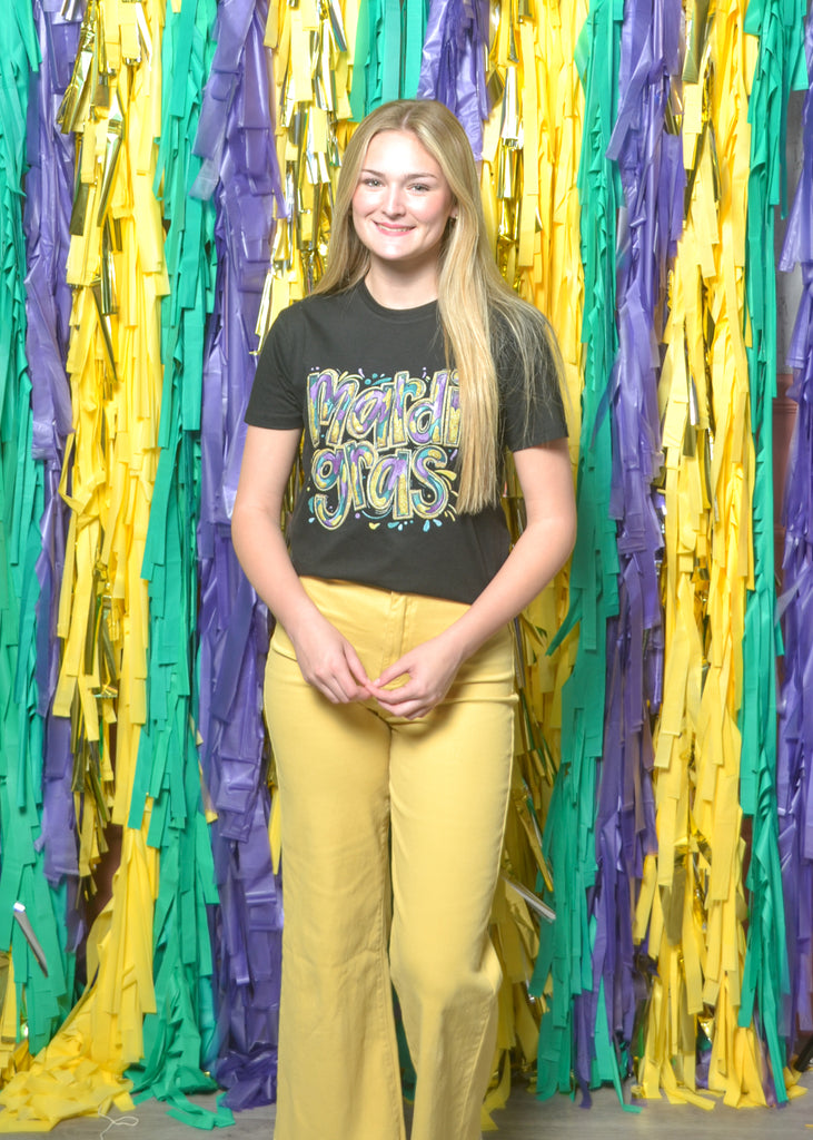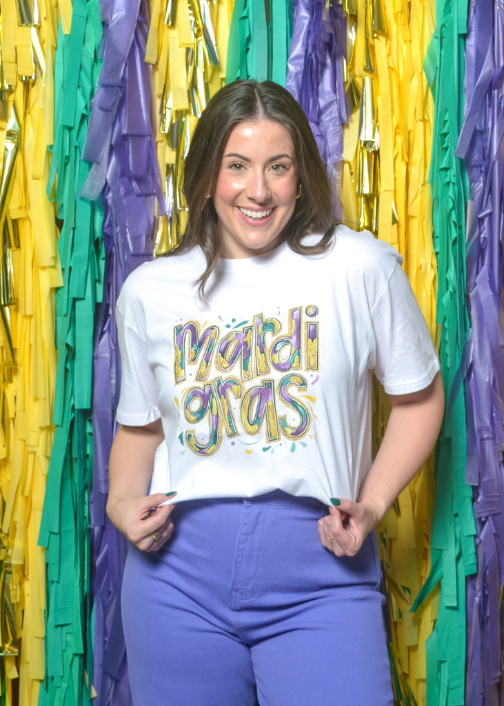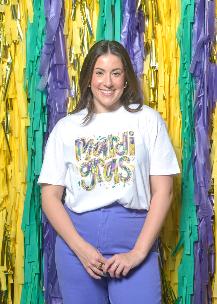 Make your outfit as fun as the parade with this colorful “Mardi Gras” graphic tee. Bright purple, gold, and green letters pop against a crisp backdrop for a look that’s both classic and bold.