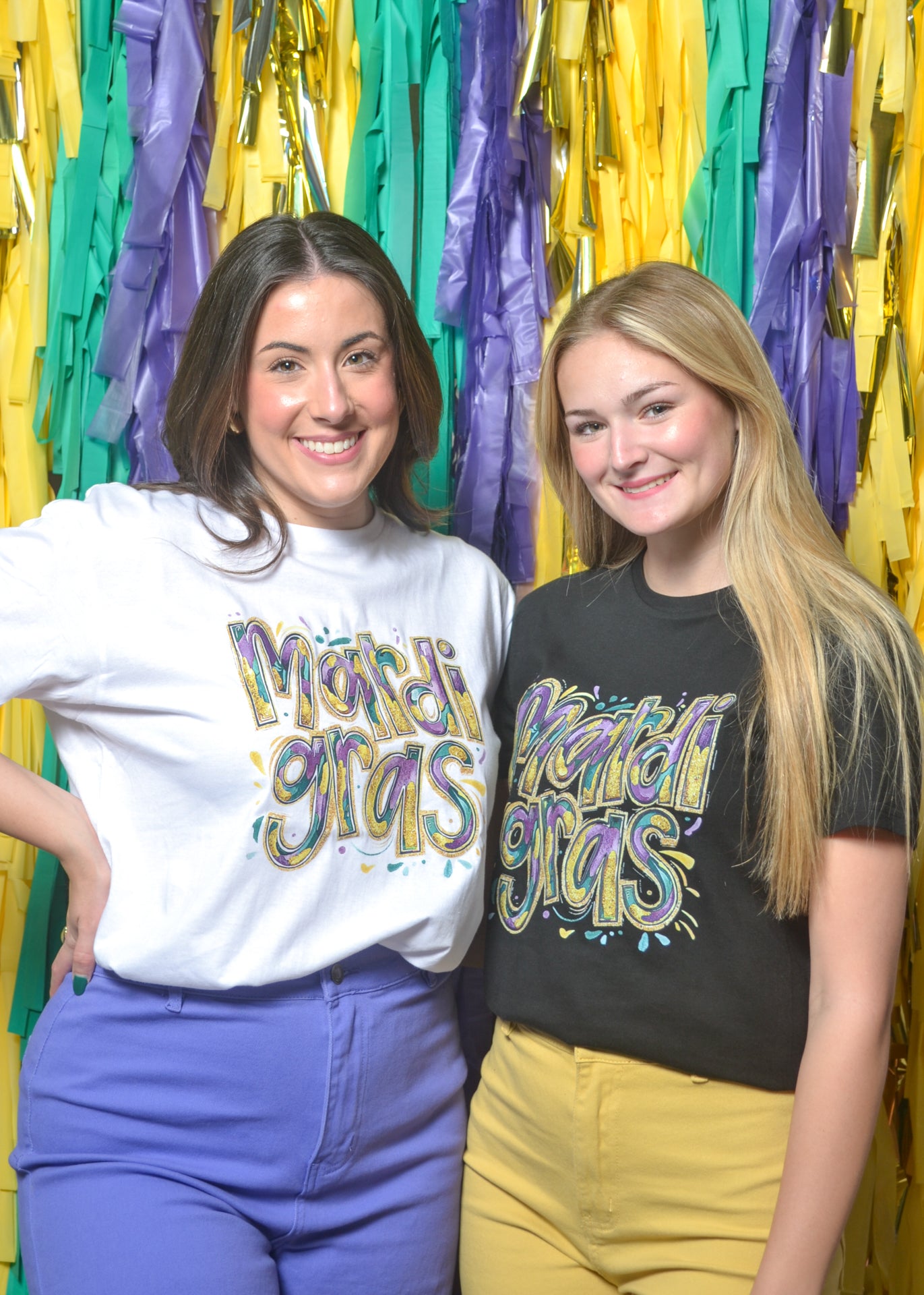 - “Mardi Gras” multicolor glitter Screenprinted design