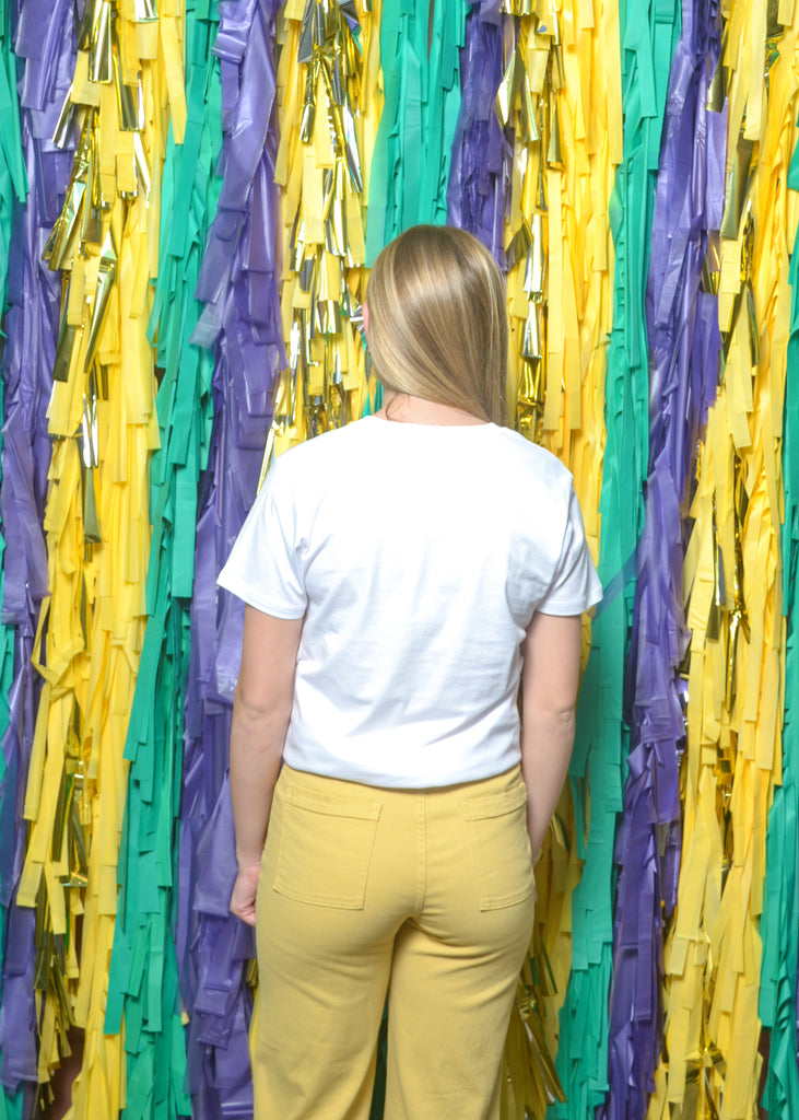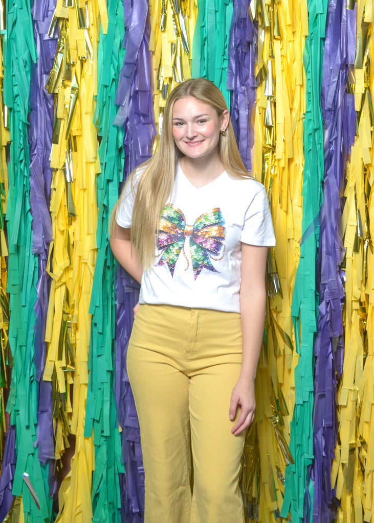 Add a feminine twist to your Mardi Gras look with this sequin-inspired bow tee! The shimmering bow graphic in classic Mardi Gras hues brings just the right amount of sparkle to your day.
