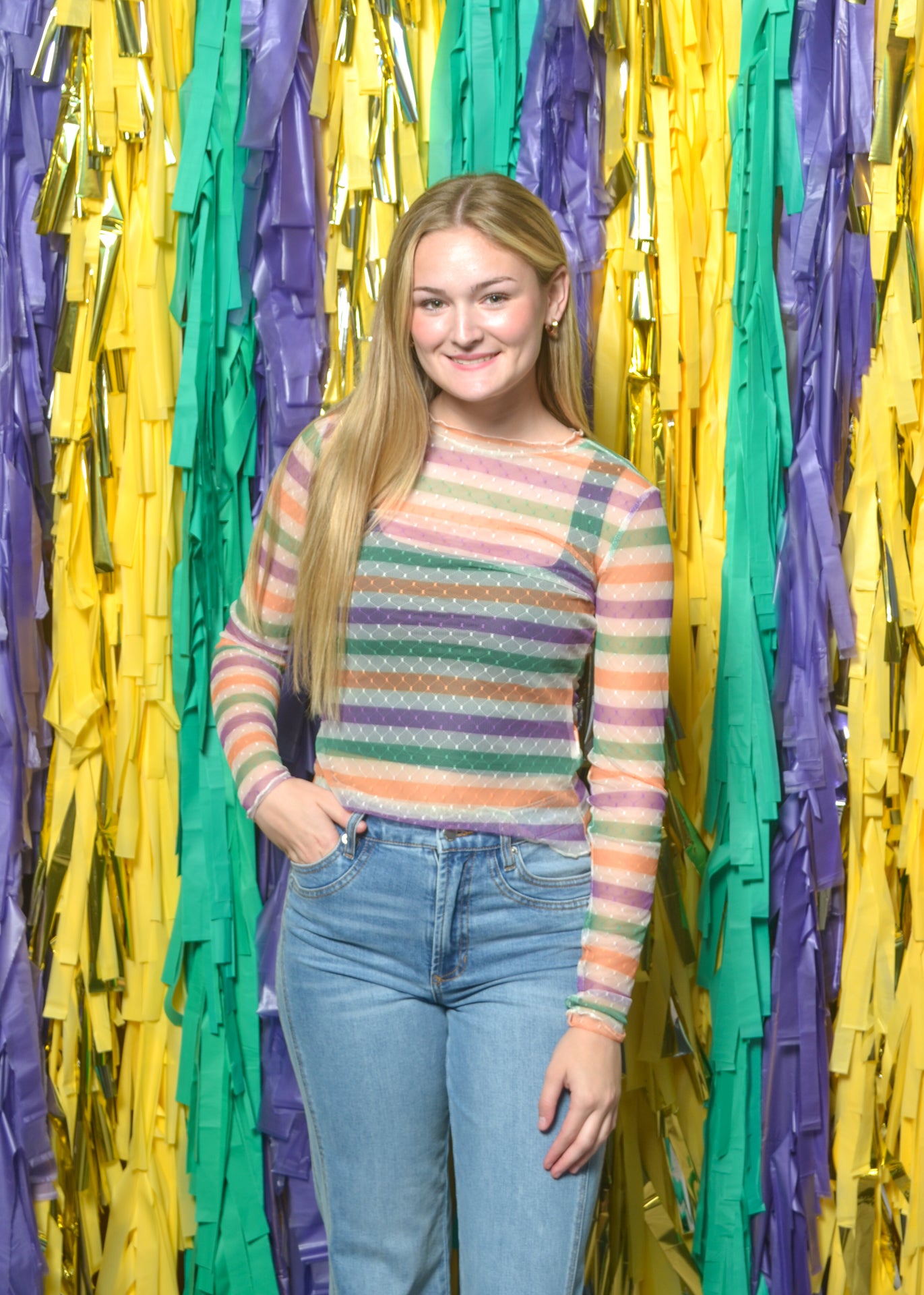 Bring the festive vibes anywhere you go with this colorful mesh long sleeve! The Carnival Stripes Mesh Top features sheer fabric with playful purple, green, and gold stripes — the perfect layering piece for parade season and party outfits.
