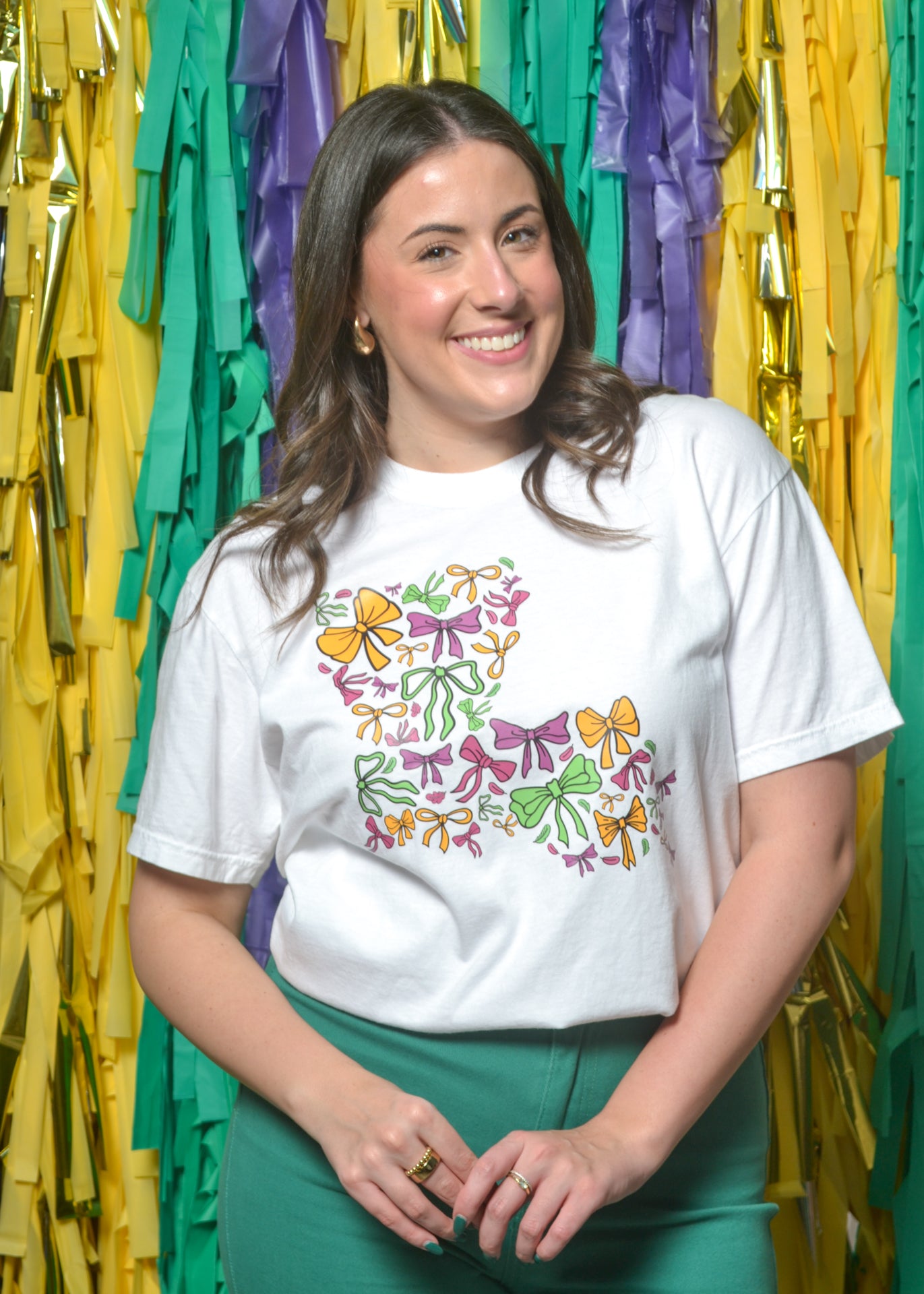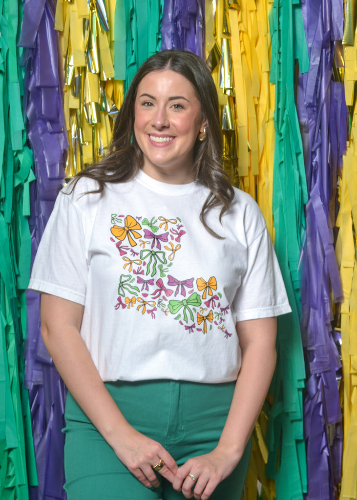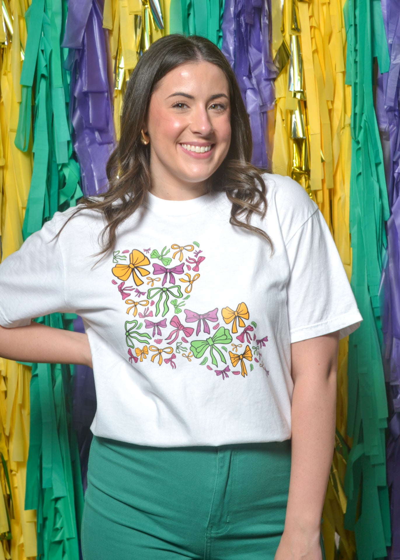 Show your state pride with the Louisiana Bow Map Tee! The Louisiana outline is filled with colorful Mardi Gras bows for the cutest parade-ready look.