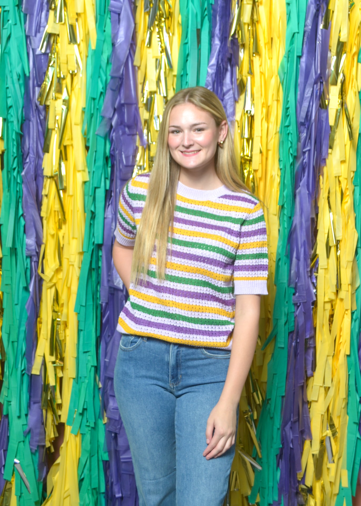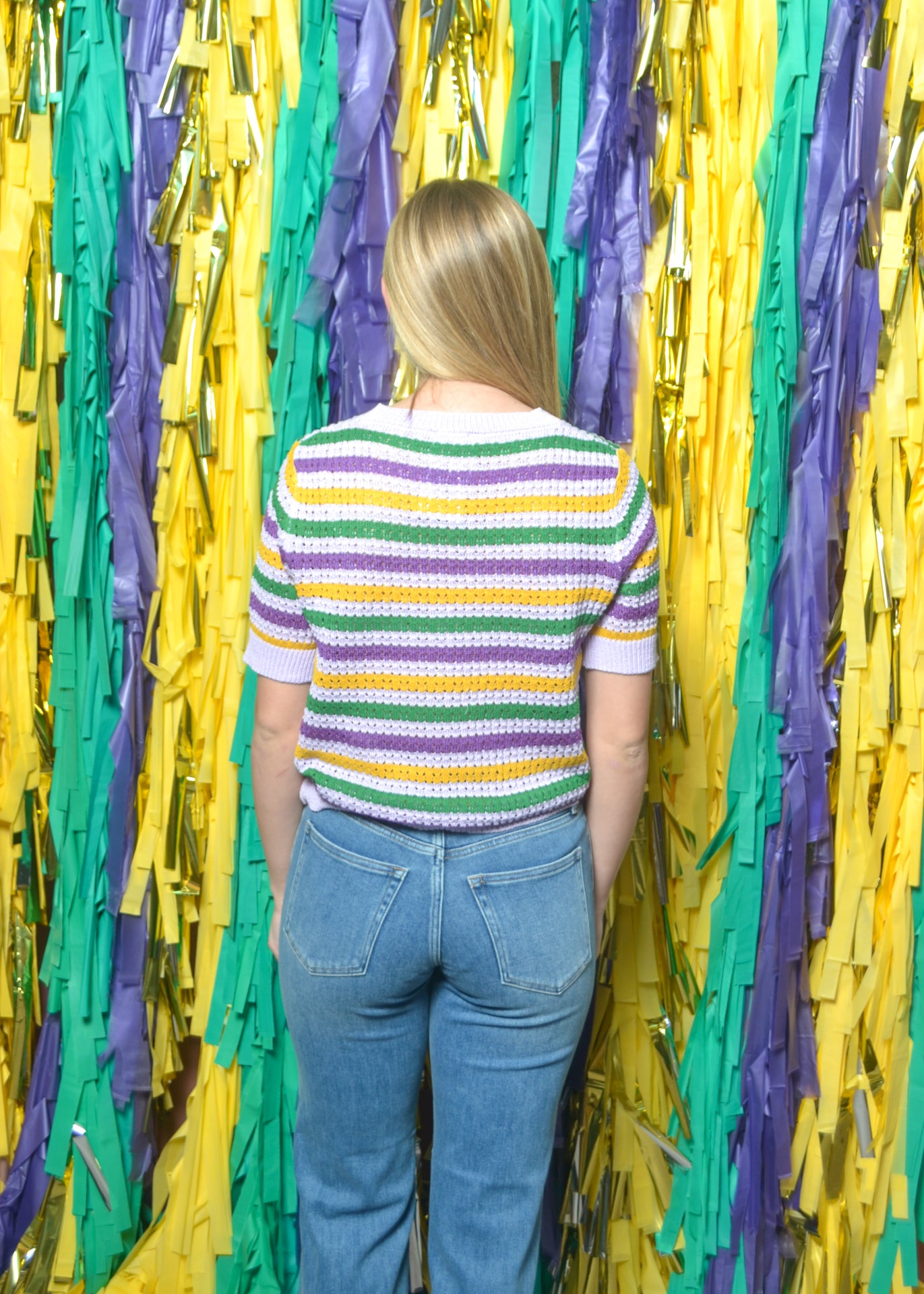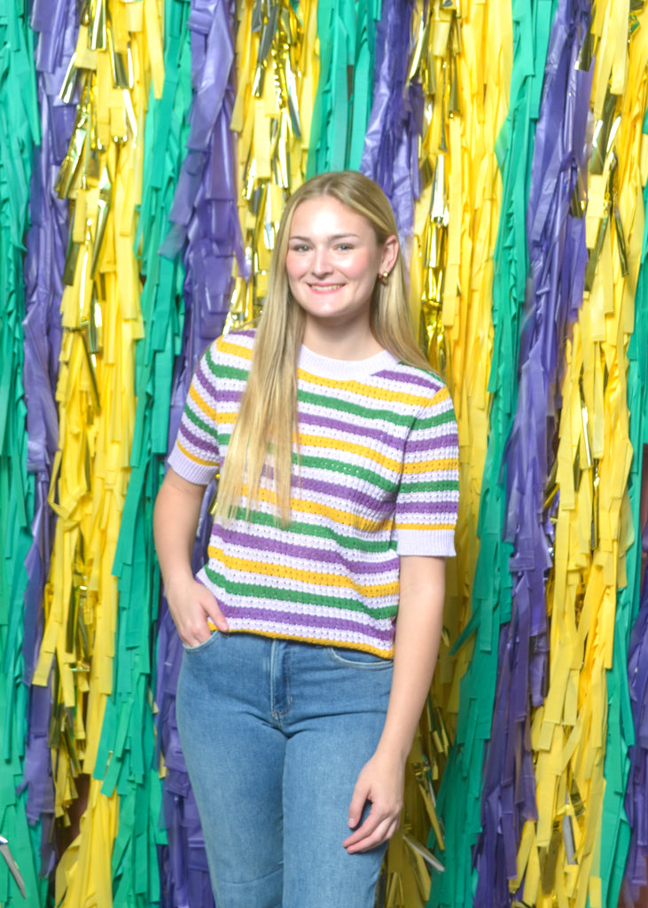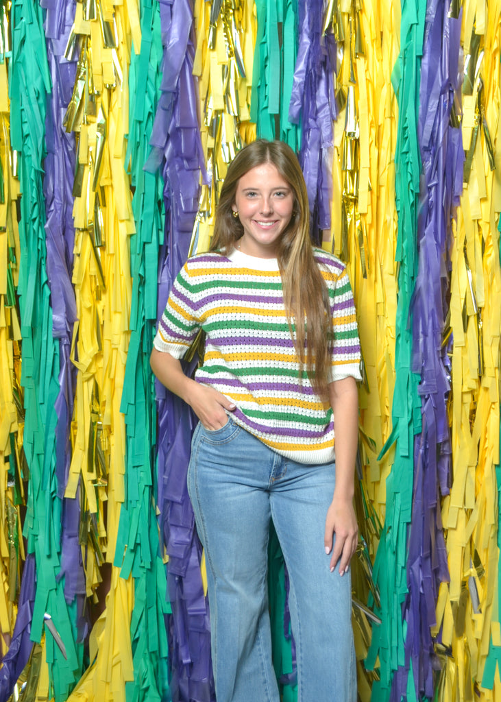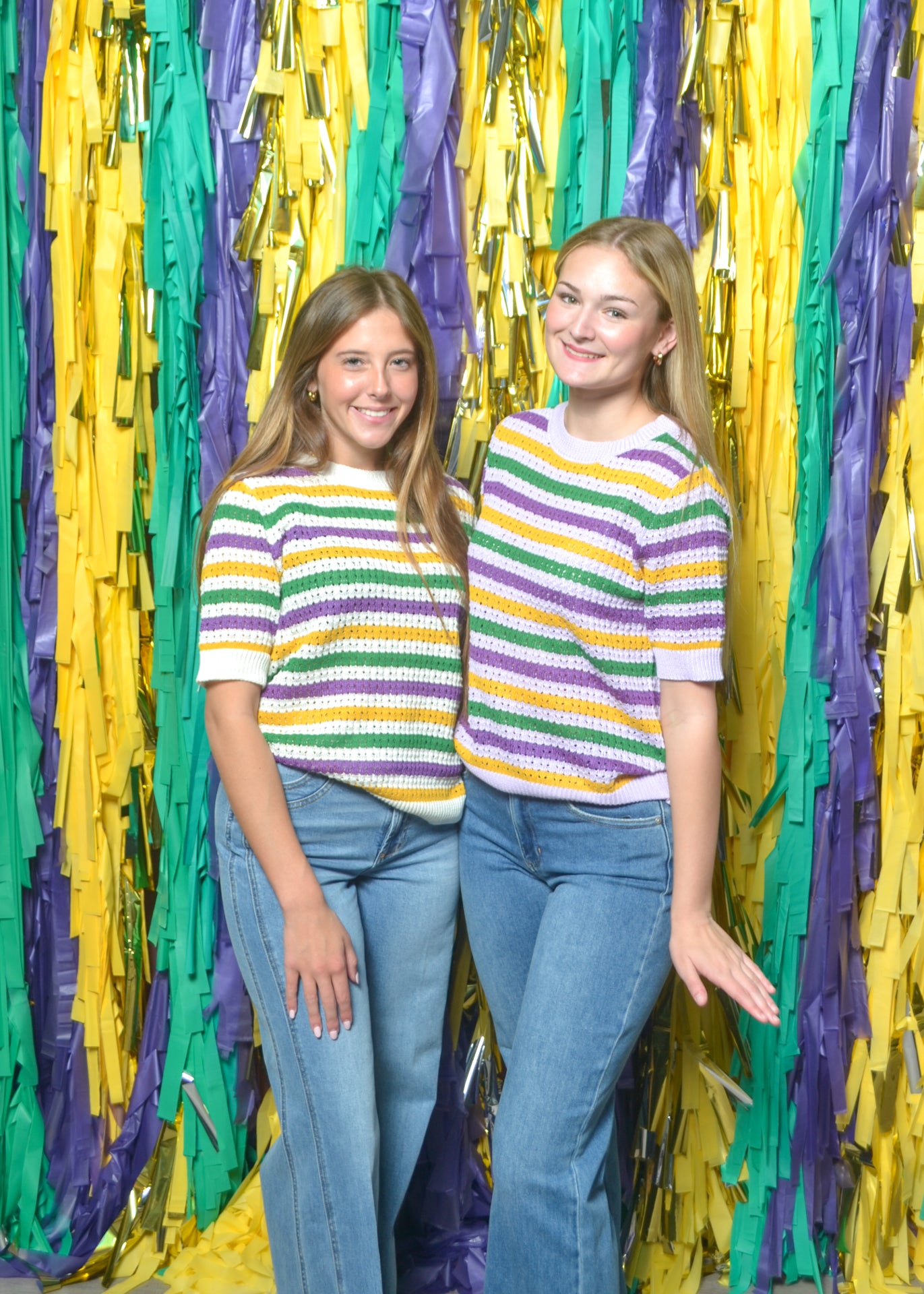 Celebrate the season in effortless style with our Mardi Gras Stripe Knit Top. This lightweight short-sleeve sweater features classic purple, gold, and green stripes with a breathable open-knit texture—perfect for Louisiana’s warm winter and early spring weather. Whether you’re headed to a parade or dressing for a festive office day, this top adds the perfect pop of carnival color.